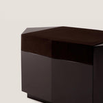 A sculptural side table that combines industrial precision with tactile luxury. The brushed steel body is contrasted by a panel upholstered in deep black cowhide leather, creating a dialogue between strength and softness. With its sleek silhouette and refined materials, this piece functions both as a practical surface and as a collectible design object.