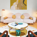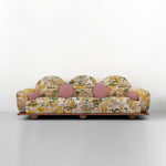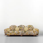 BEICE is a 3 seater sofa designed to mimic the feeling of sitting on cotton candy clouds. The combination of its lime patterned upholstery, arc shaped back rests, round edges and sphere walnut feet creates a dreamy, tender design. It is wide enough to lay down and soft enough to sleep on. BEICE is entirely hand-crafted, the base and feet are constructed from solid walnut and upholstery. Beice Sofa can be customized upon request.