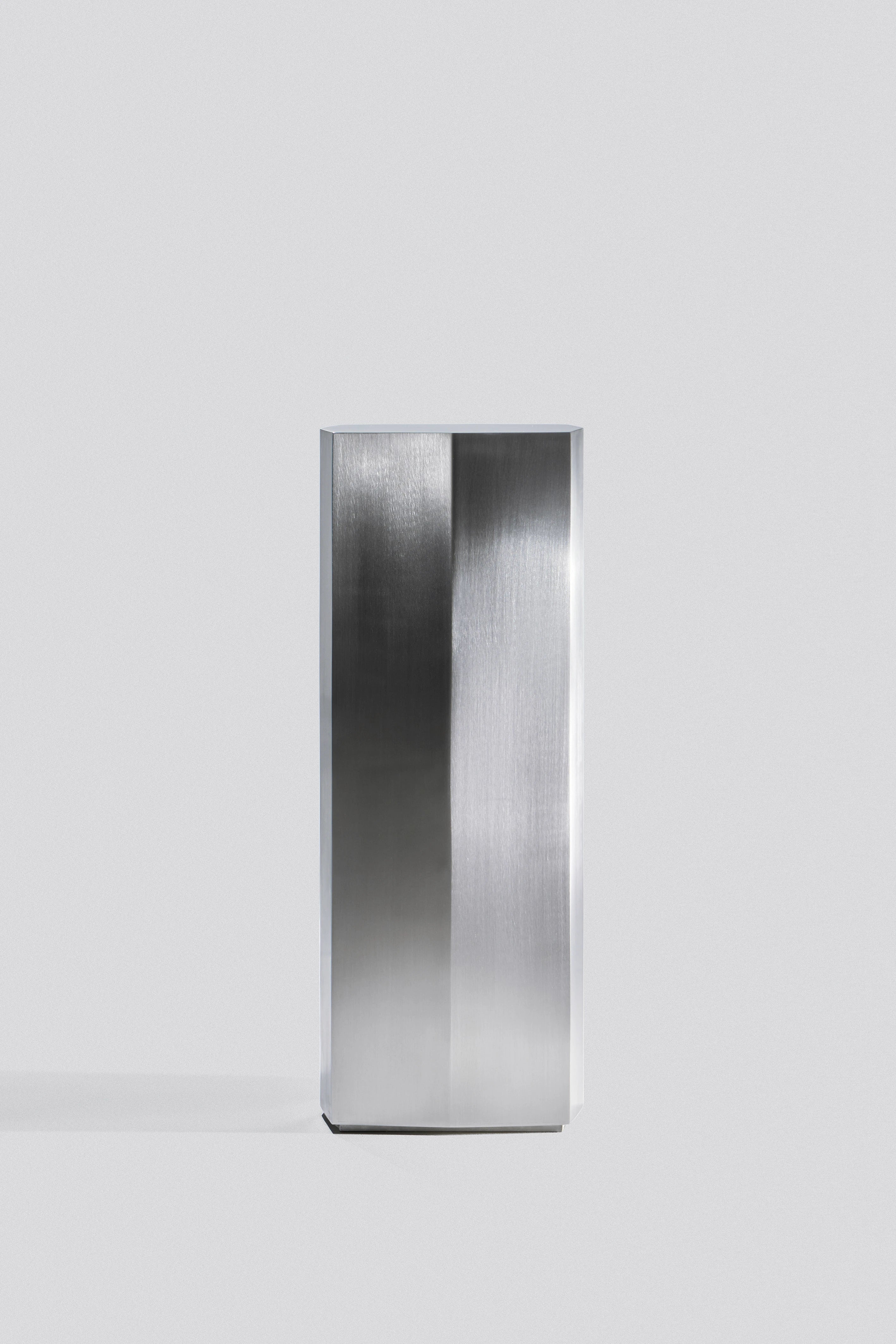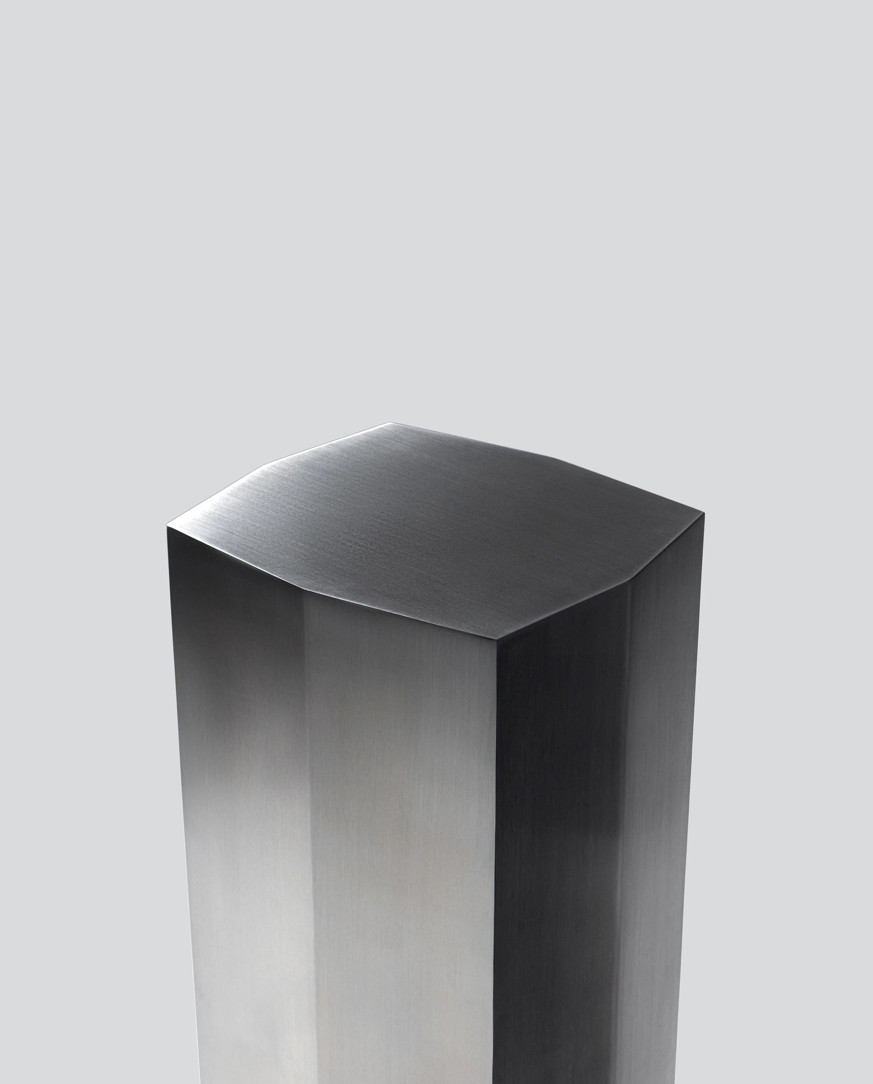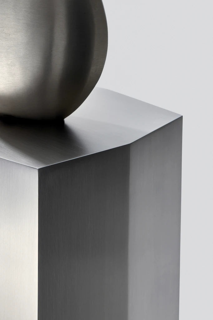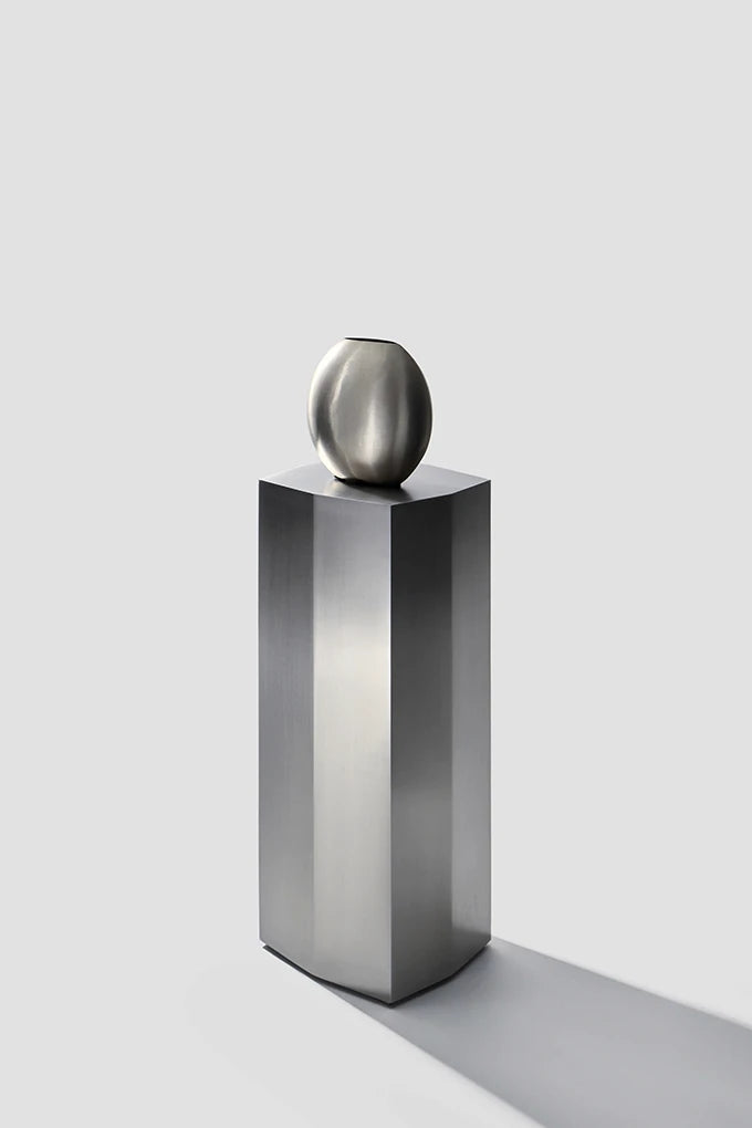 Crafted in brushed steel, Ame II is a sleek pedestal that embodies minimalist elegance and structural strength. Its clean lines and reflective surface make it a versatile design piece, ideal for displaying art objects, floral compositions, or standing alone as a sculptural accent.
