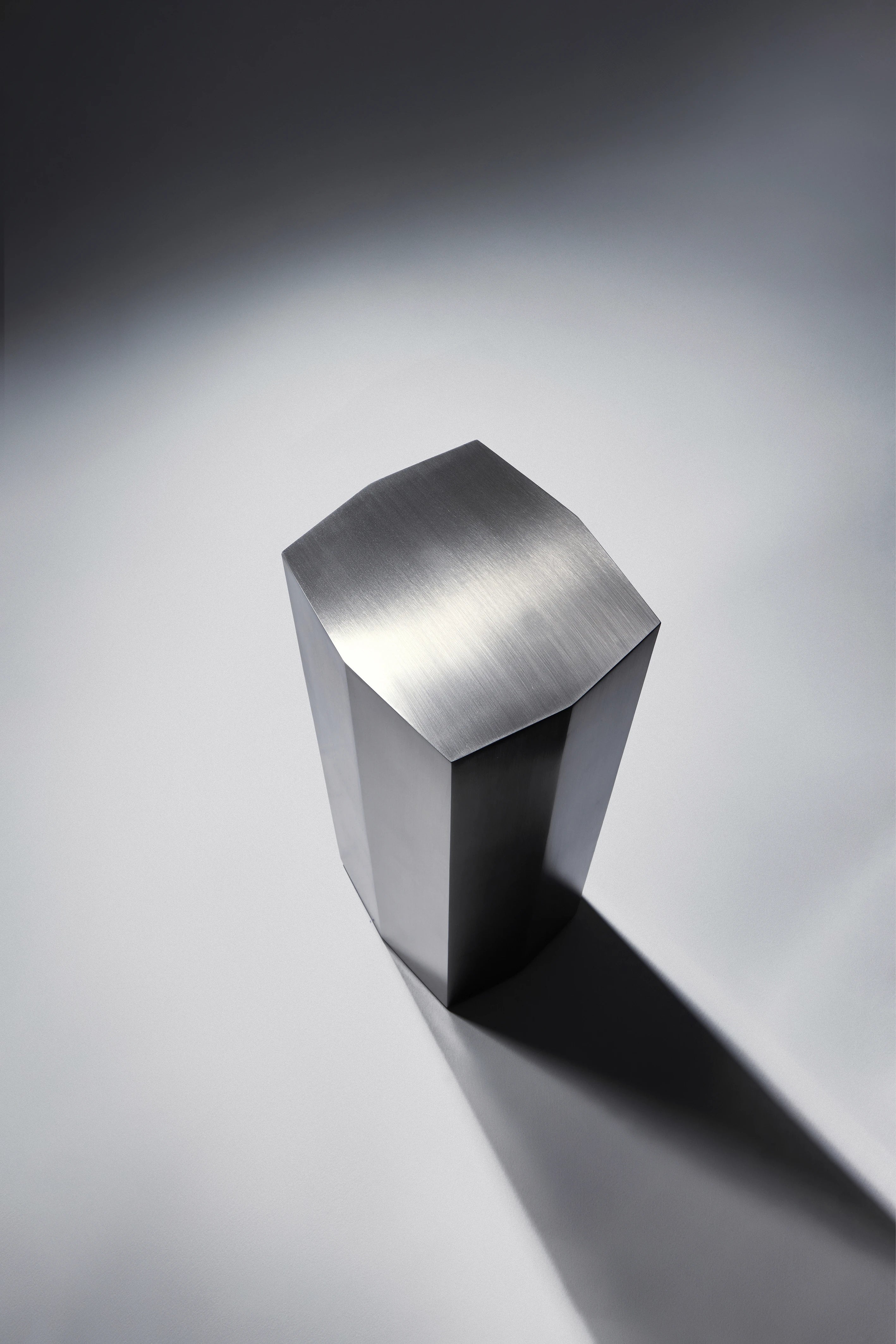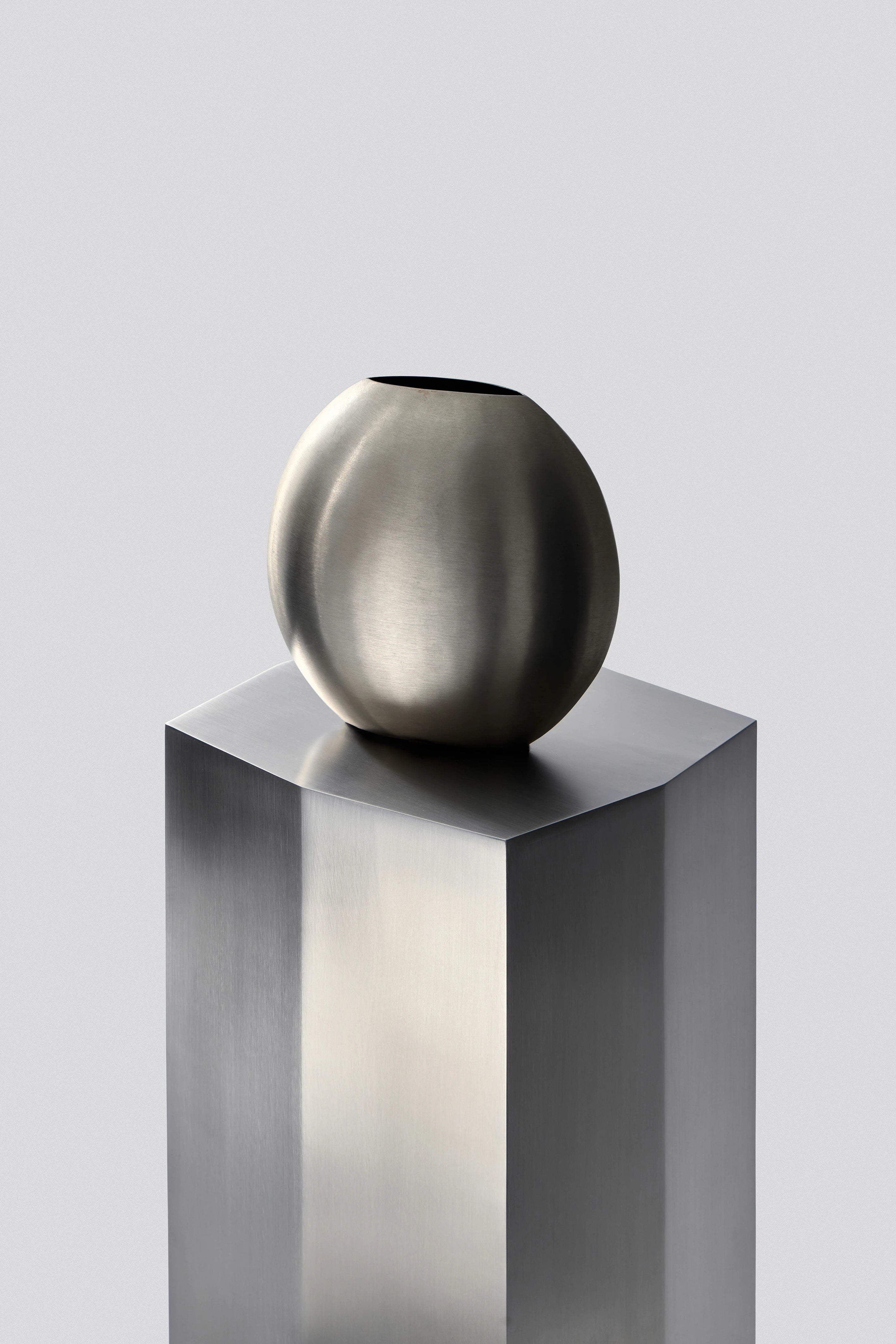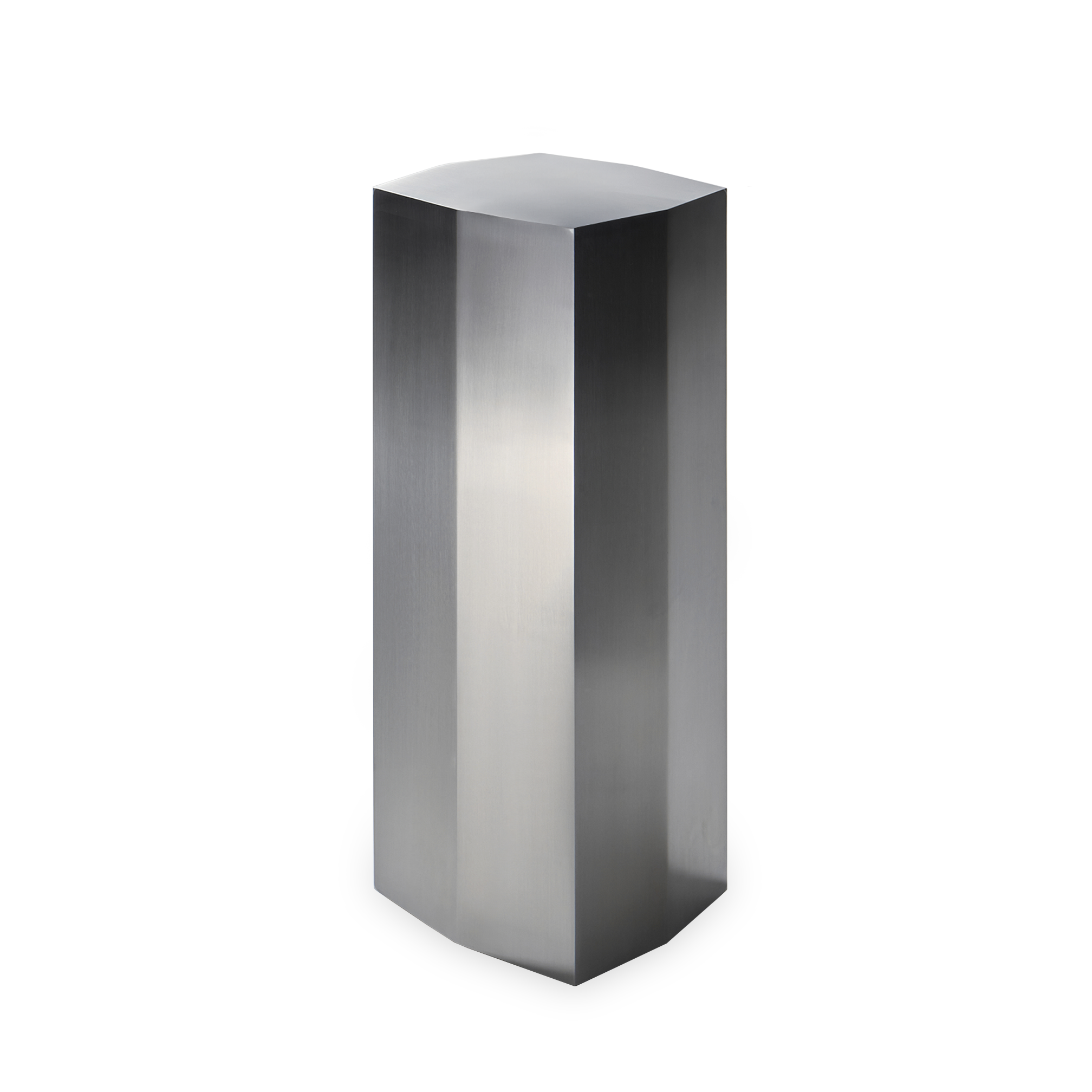 Crafted in brushed steel, Ame II is a sleek pedestal that embodies minimalist elegance and structural strength. Its clean lines and reflective surface make it a versatile design piece, ideal for displaying art objects, floral compositions, or standing alone as a sculptural accent.