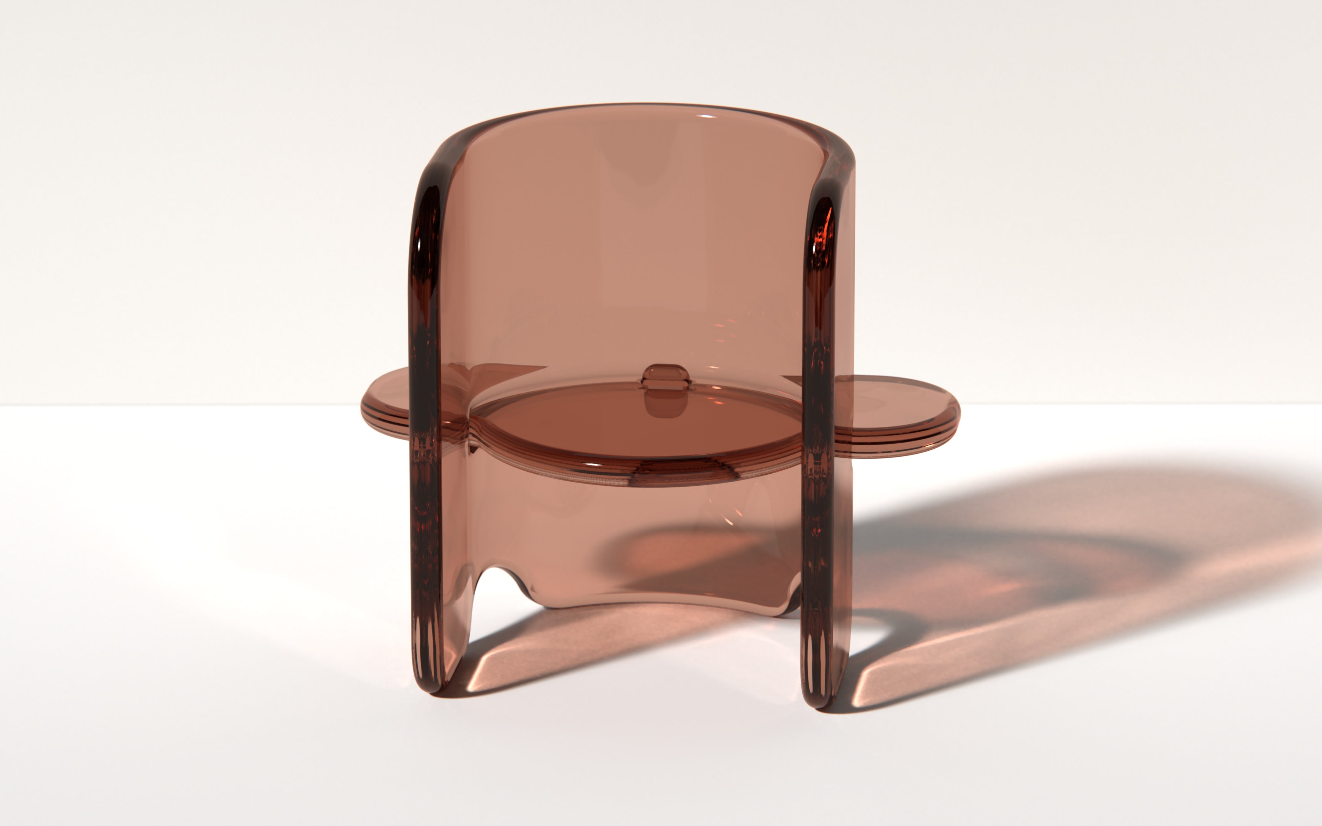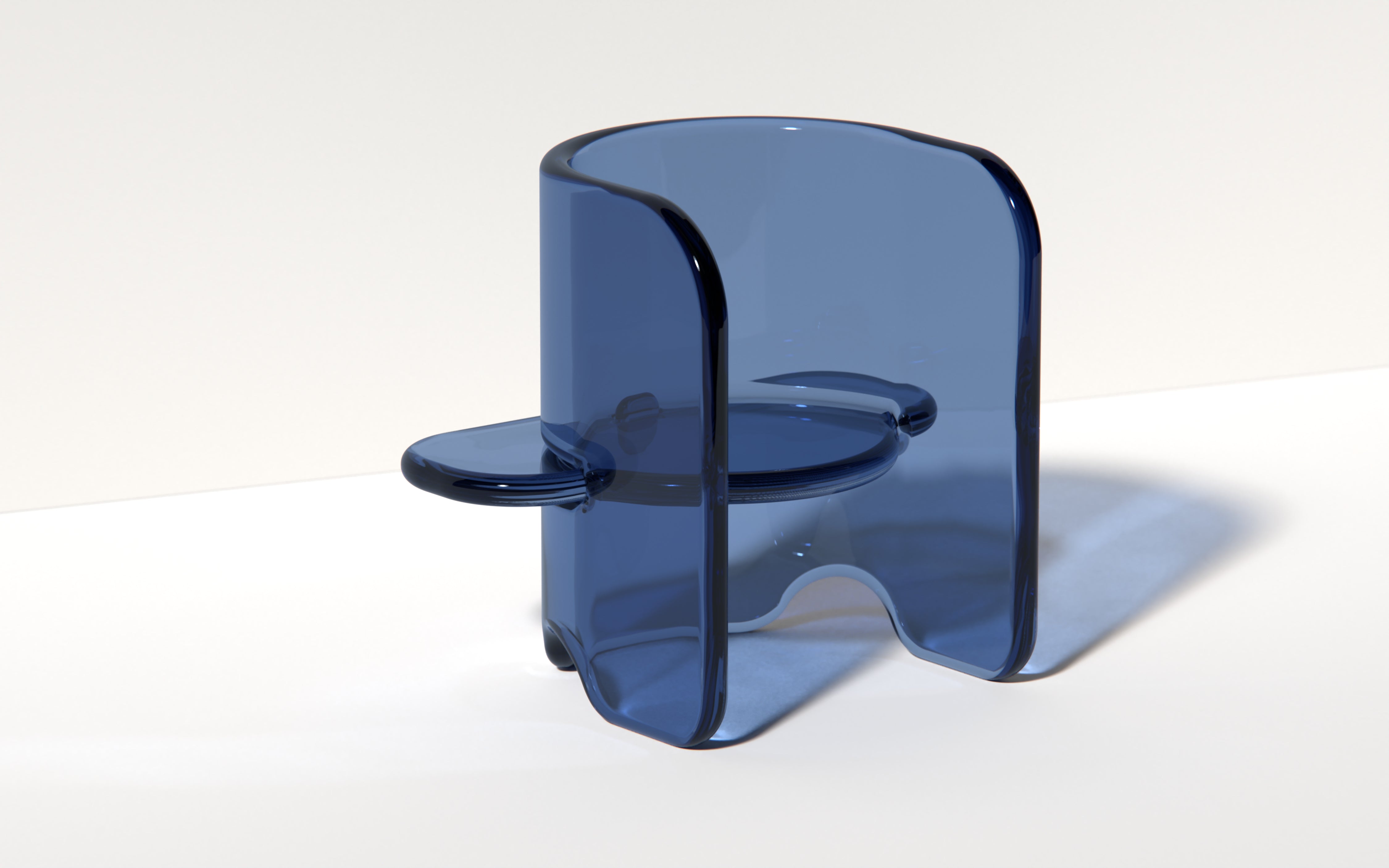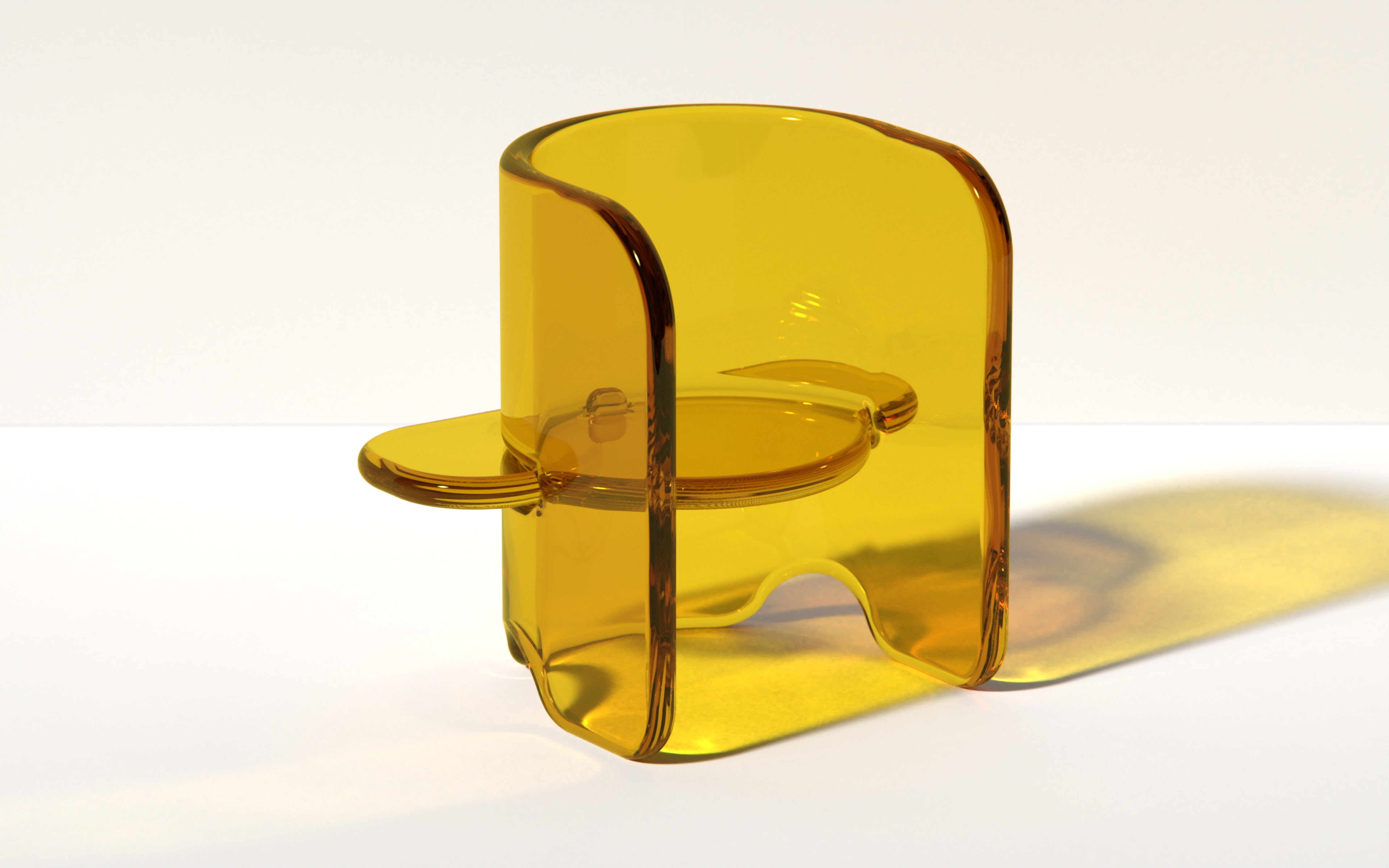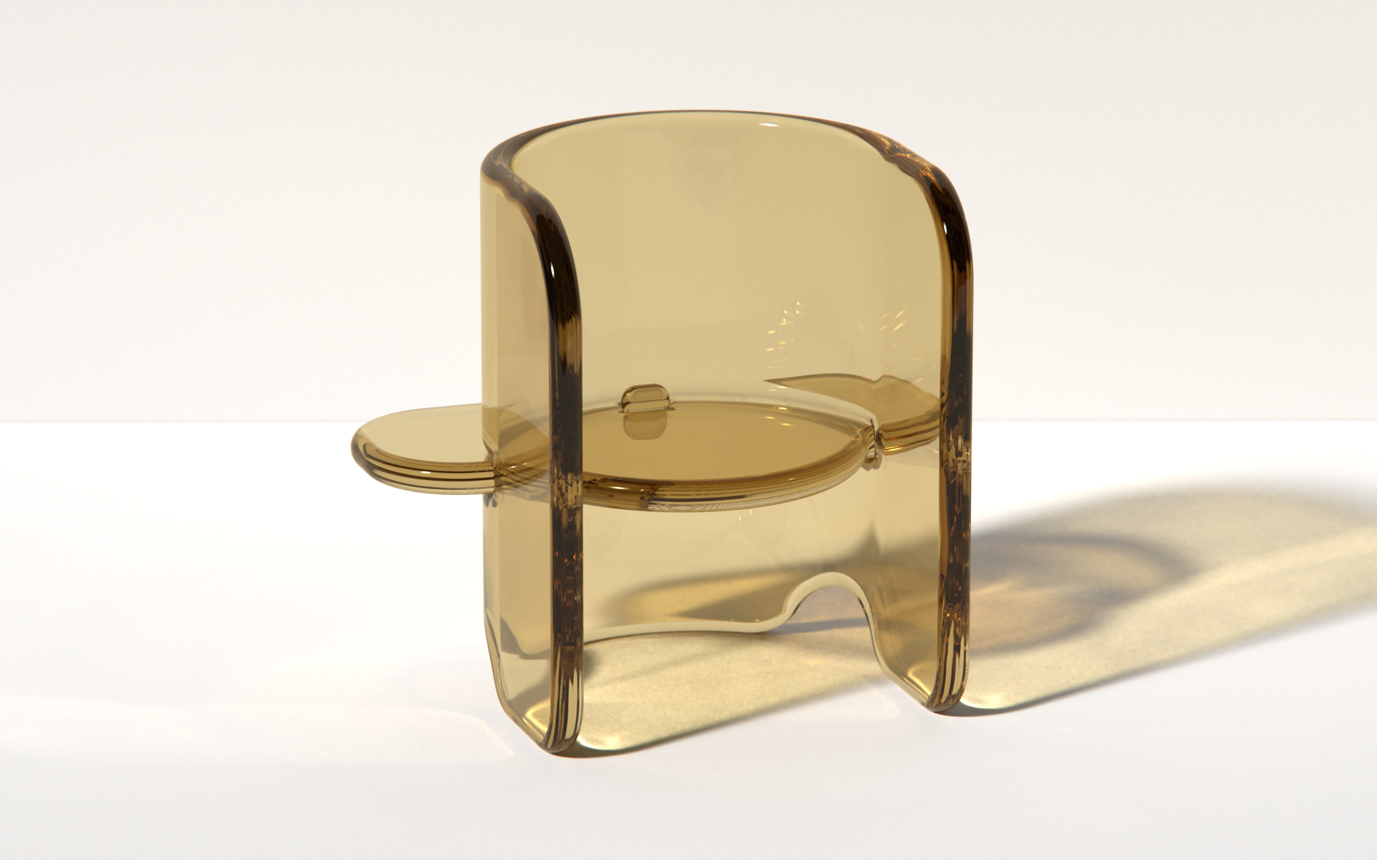 A continuation of the Plump series of sculptural furniture. The shapes play upon the effect that resin has as light is refracted through the solid parts. The chair is only held together through notches at each joint. There are no glues or fasteners.