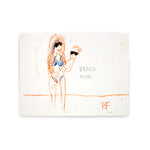 Beach Mom is a watercolor and ink piece in which Fisher a mother and son on the beach, both in matching black sunglasses.