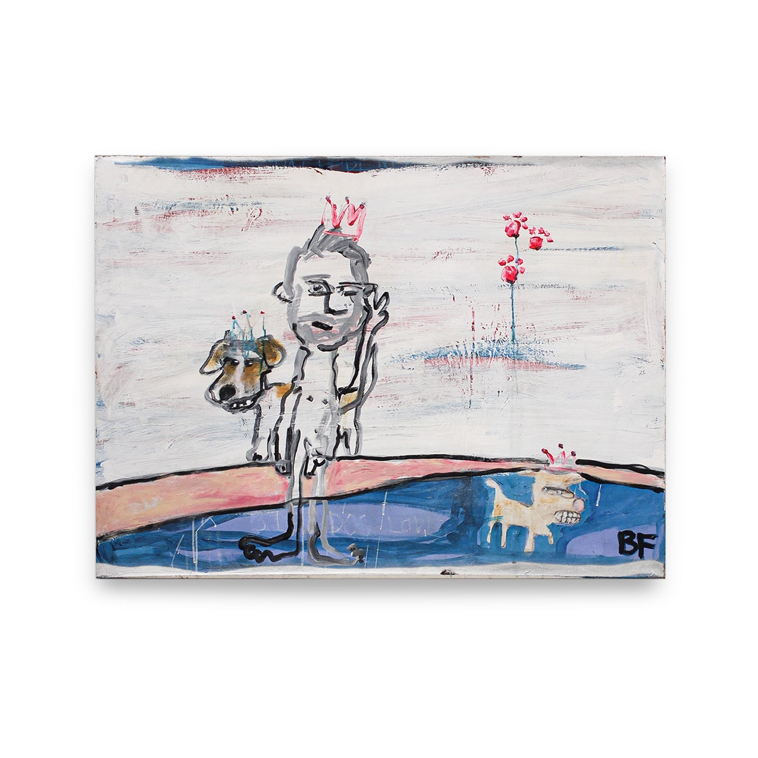 The textured rough wash in the background of The Three Princes contrasts the smooth brush strokes outlining the eponymous subjects of the painting. There are clear layers to this piece, obscuring the text that appears in the top and bottom of the canvas.