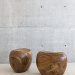 Subtle seating: Master woodworkers carve an ergonomic seat on the top of sculpturally rich chunks of solid woods. Each piece highlights the unique qualities of its material and highlights the natural grain of the wood.