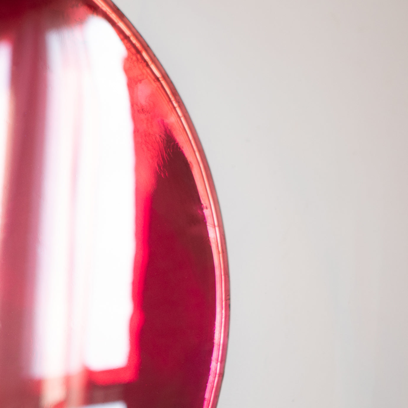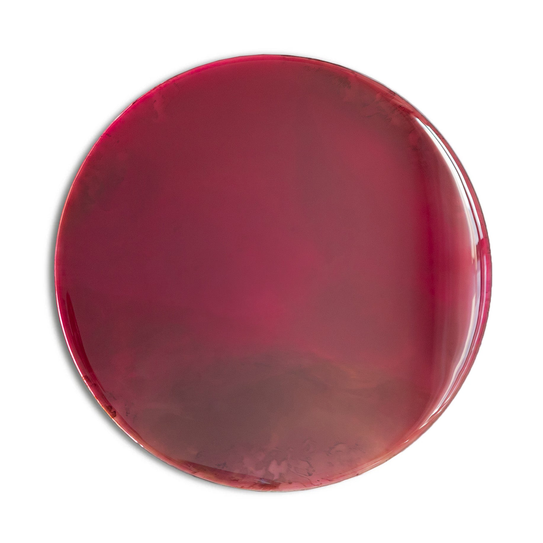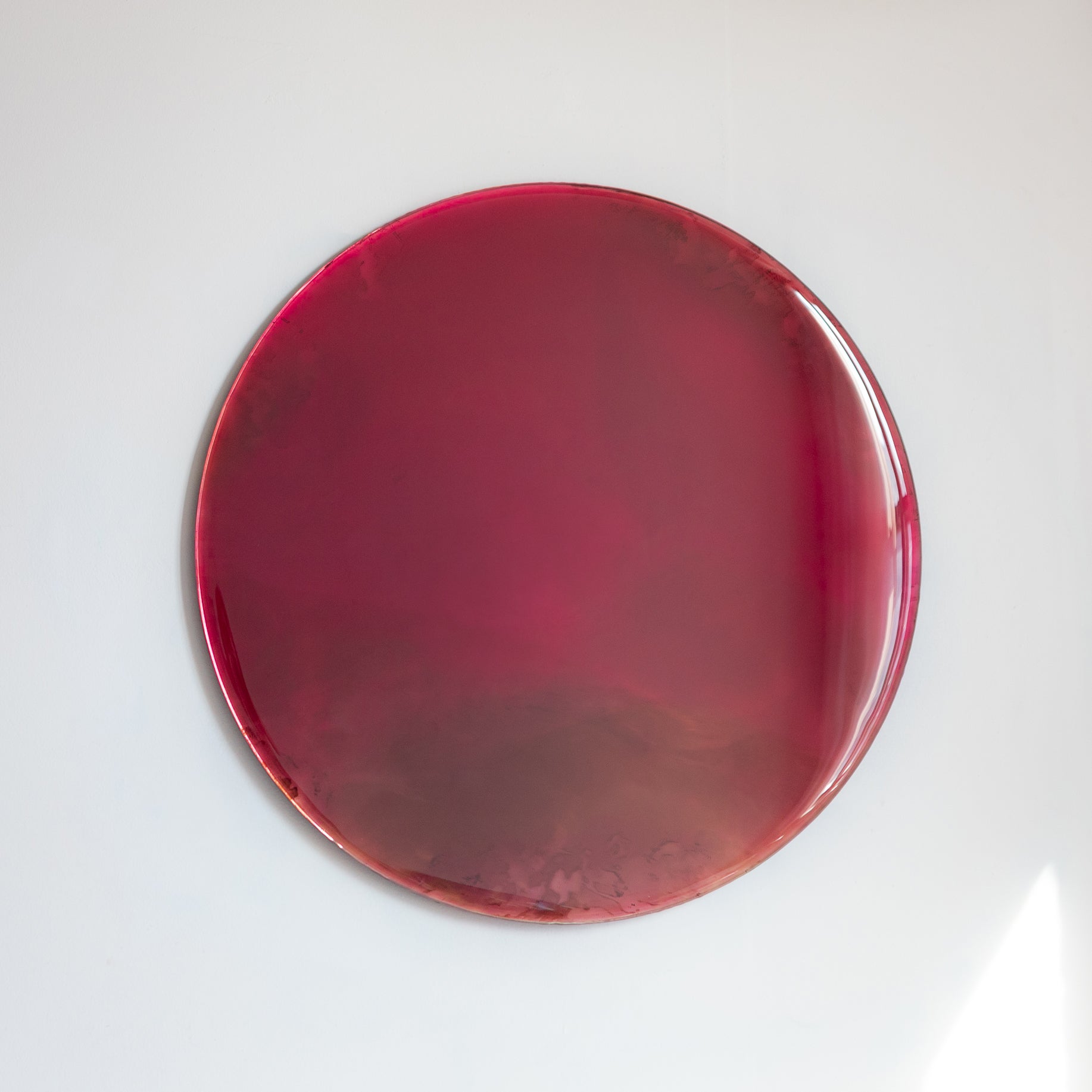 These functional art pieces build a color story through multiple layers of translucent tinted resin over a mirrored glass base. Throughout the day as the light changes, their vibrant hues shift in color and tone - kaleidoscopic portals offering new perspectives each time you view them. Courtney considers this her signature series and has been developing the technique for over two years.