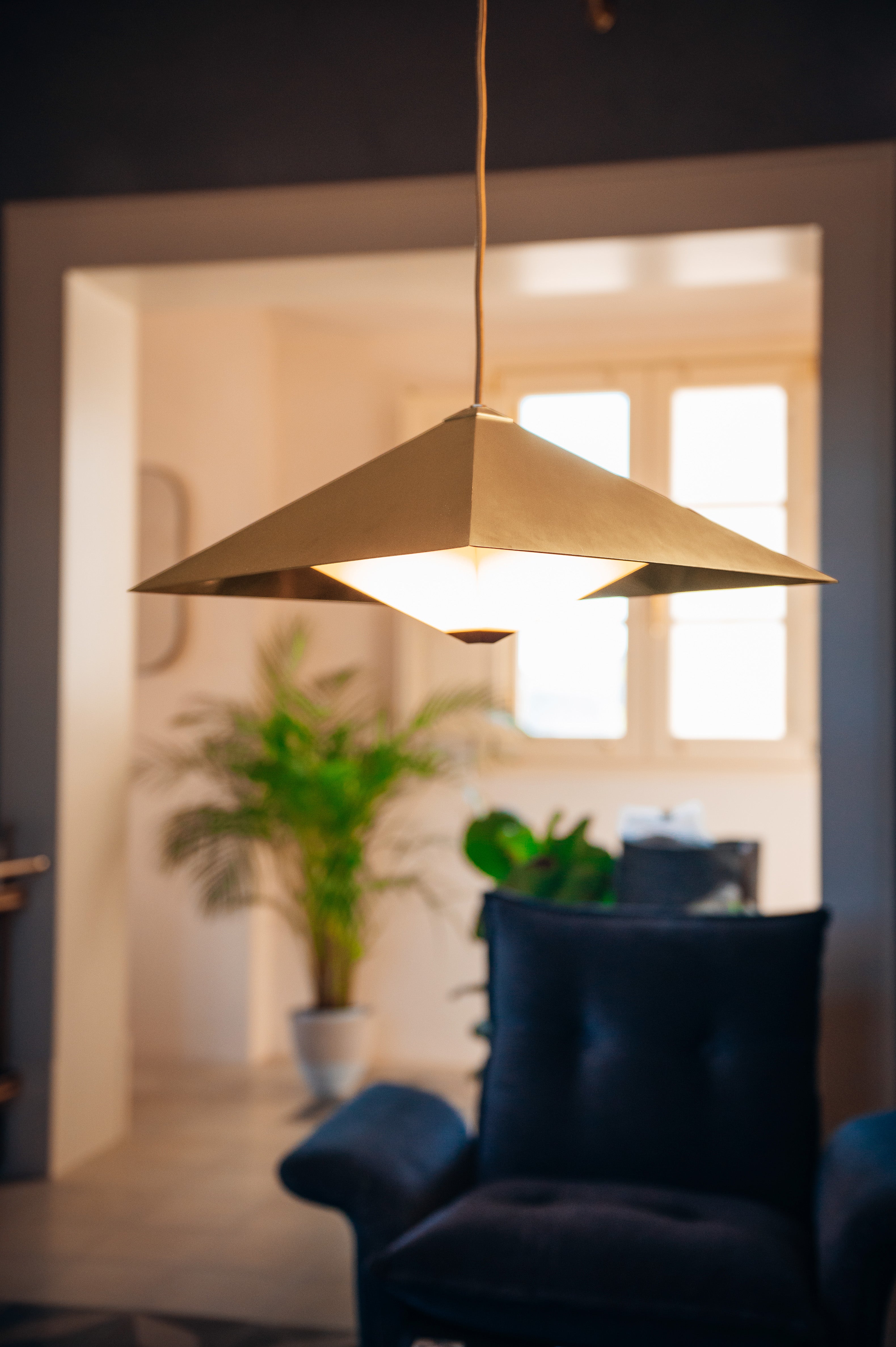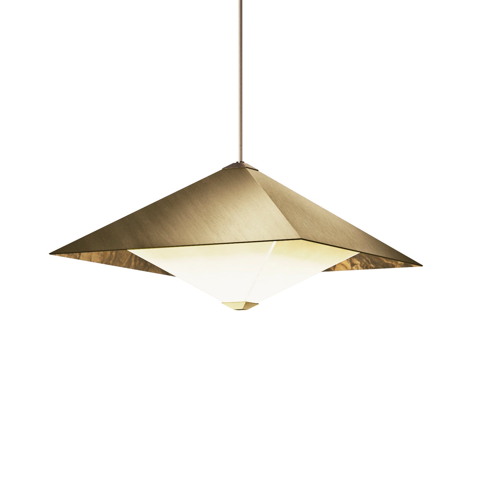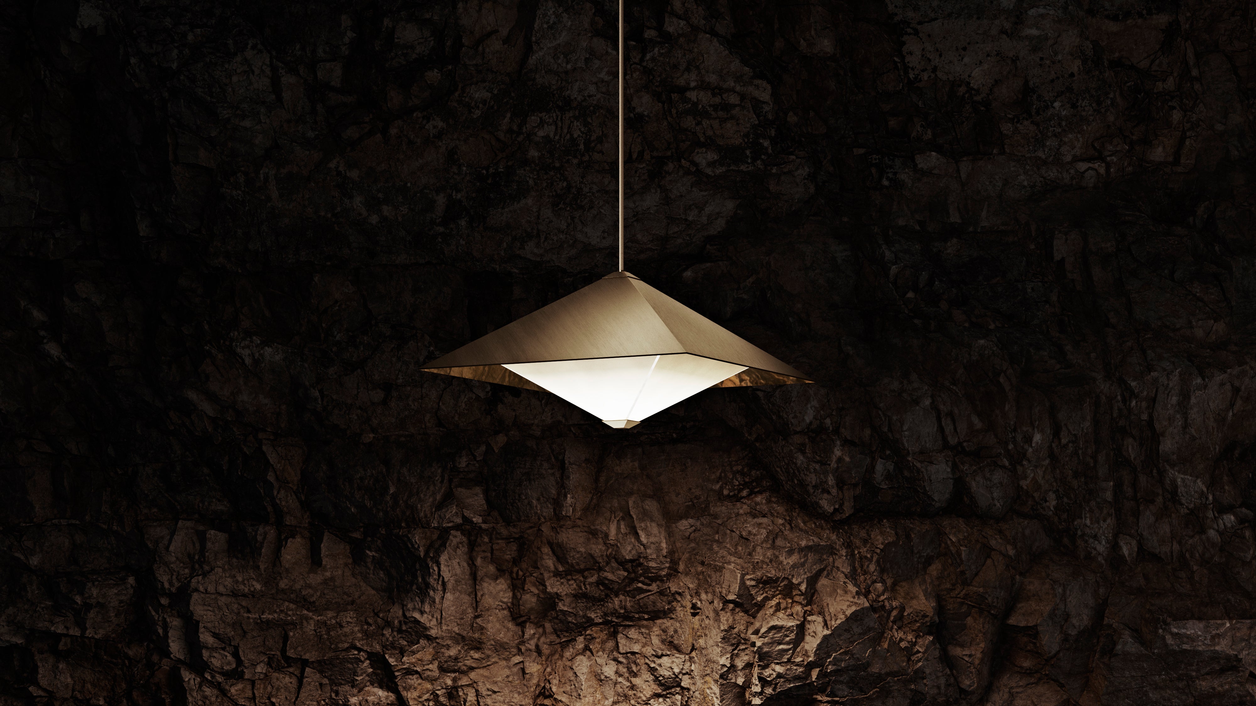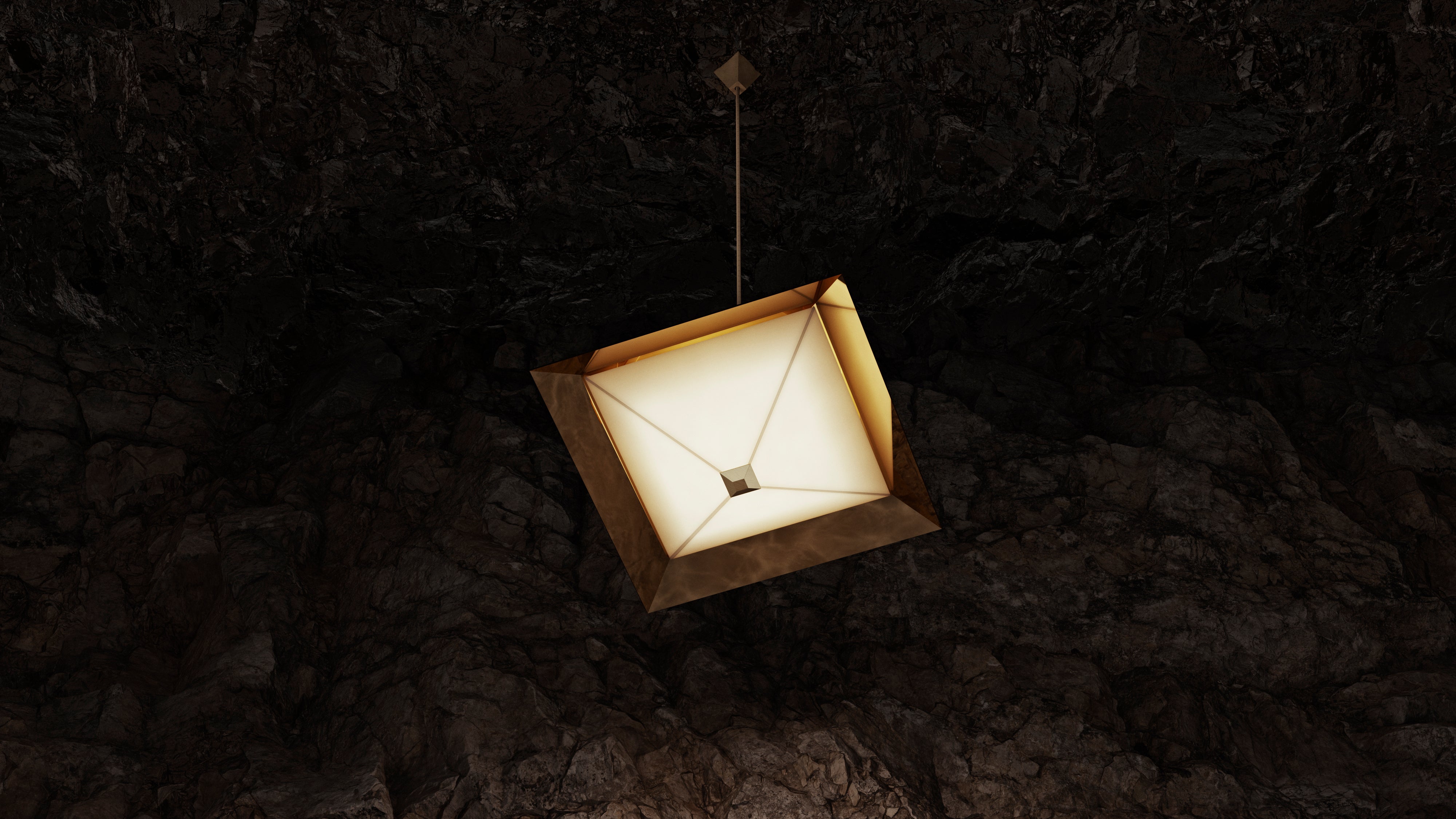 OCTA’s pendant originates from the intersection of two octahedral shapes. A brass shade and a frosted diffuser. The latter floats below the mirrored surfaces of the shade; shapes are reflected and multiplied, displaying a unique optical illusion. Concealed beneath the translucent surface, the integrated LED source emits a distributed warm glow, setting an intimate atmosphere for dining or living spaces.