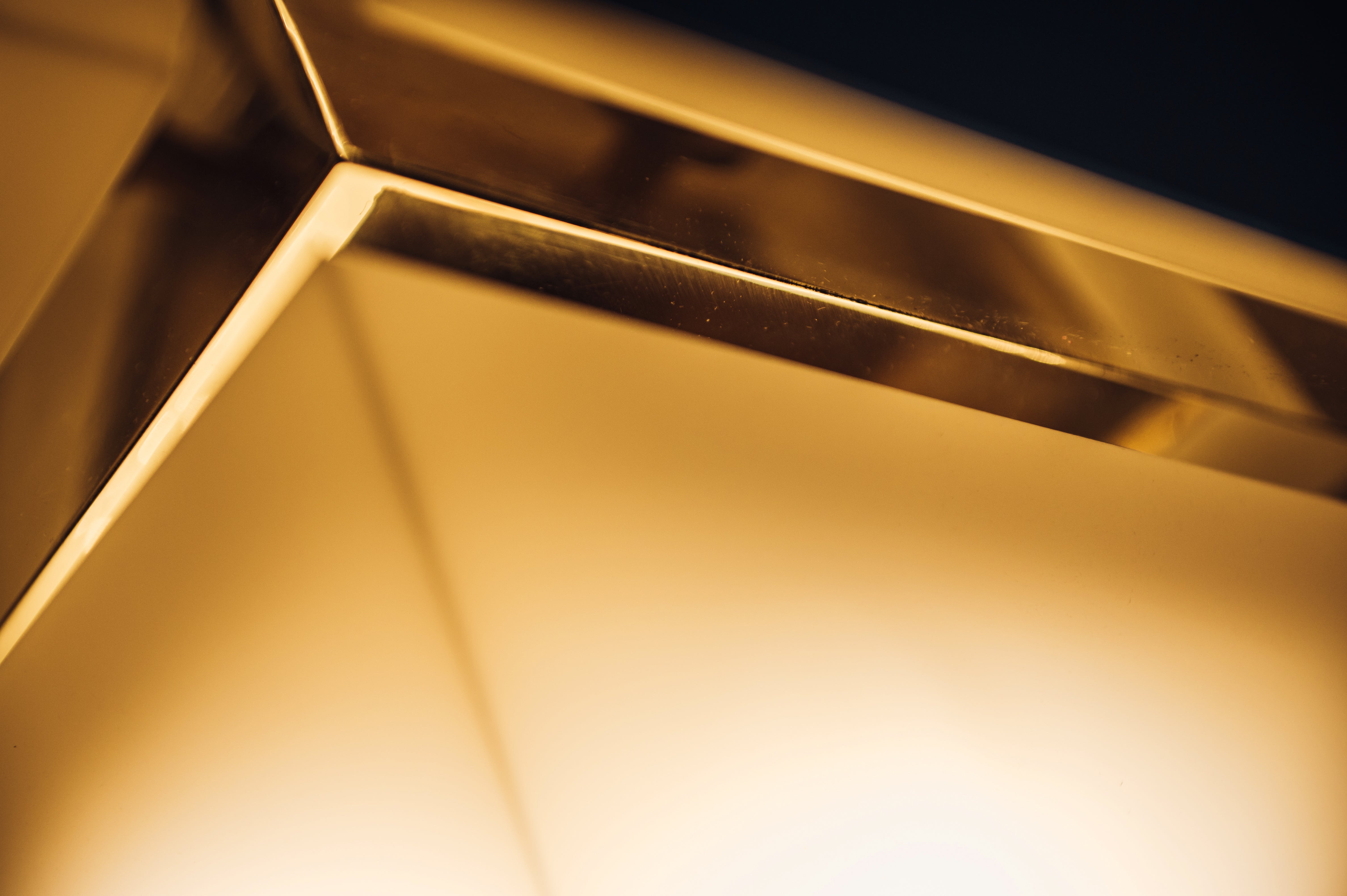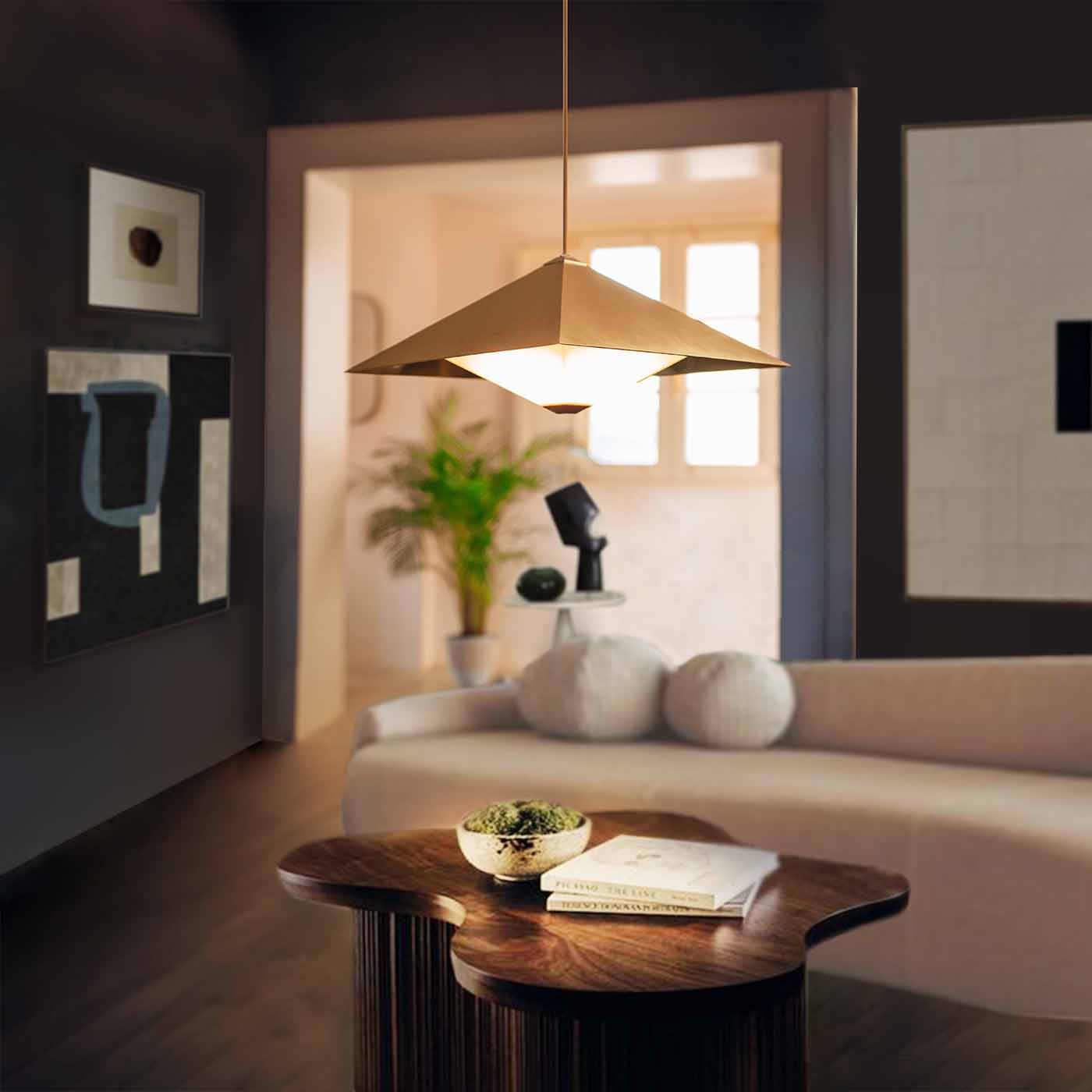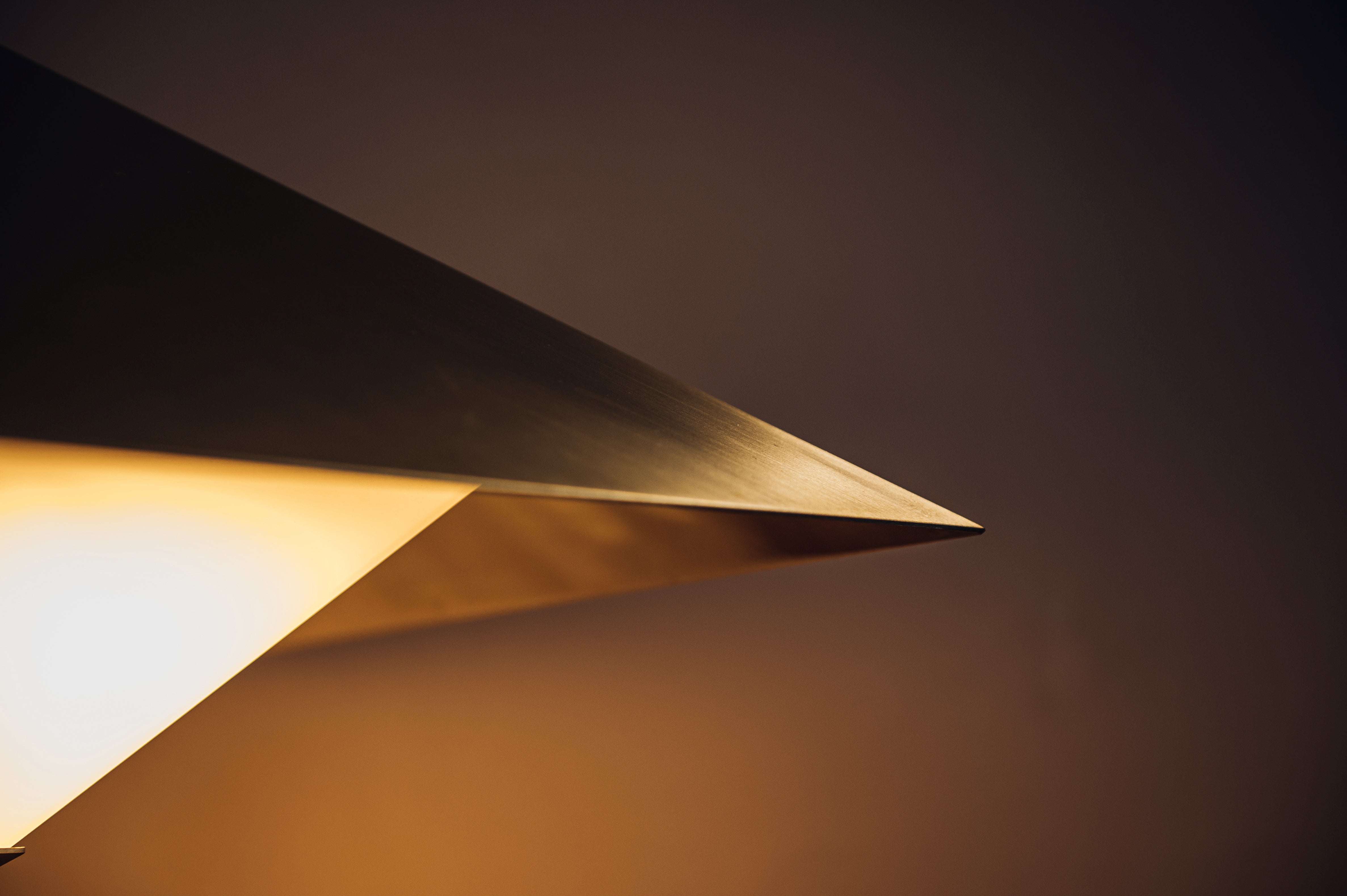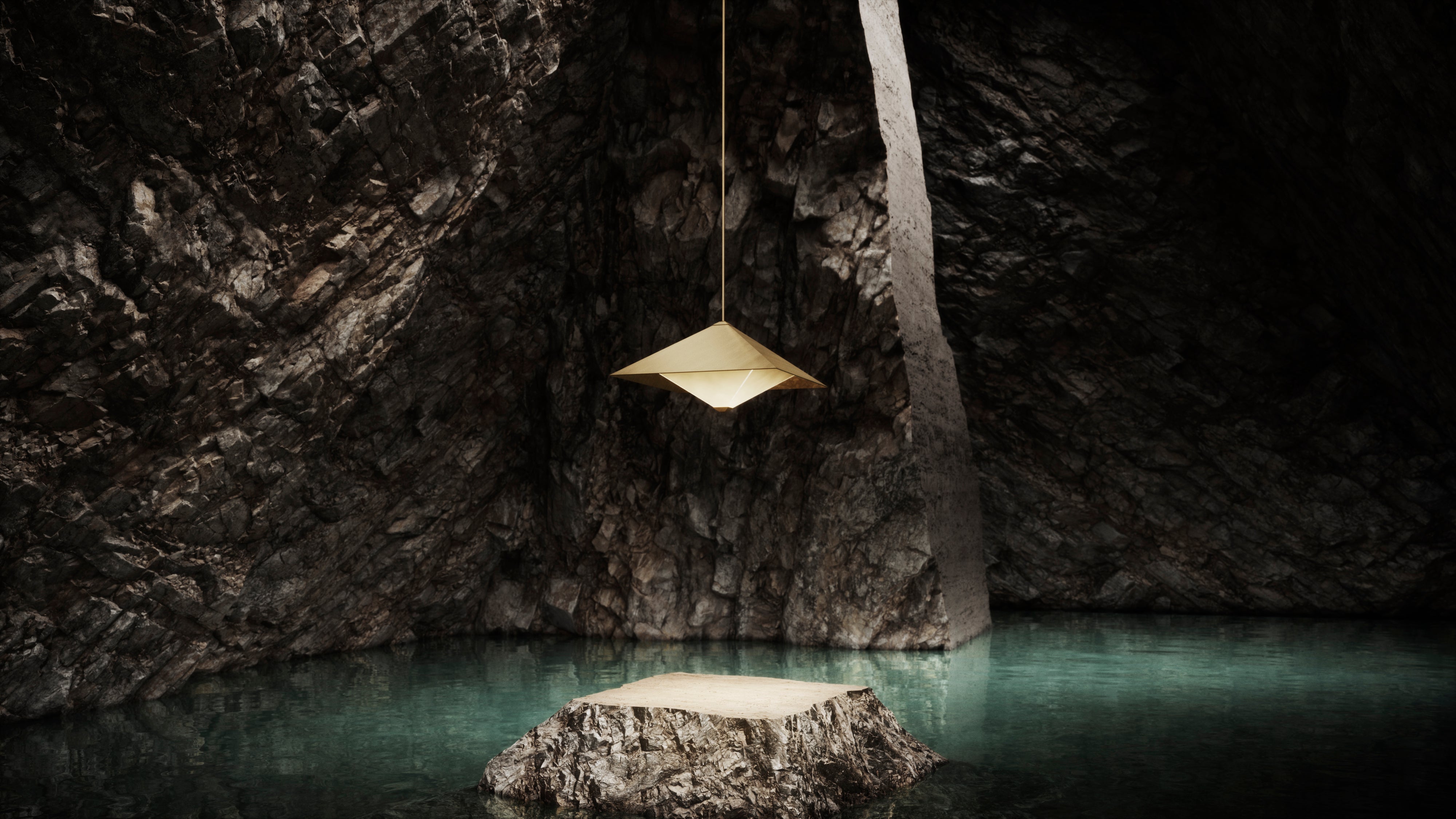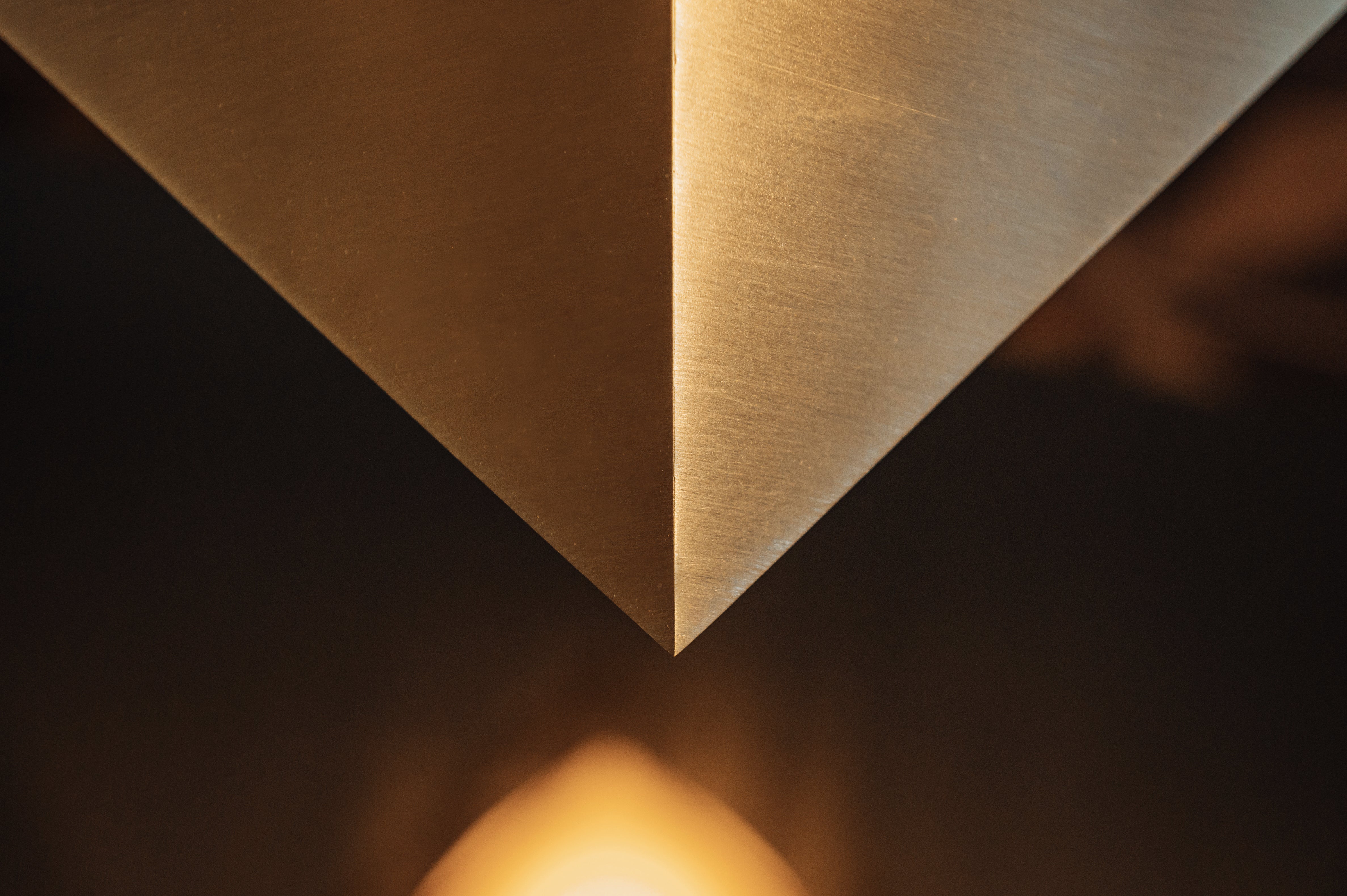 OCTA’s pendant originates from the intersection of two octahedral shapes. A brass shade and a frosted diffuser. The latter floats below the mirrored surfaces of the shade; shapes are reflected and multiplied, displaying a unique optical illusion. Concealed beneath the translucent surface, the integrated LED source emits a distributed warm glow, setting an intimate atmosphere for dining or living spaces.