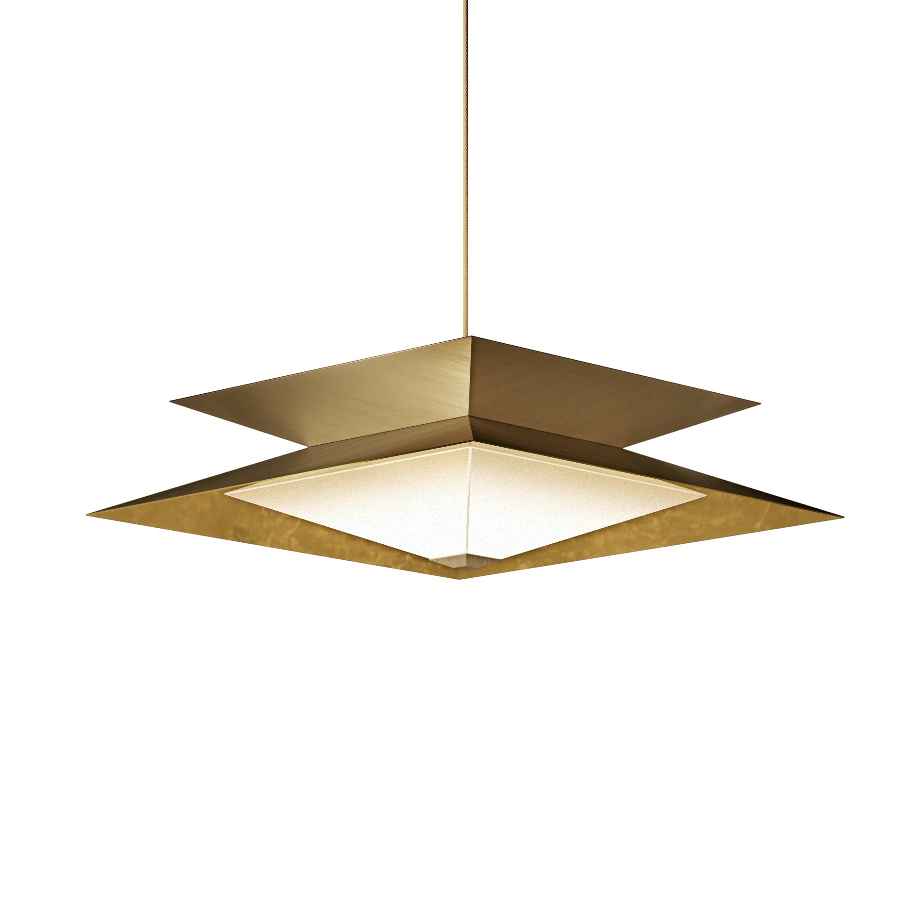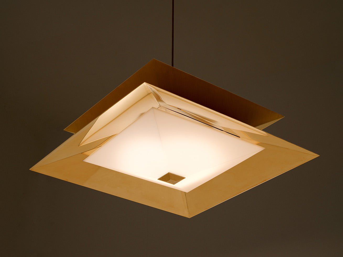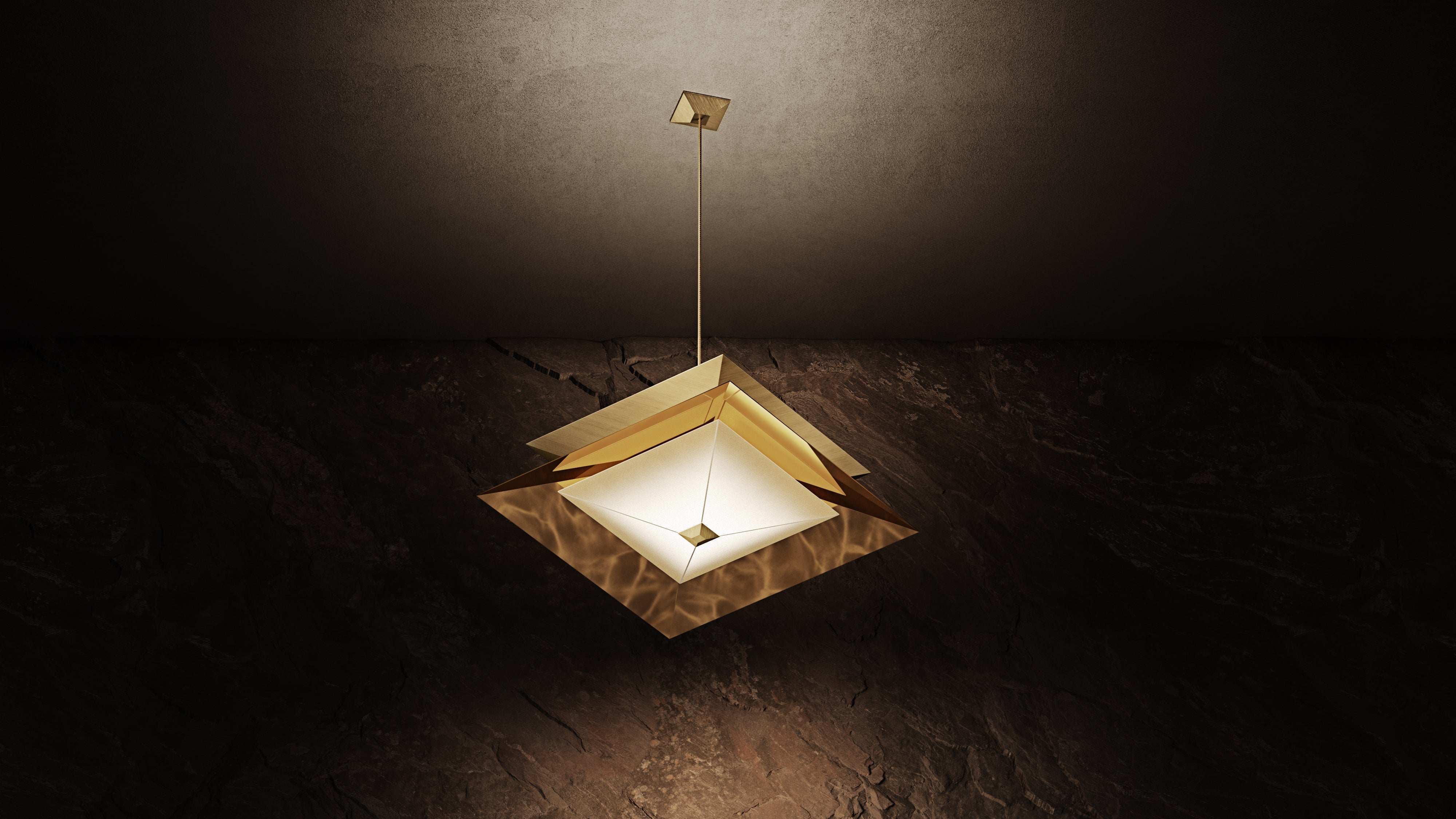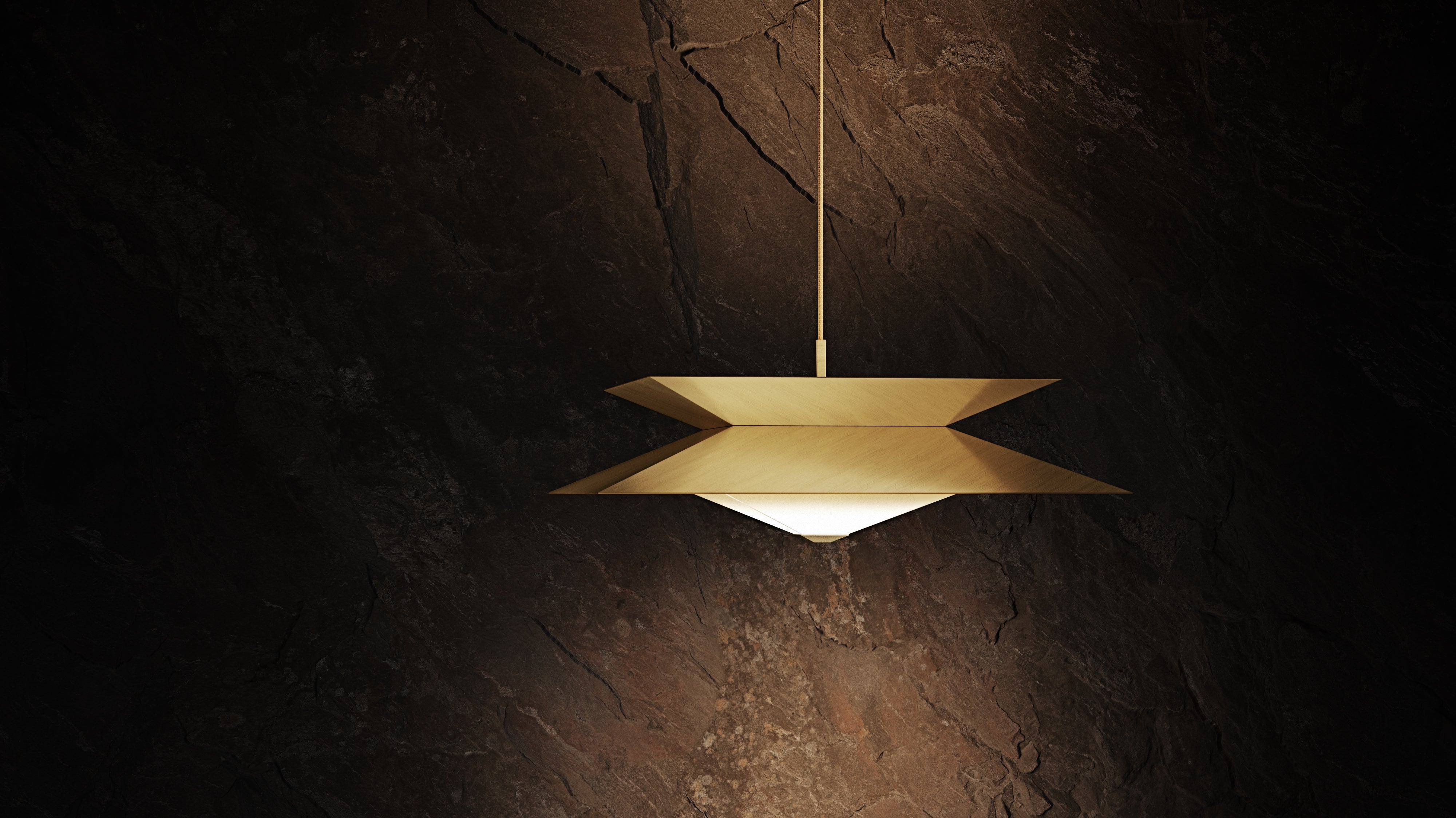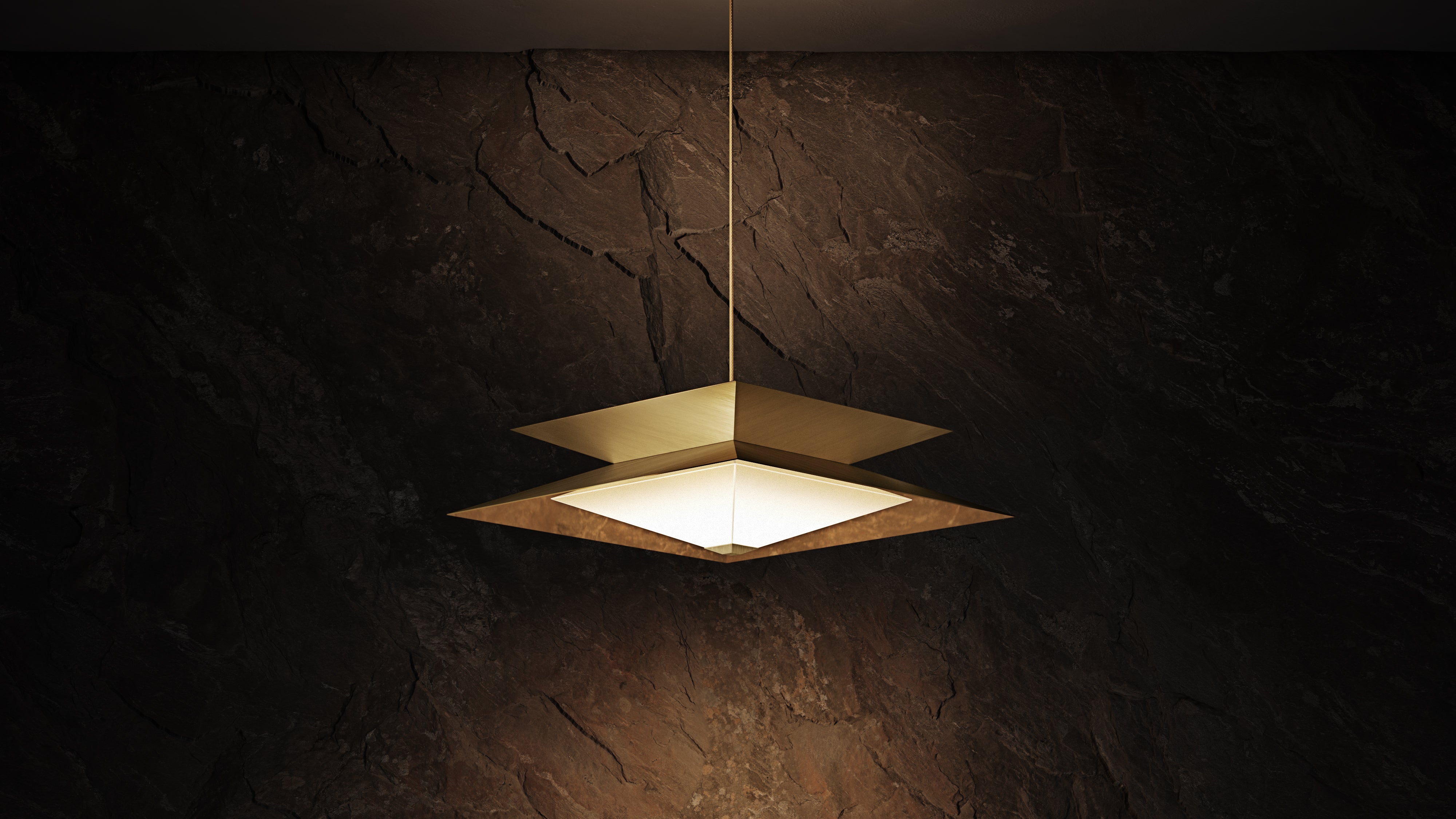 Twin’s sharp angles are accentuated by a diagonal brushing pattern of the outer shades, while the cavities are made of polished brass. The diffuser floats below, reflecting and multiplying shapes to create mesmerising optical illusions. Integrated LEDs emit a warm glow beneath the translucent surface, setting an intimate atmosphere.