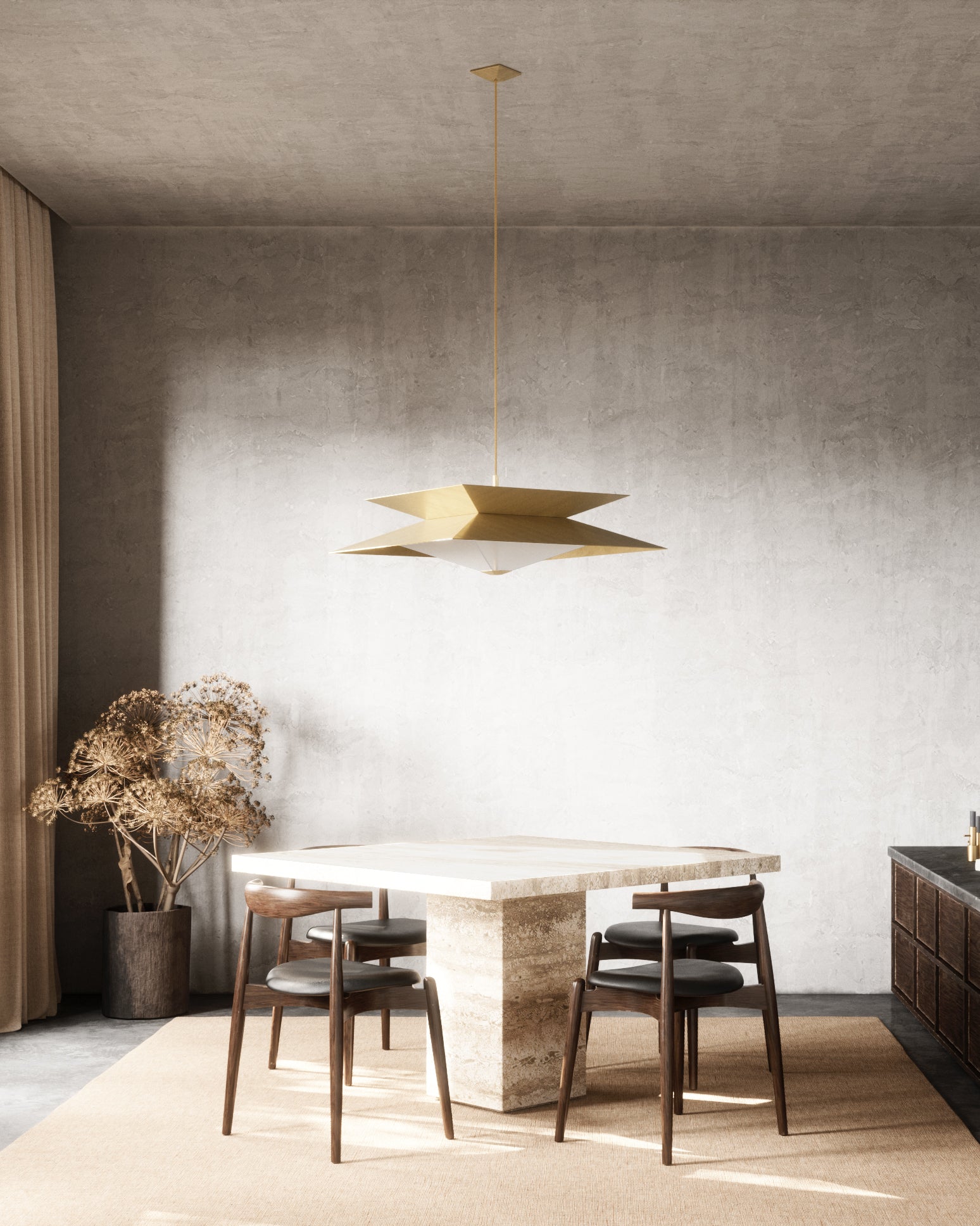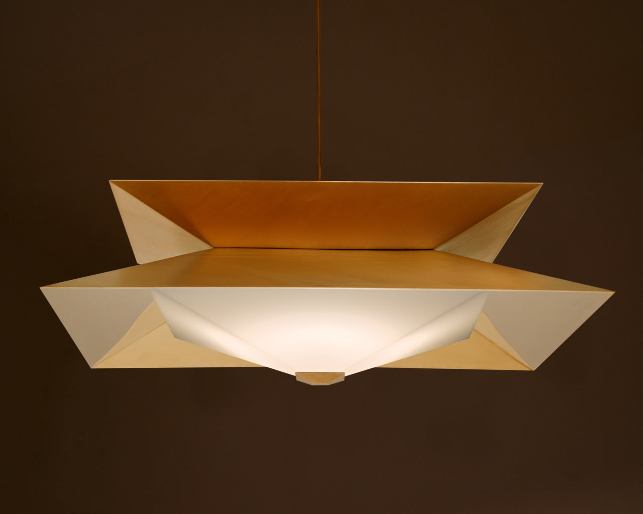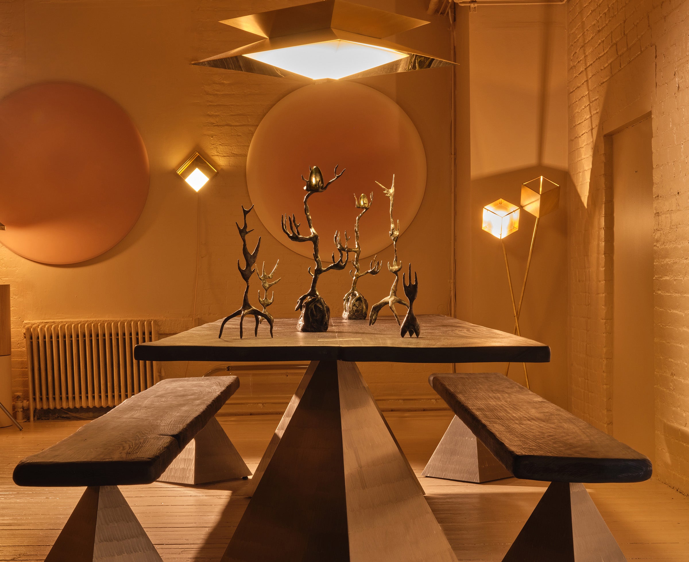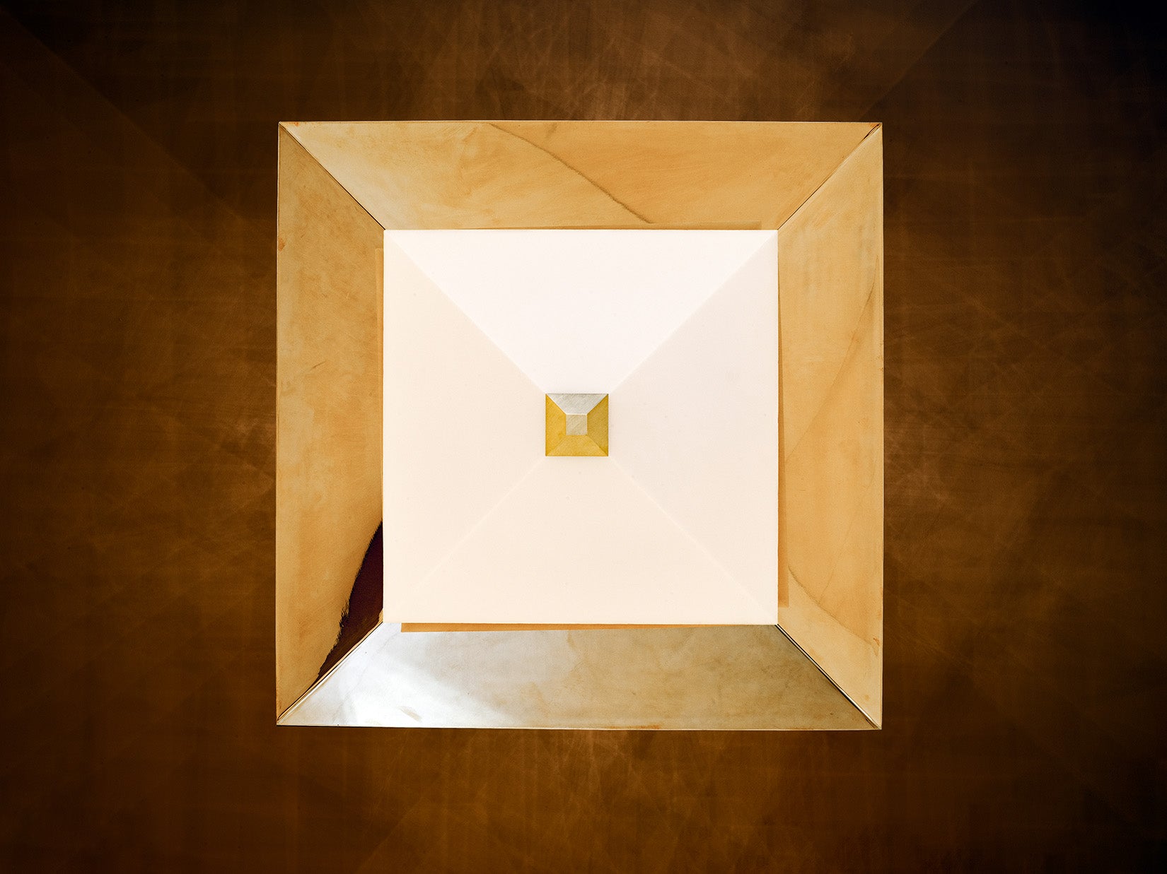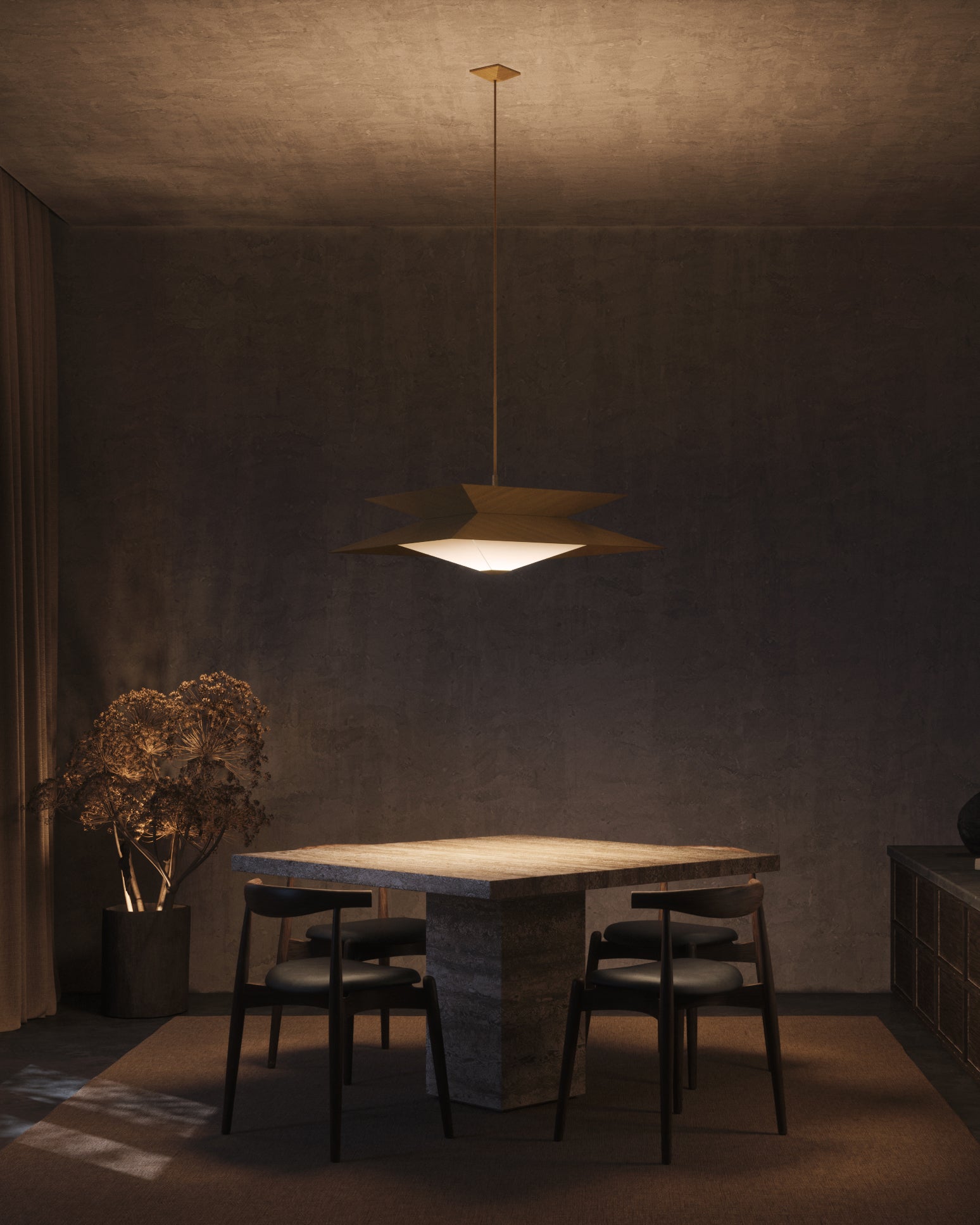 Twin’s sharp angles are accentuated by a diagonal brushing pattern of the outer shades, while the cavities are made of polished brass. The diffuser floats below, reflecting and multiplying shapes to create mesmerising optical illusions. Integrated LEDs emit a warm glow beneath the translucent surface, setting an intimate atmosphere.