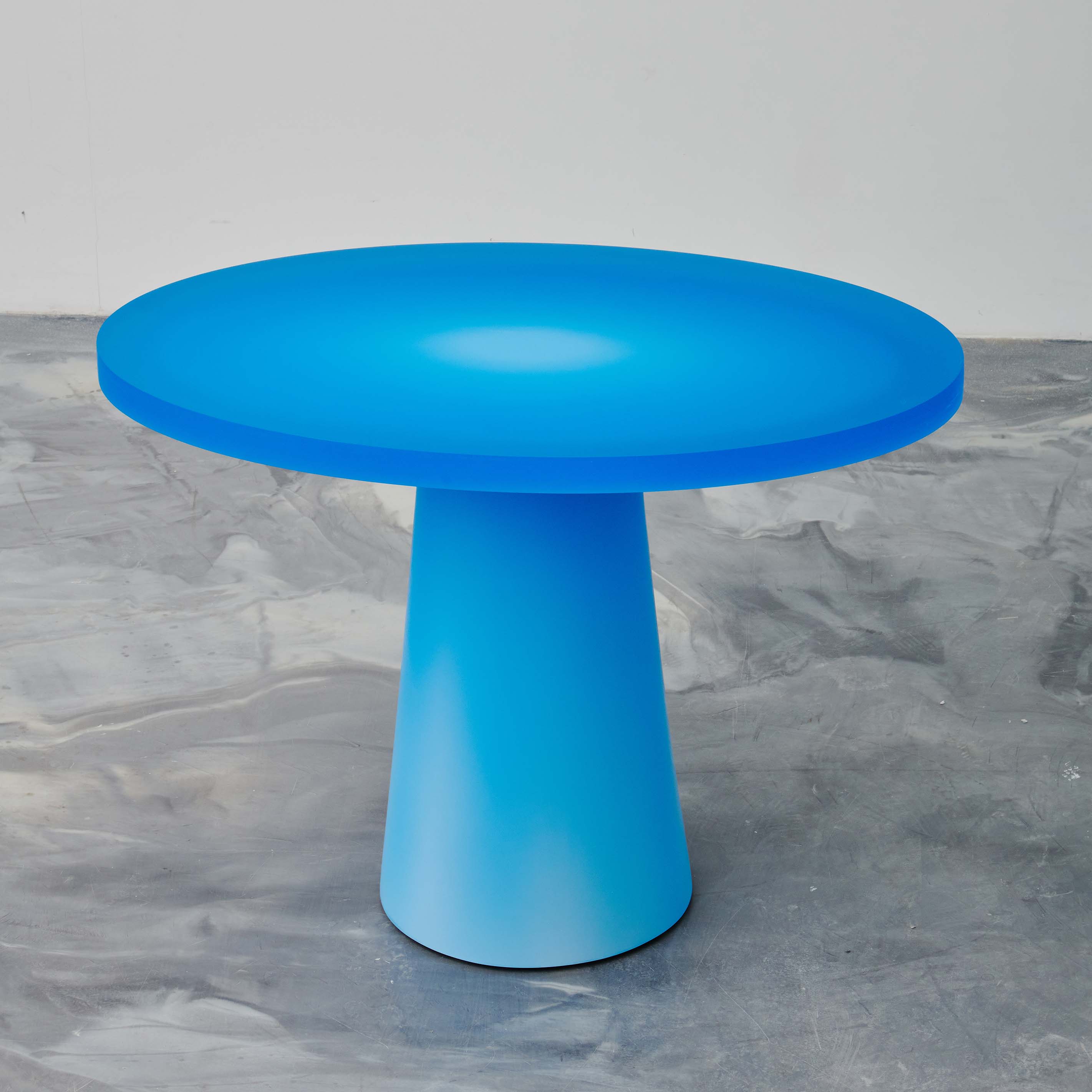 The Elliptical Entry Table consists of an oval top set on a tapered conical base. The tone manipulation of the core adds dimensions to its quality. Simple in design but maximalist in approach. The regular course of the light is diverted from within, refracting in dynamic & unexpected ways towards a more saturated blue edge