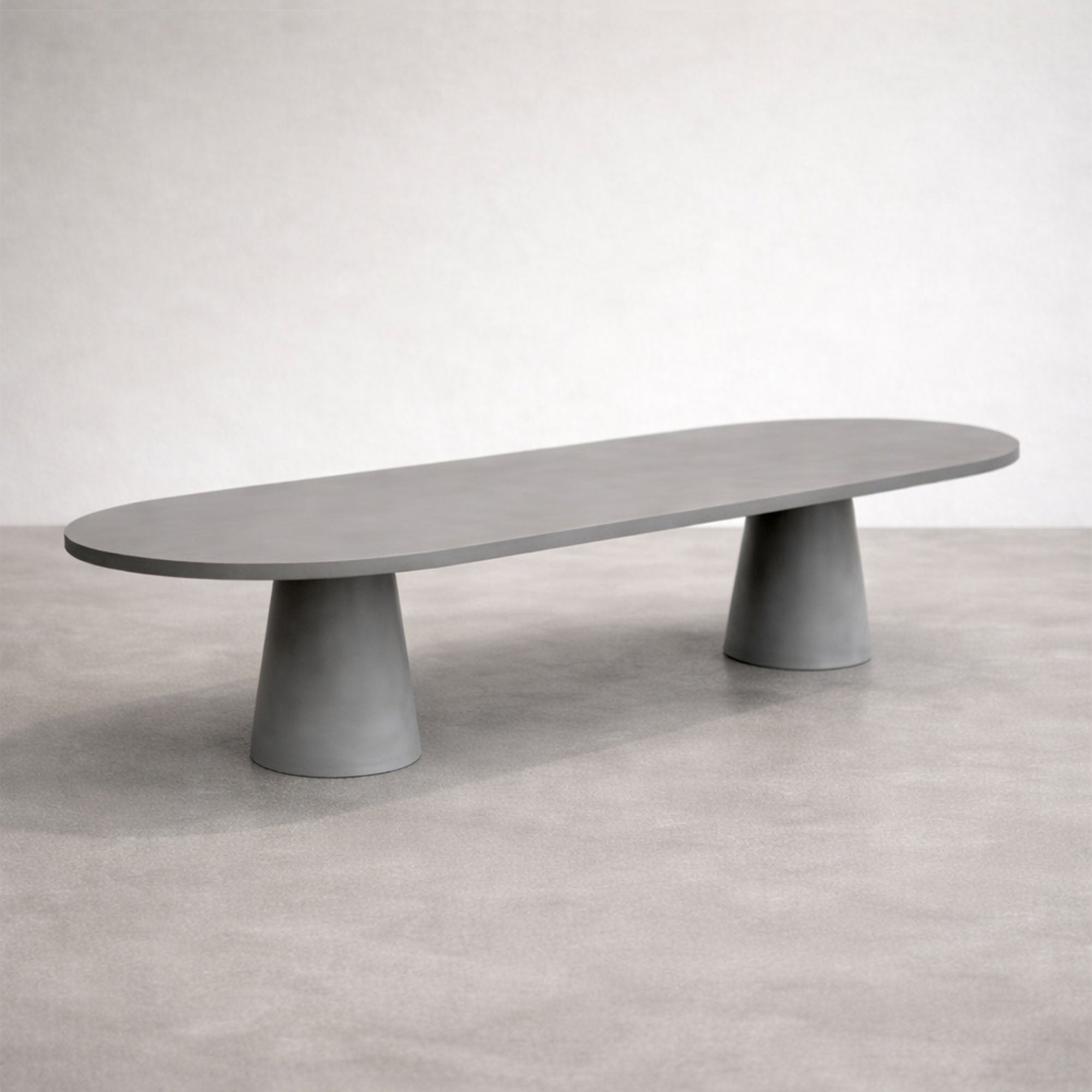 The Race Track Oval Dining Table features an elongated oval top and sculptural dual pedestal base. Its continuous curved edge softens the form, while the conical bases create a grounded, architectural presence.