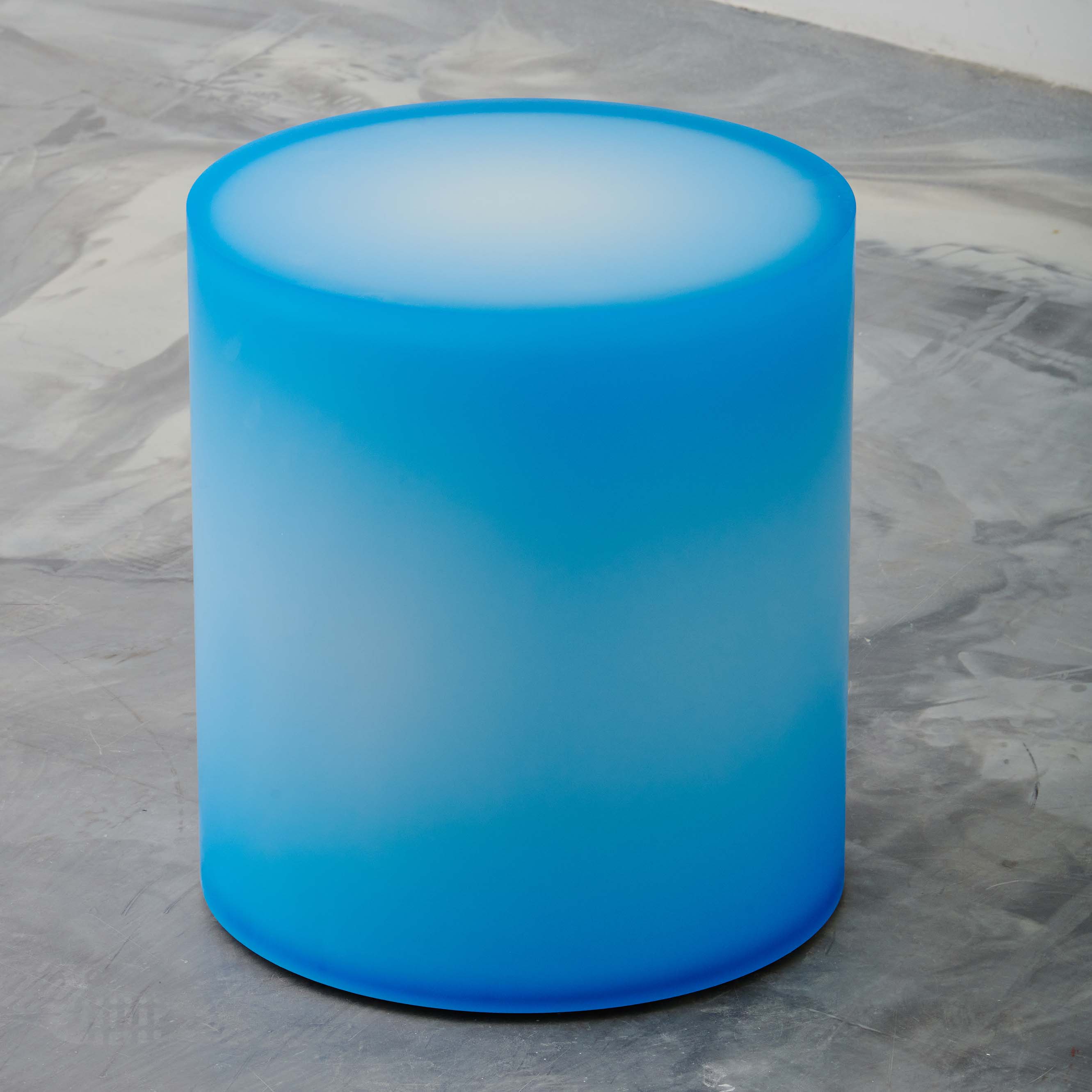 Multi-layer side table or stool features a shift core with a gradient of blues. The effects in this piece manage to both guide the eye, yet perplex it simultaneously.