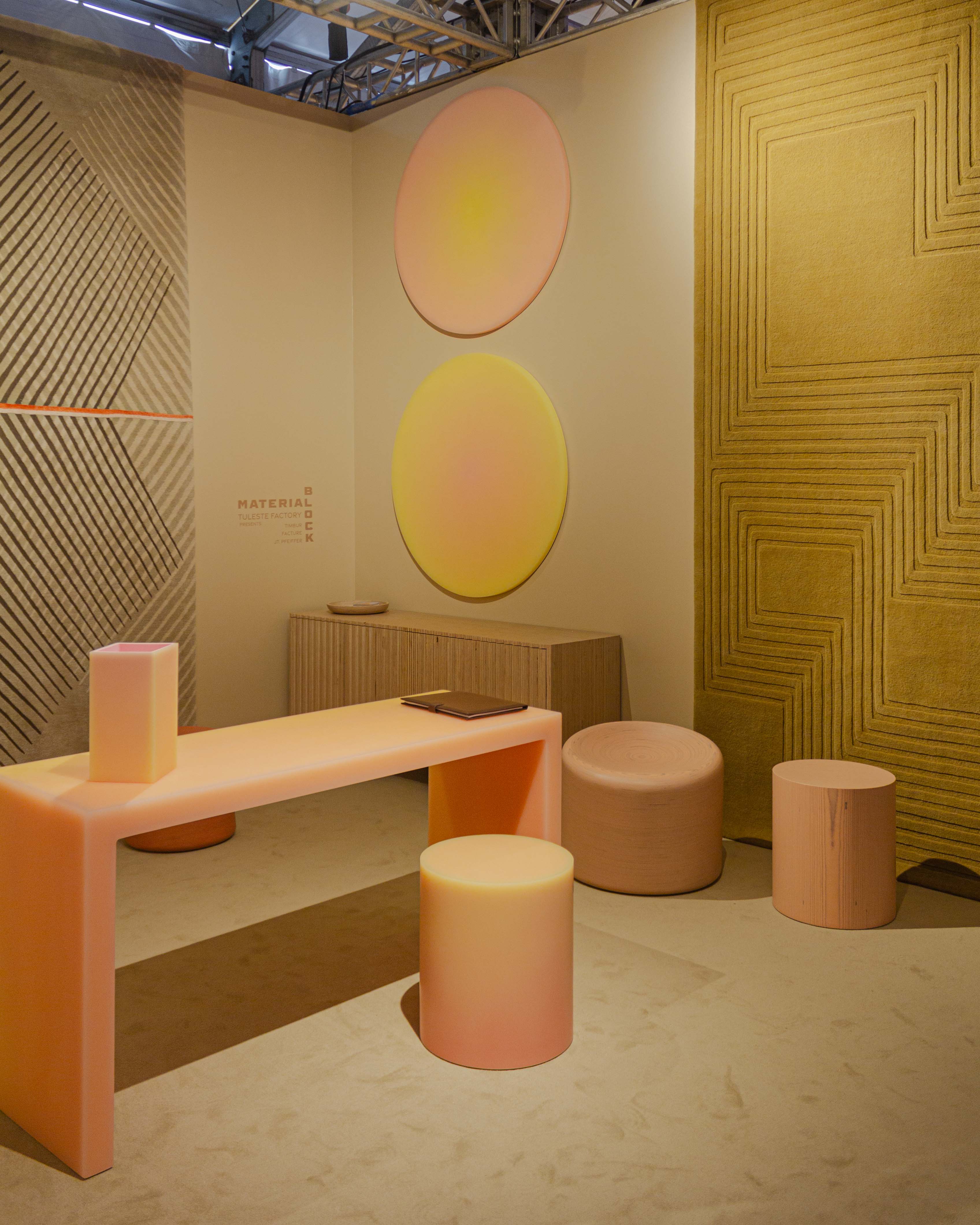 Resin stool in a warm colorway, featuring a matte exterior that generates a mesmerizing visual effect from a medley of gradual saturation shifts along the wavy patterns. The combination of core and resin color determines the overall hue variants of each unique stool.