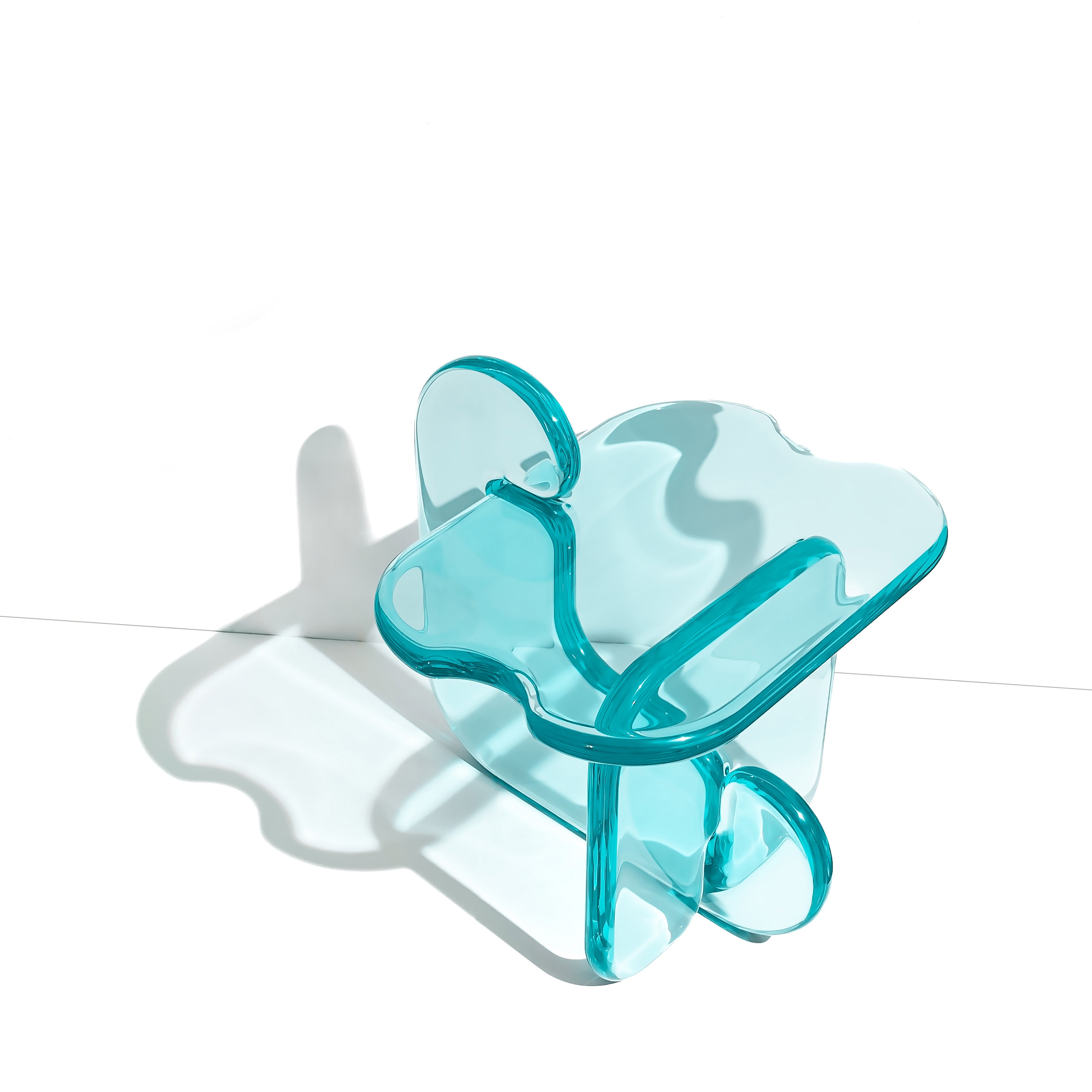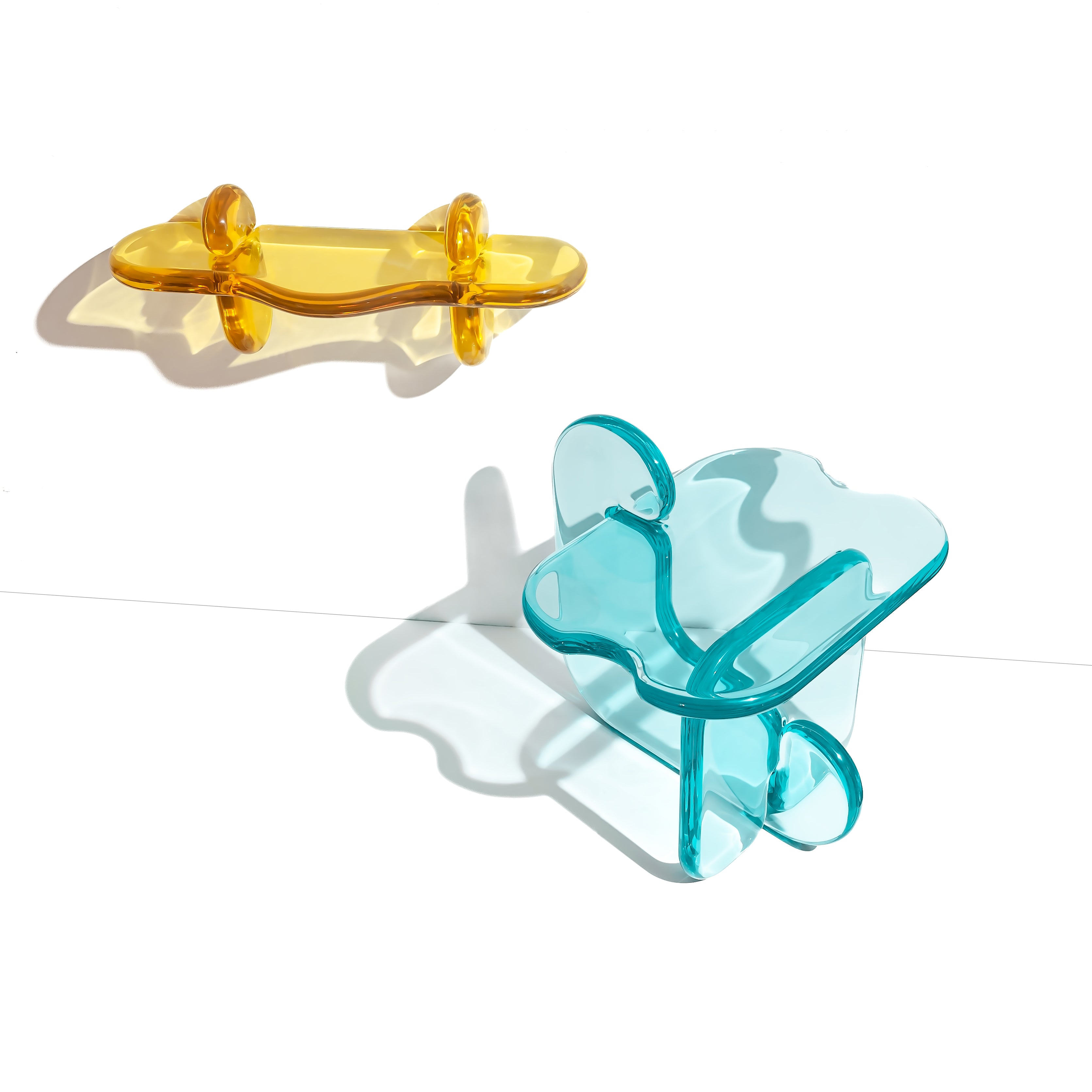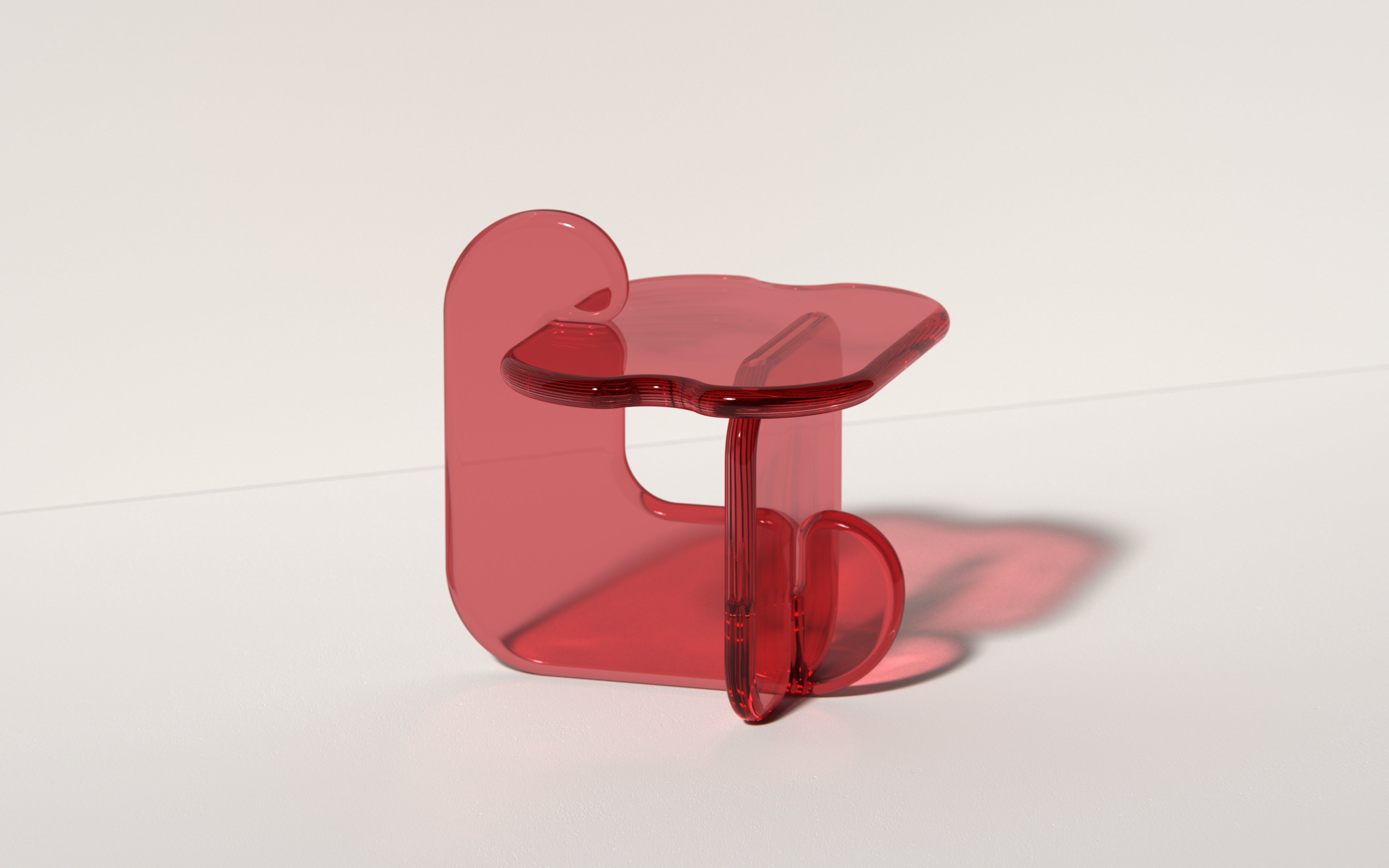 A continuation of the Plump series of sculptural furniture. The shapes play upon the effect that resin has as light is refracted through the solid parts. The table is only held together through notches at each joint. There are no glues or fasteners.