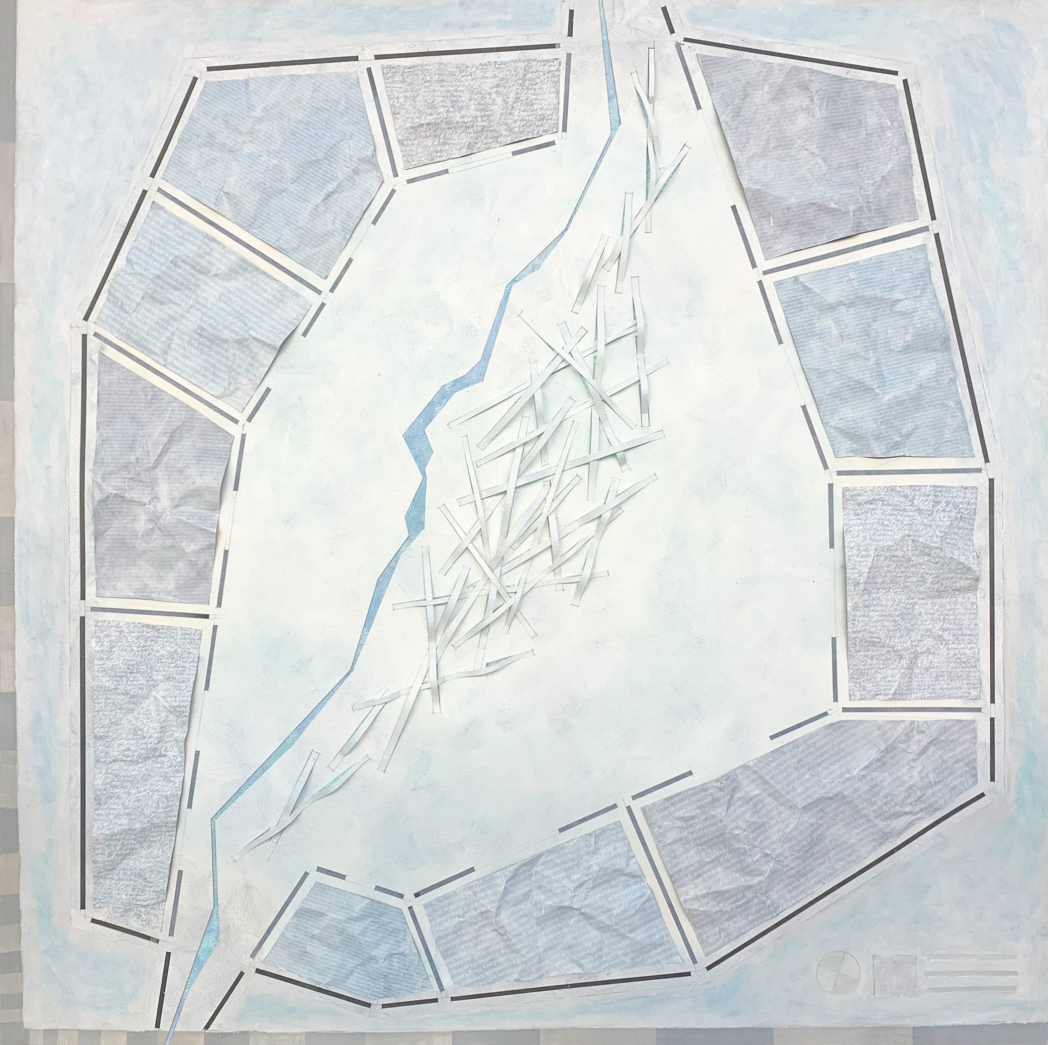 Acrylic paint, inkjet prints, graphite, colored pencil on paper