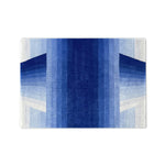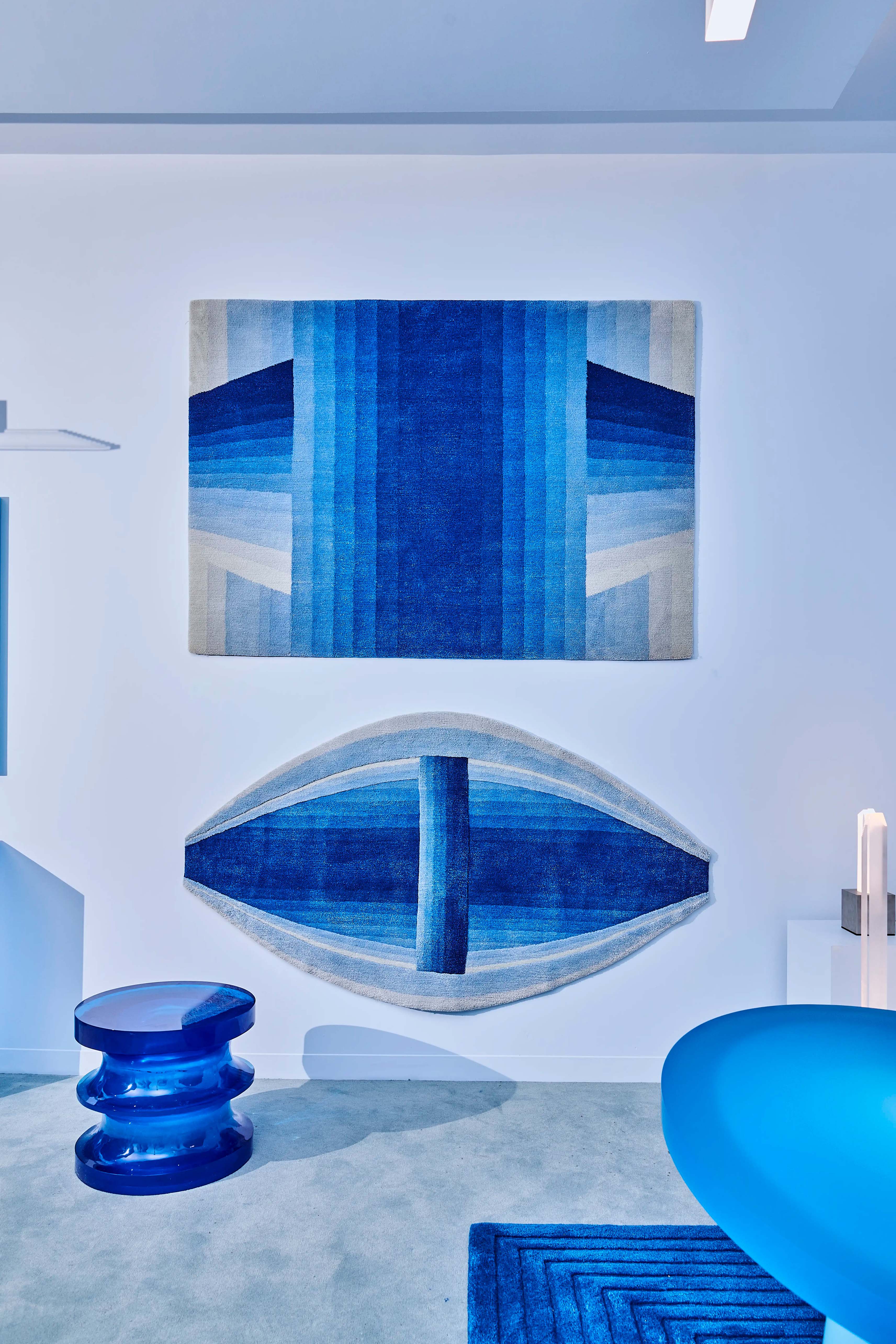 Sky Revolution, Hand knotted in silk and wool. Characterized by planes of color that appear and disappear as the viewer walks on it. At first glance, the piece does not reveal an image, but presents a sensitive geometry, where with its own language and with a play of chiaroscuro, it creates a new vision when moving around and surrounding the piece.