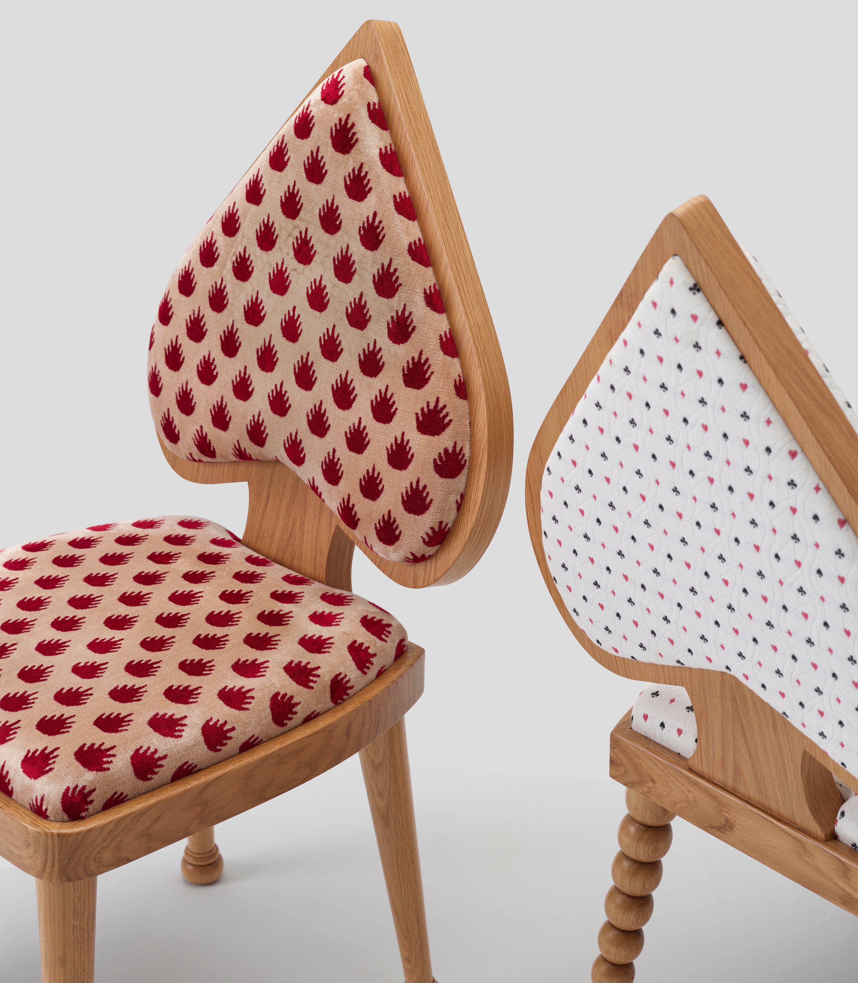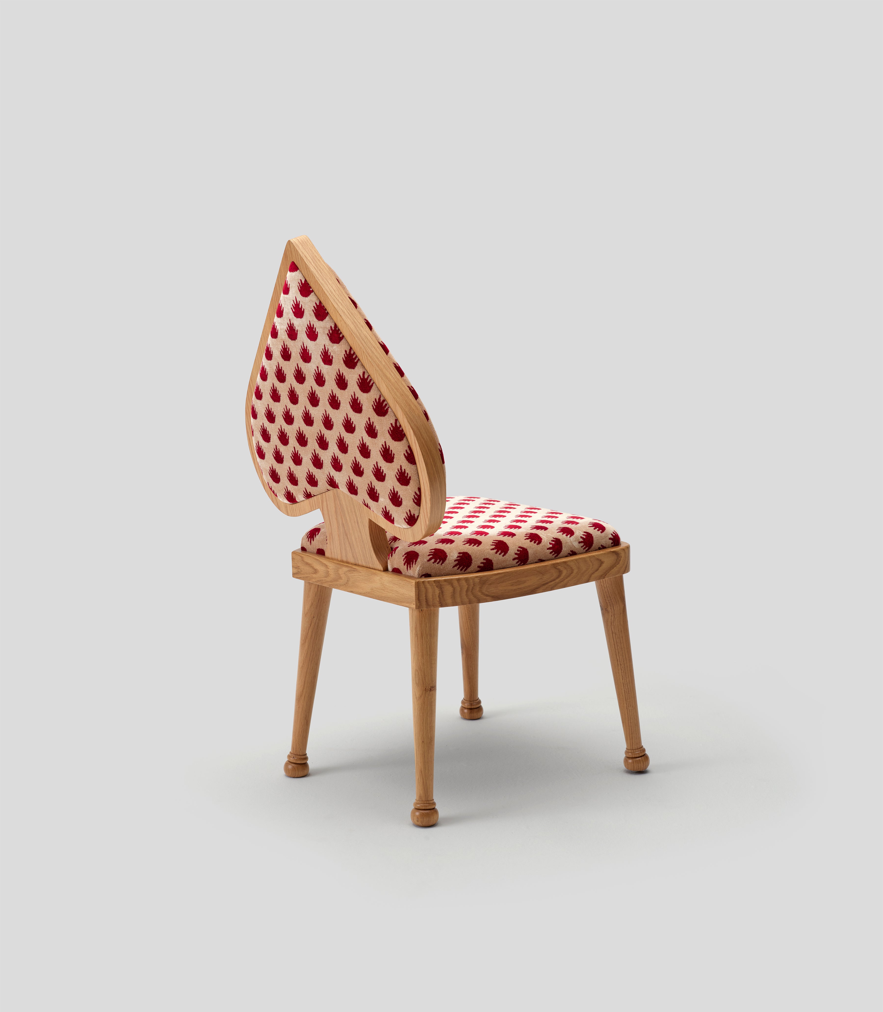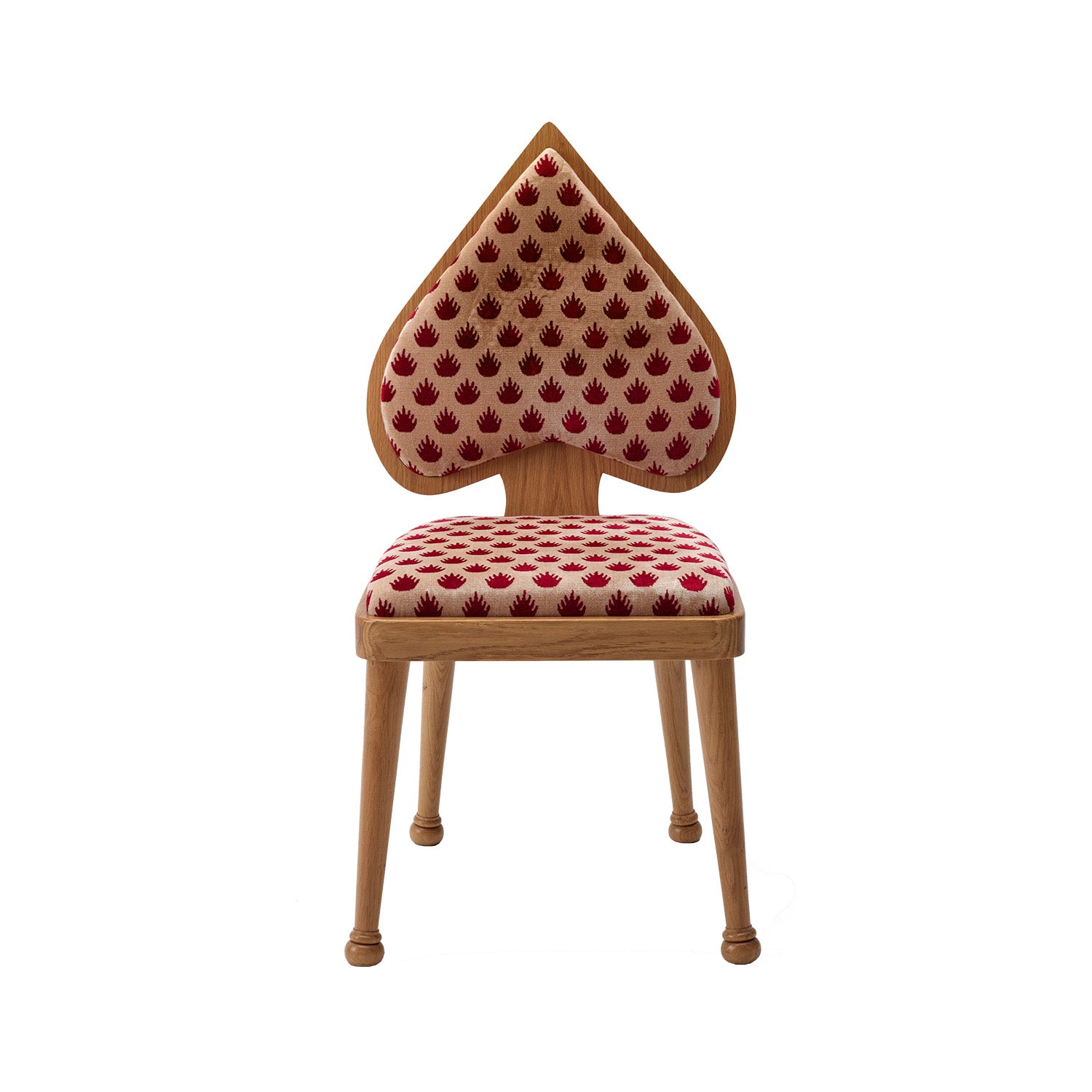 The Ace Chairs were originally conceived for the designer’s own wedding, crafted especially for the bride and groom to enjoy during their dinner celebration. Drawing inspiration from the Queen of Spades, these chairs embody a spirited elegance, making them perfect as standout dining or accent pieces. Available with two distinct leg styles, they can be crafted from either oak or cherry wood. The upholstery, offered in a range of alluring, high-quality fabrics, not only exudes luxury but also provides exceptional ergonomic comfort. Sitting in an Ace Chair is a truly regal experience. Custom fabrics and leathers are available upon request, ensuring each chair is as unique as the person who sits in it.