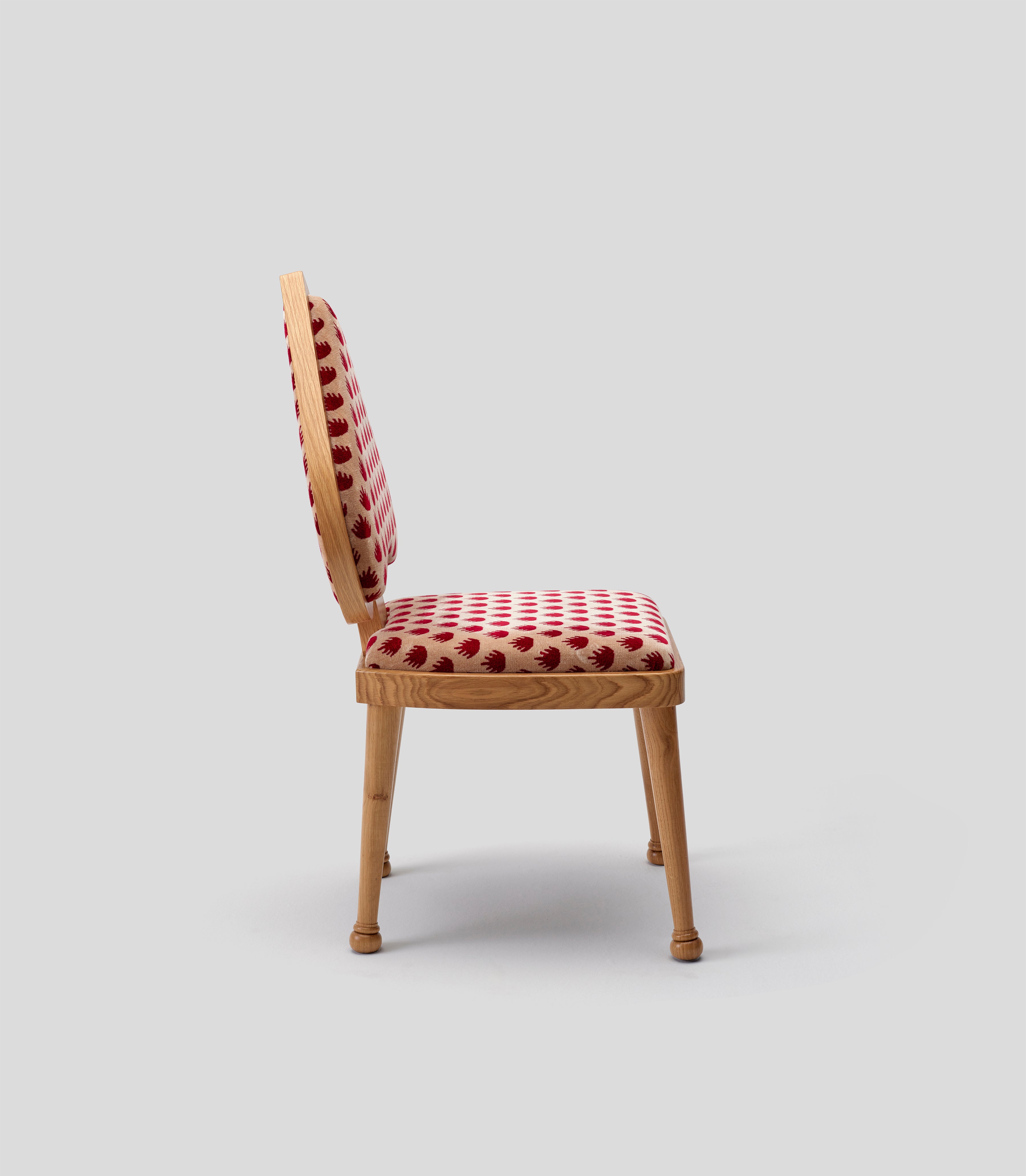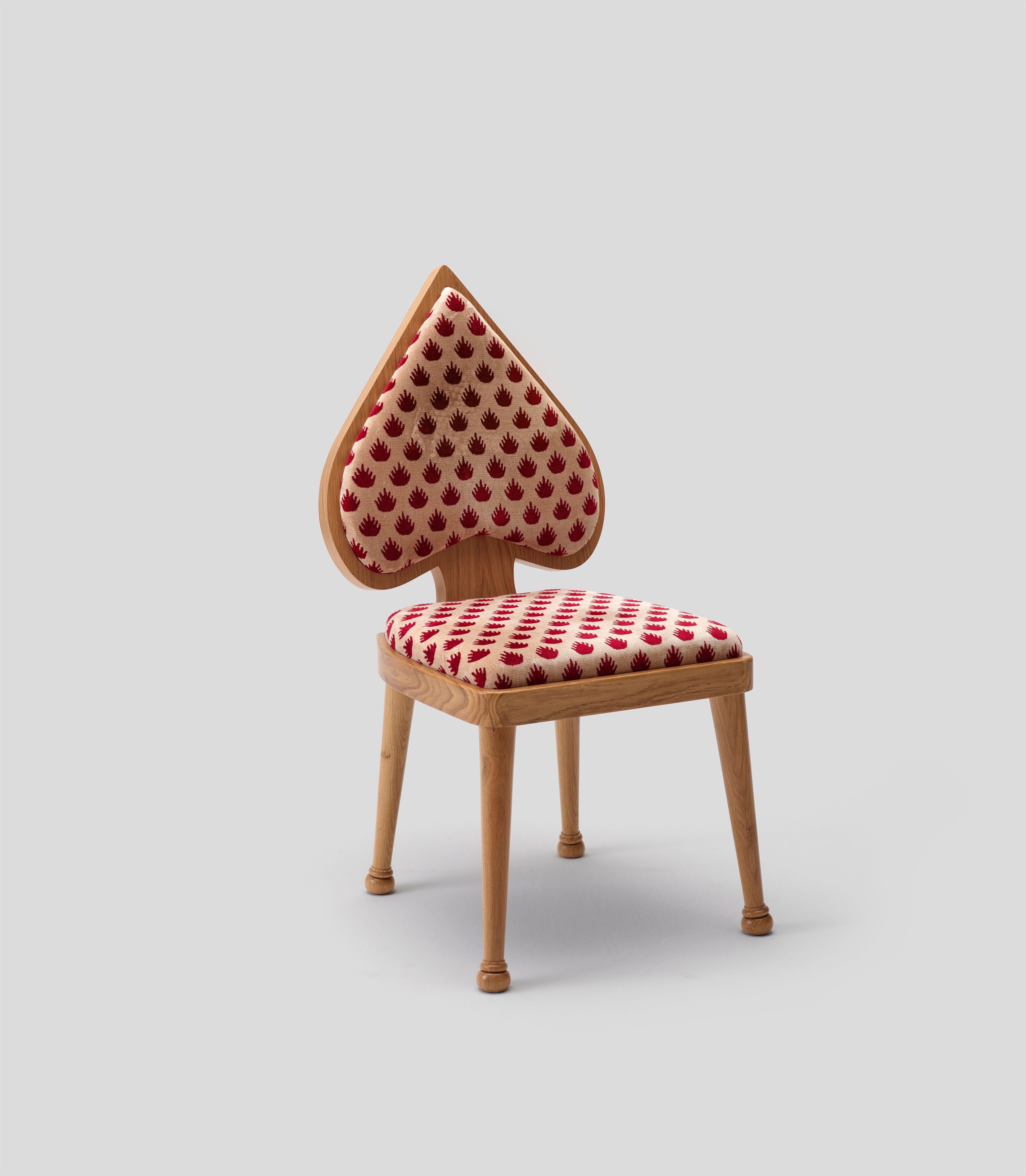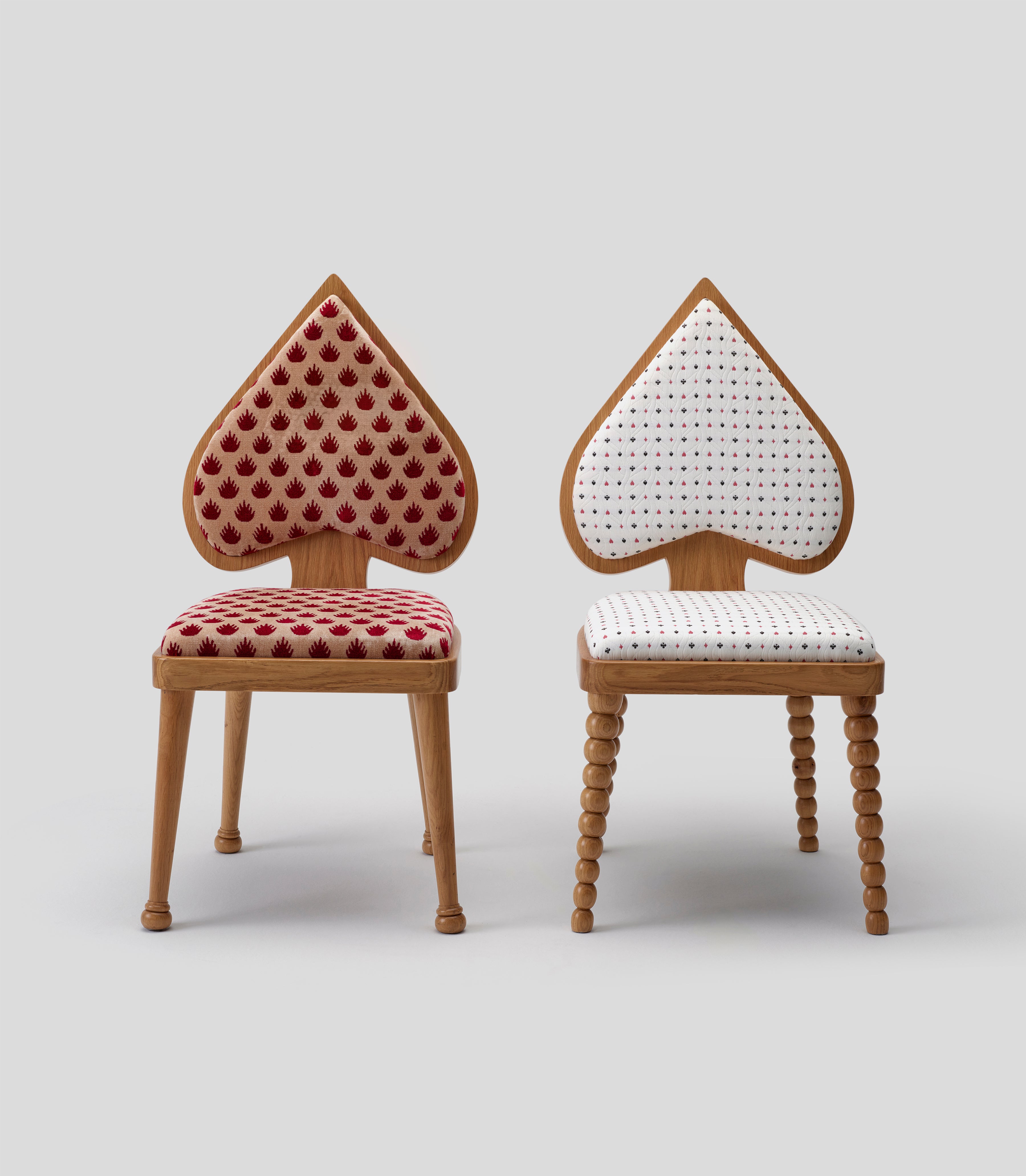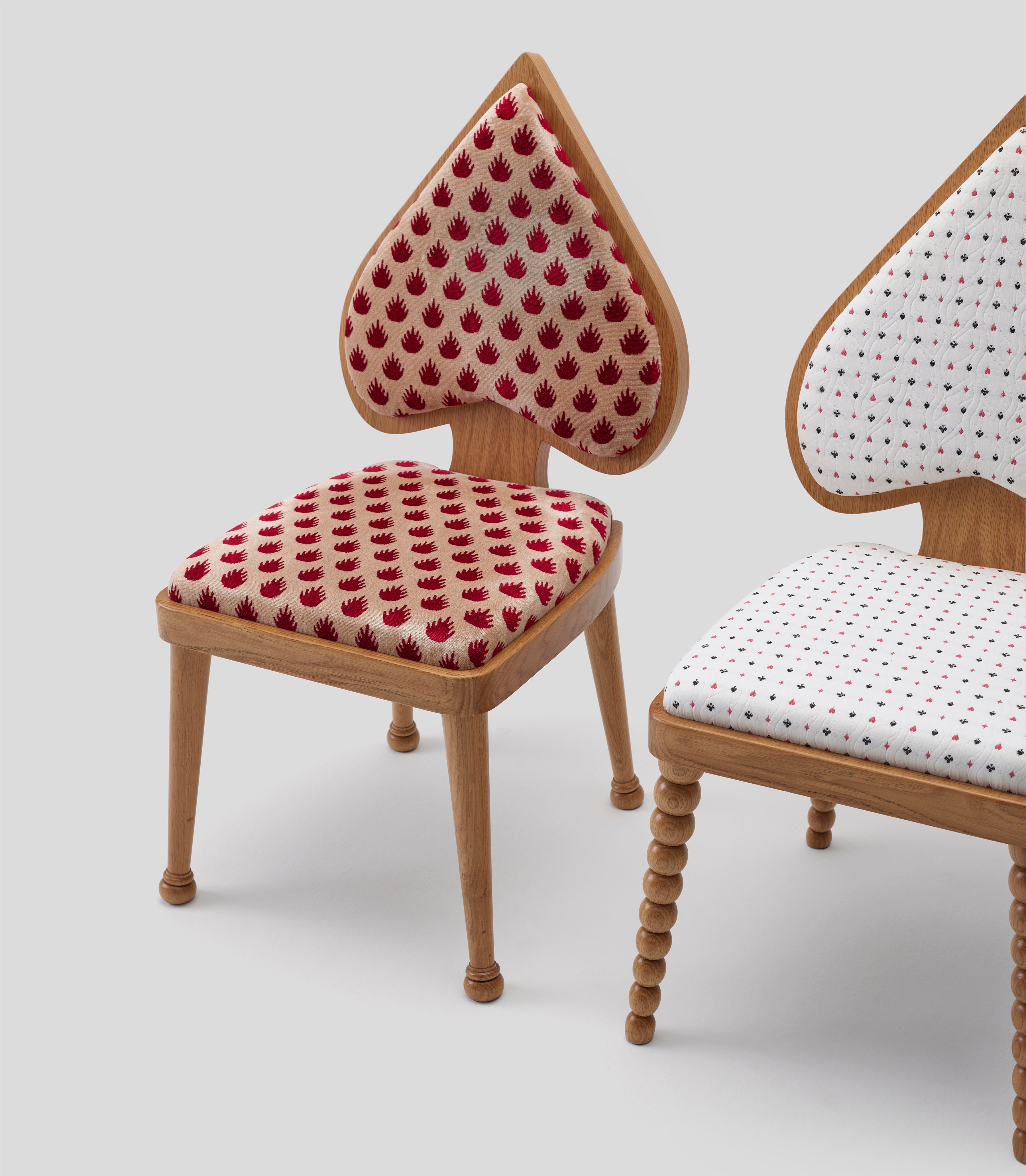 The Ace Chairs were originally conceived for the designer’s own wedding, crafted especially for the bride and groom to enjoy during their dinner celebration. Drawing inspiration from the Queen of Spades, these chairs embody a spirited elegance, making them perfect as standout dining or accent pieces. Available with two distinct leg styles, they can be crafted from either oak or cherry wood. The upholstery, offered in a range of alluring, high-quality fabrics, not only exudes luxury but also provides exceptional ergonomic comfort. Sitting in an Ace Chair is a truly regal experience. Custom fabrics and leathers are available upon request, ensuring each chair is as unique as the person who sits in it.