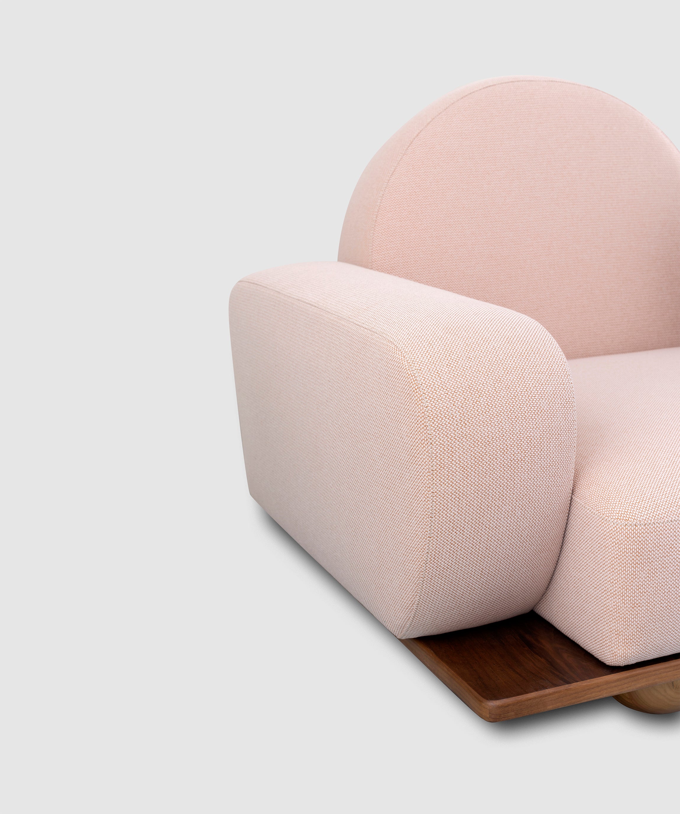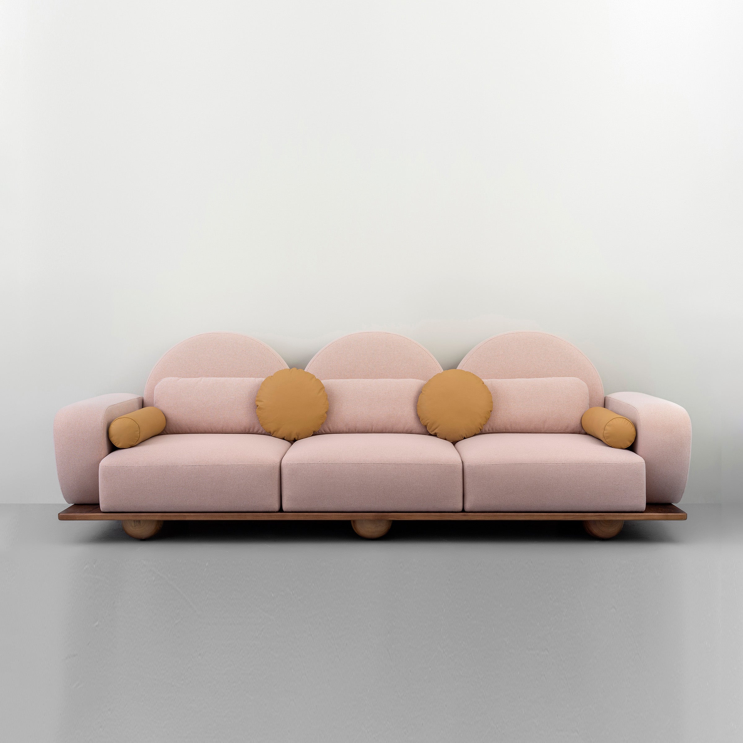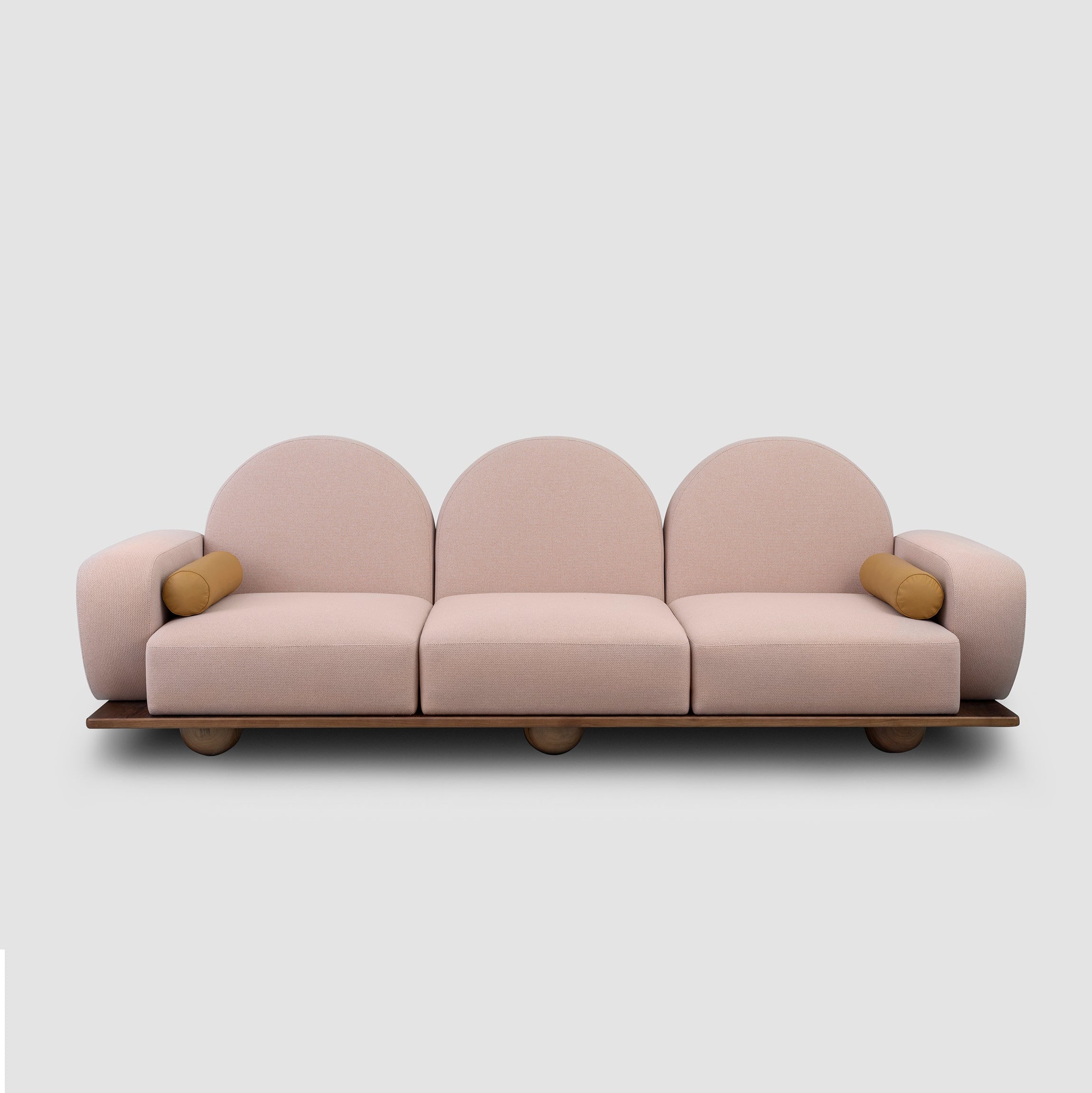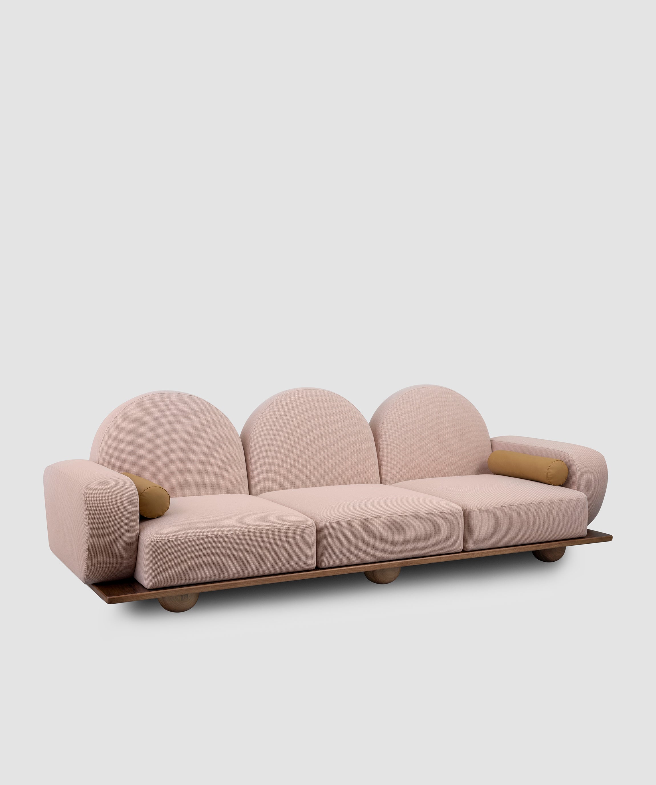 BEICE is a 3 seater sofa designed to mimic the feeling of sitting on cotton candy clouds. The combination of its powder pink color, arc shaped back rests, round edges and sphere walnut feet creates a dreamy, tender design. It is wide enough to lay down and soft enough to sleep on. BEICE is entirely hand-crafted, the base and feet are constructed from solid walnut and upholstery made from Kvadrat fabric.