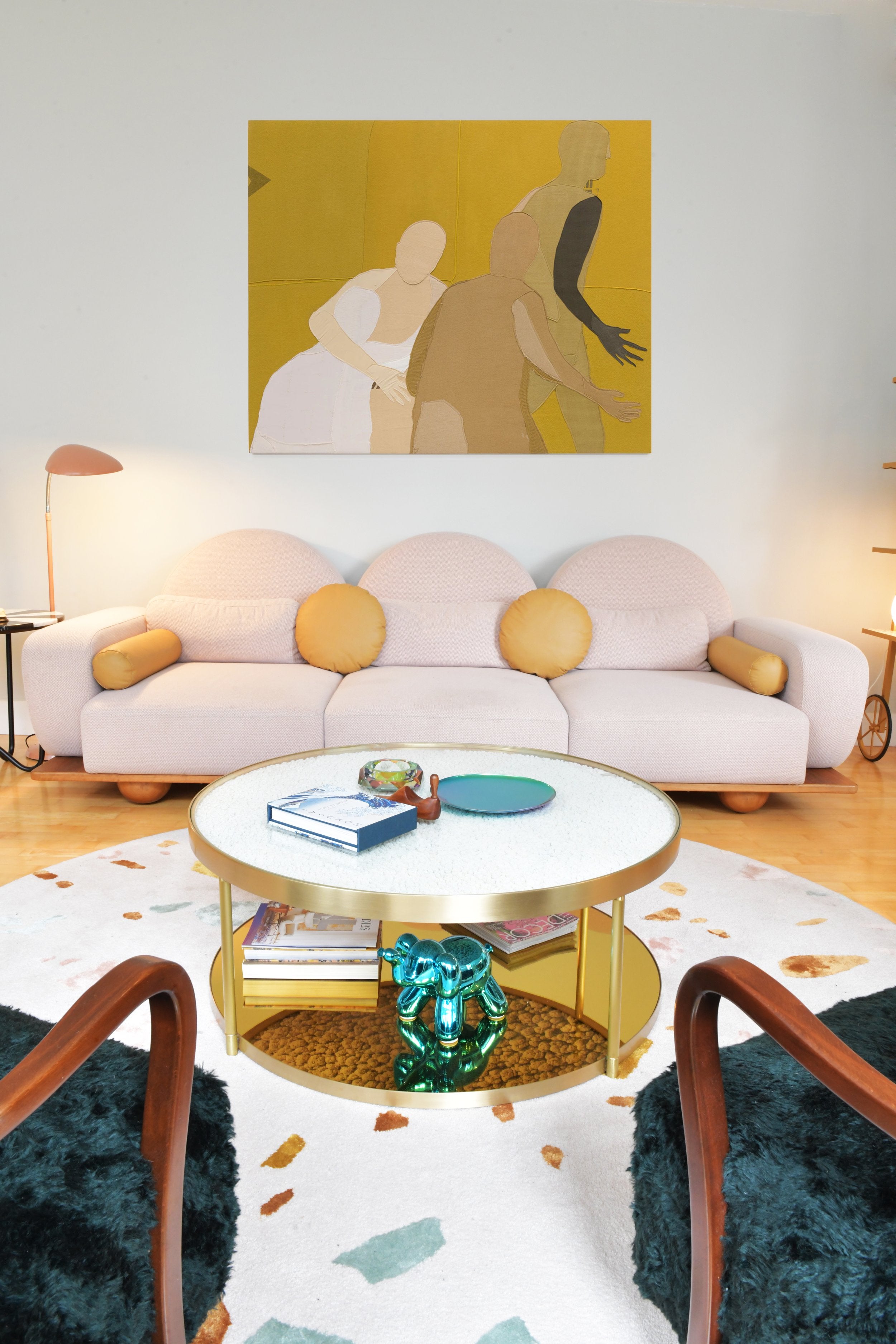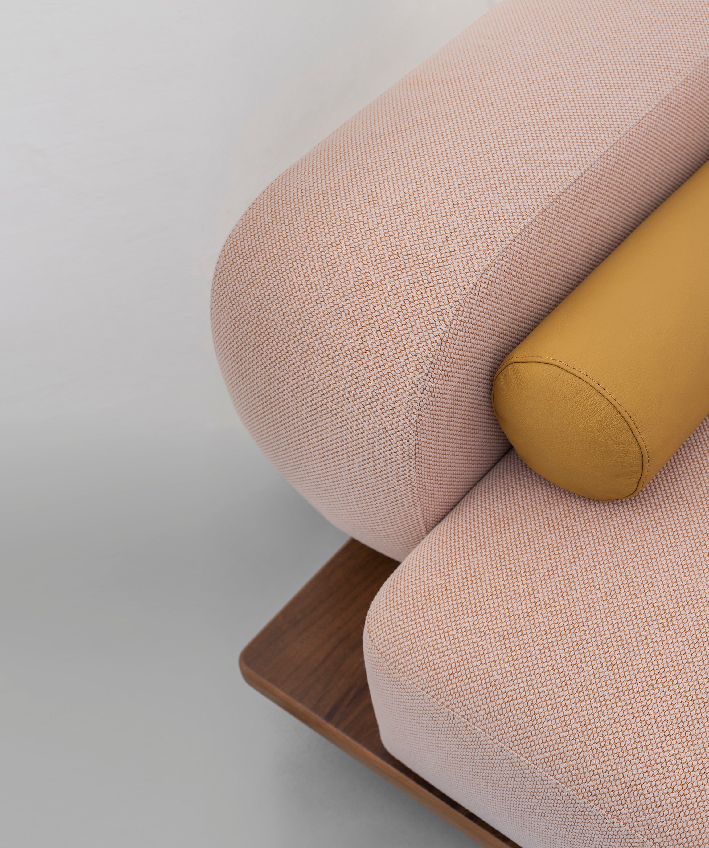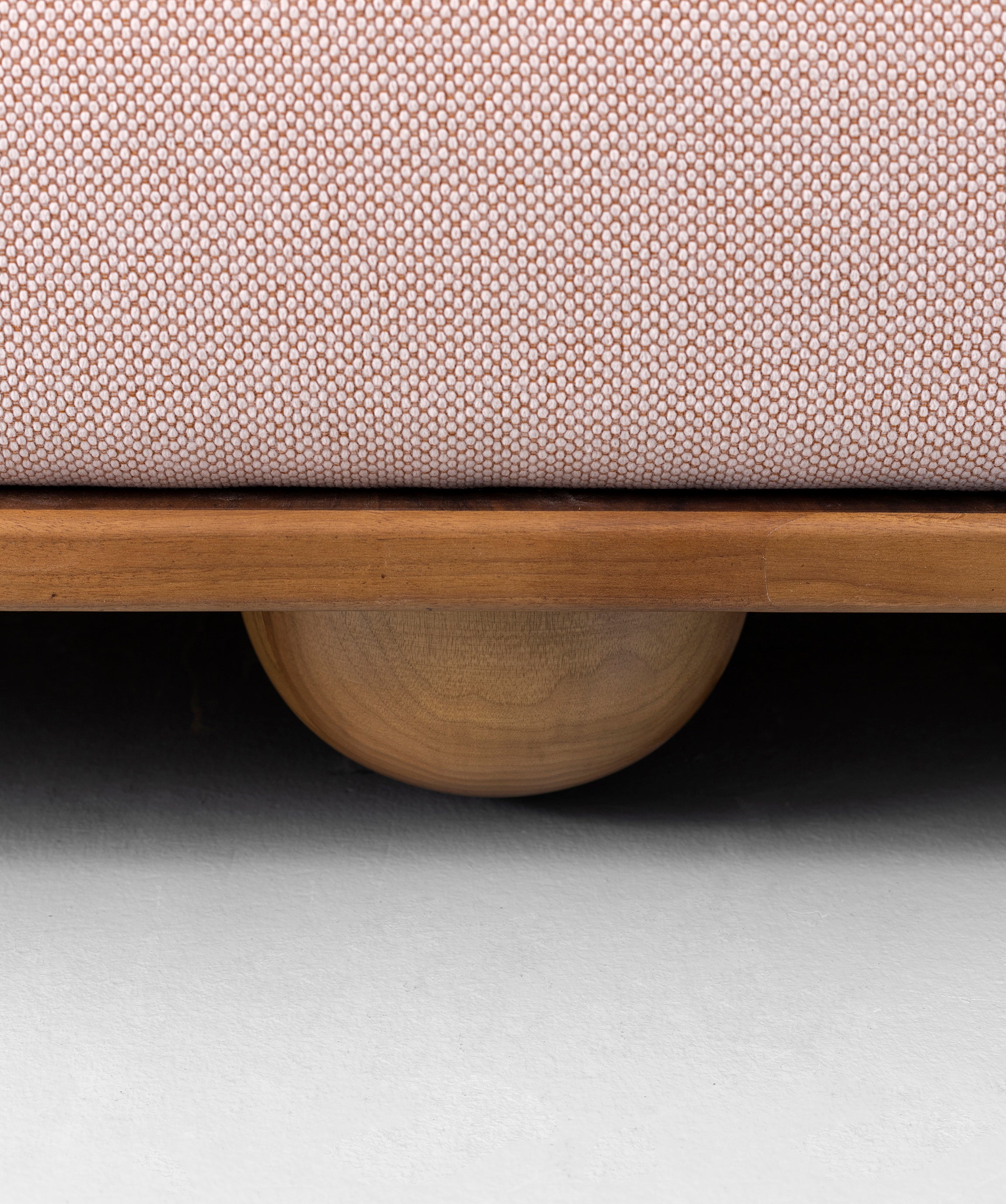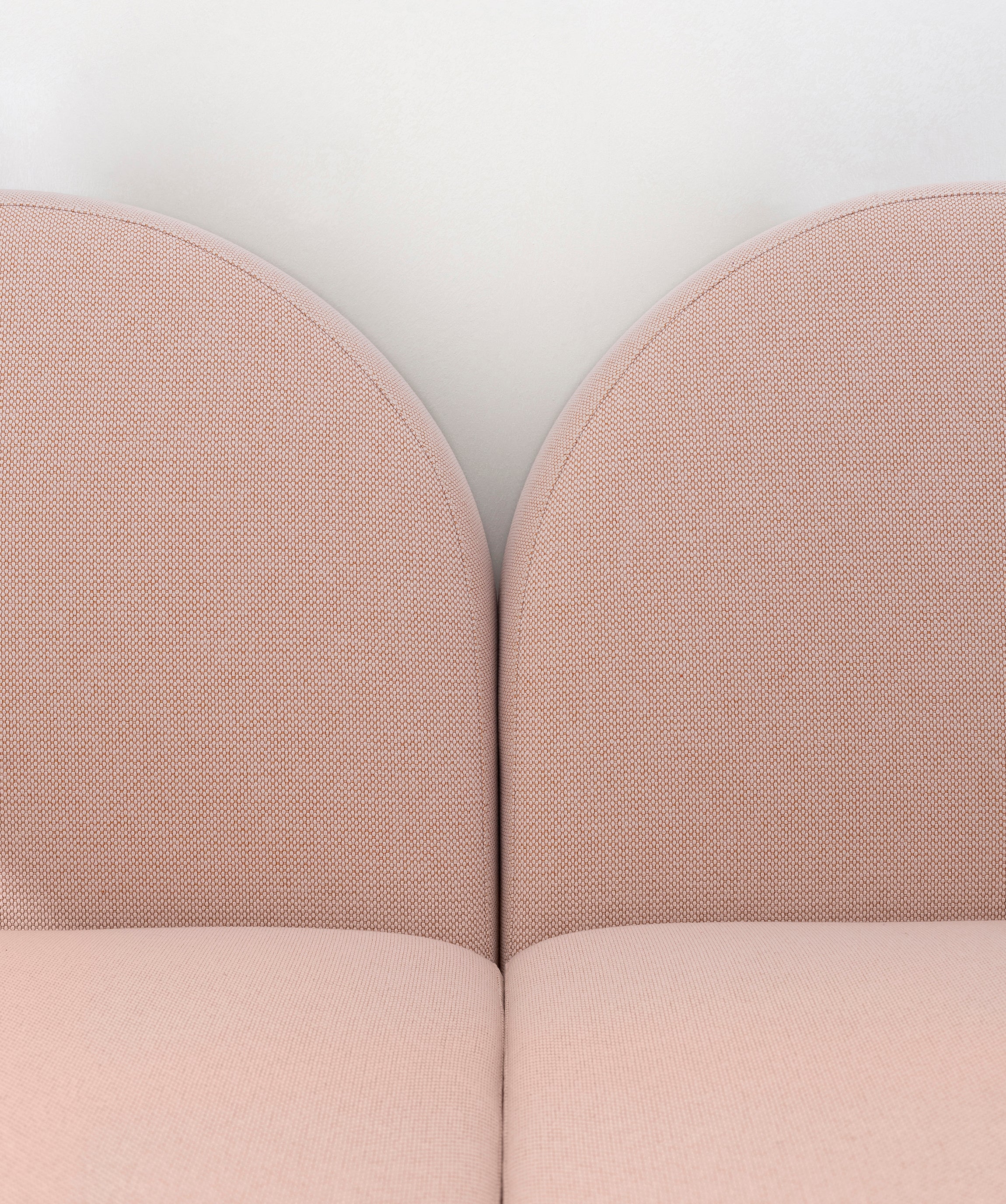 BEICE is a 3 seater sofa designed to mimic the feeling of sitting on cotton candy clouds. The combination of its powder pink color, arc shaped back rests, round edges and sphere walnut feet creates a dreamy, tender design. It is wide enough to lay down and soft enough to sleep on. BEICE is entirely hand-crafted, the base and feet are constructed from solid walnut and upholstery made from Kvadrat fabric.