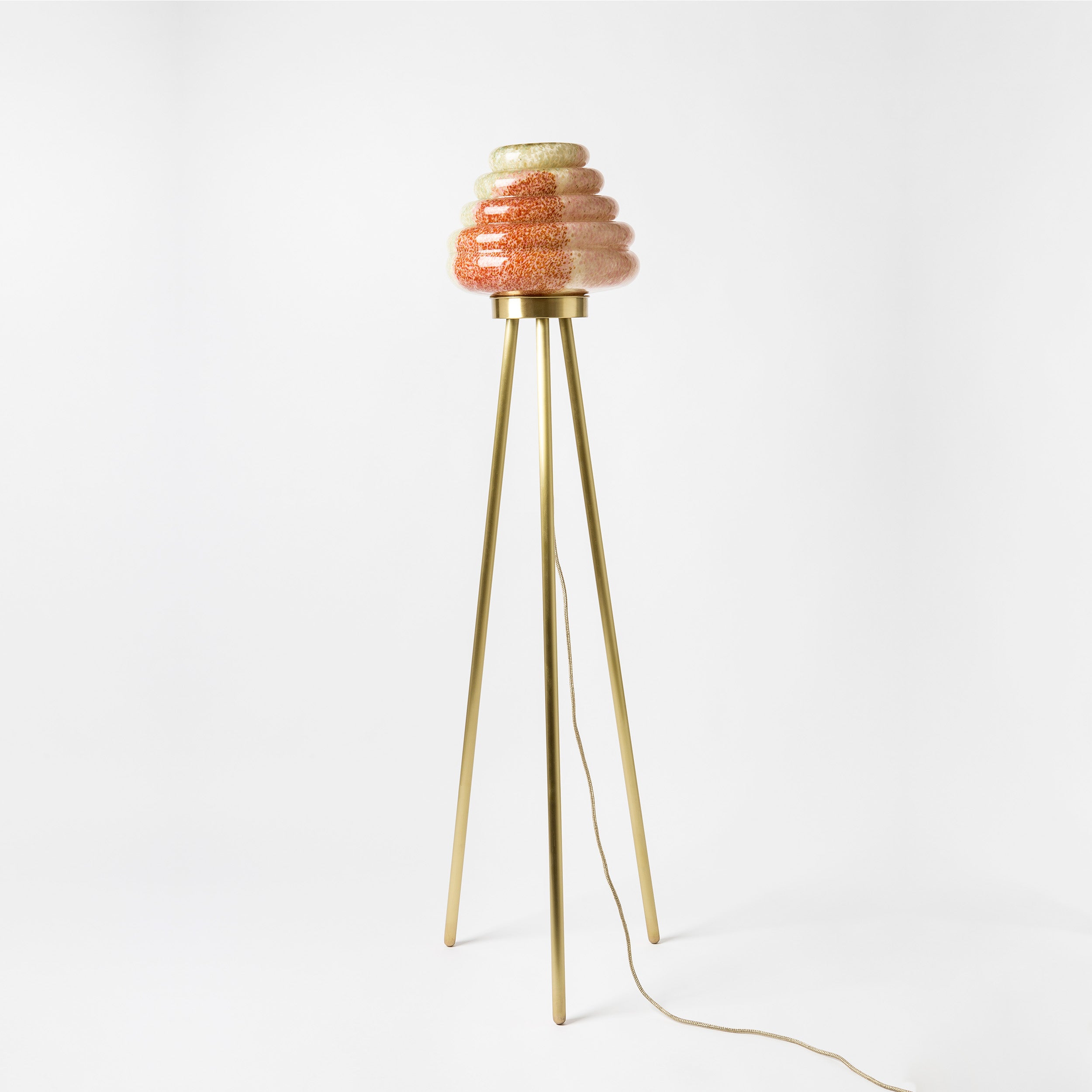 This beehive inspired floor lamp comprises a mixed colored hand-blown glass shade and different combinations of wood veneer legs and copper. Second version of Colmena has the dotted patterned glass shade and matte brass legs. The light is adjustable by the dimmer. Each piece is unique and custom made.