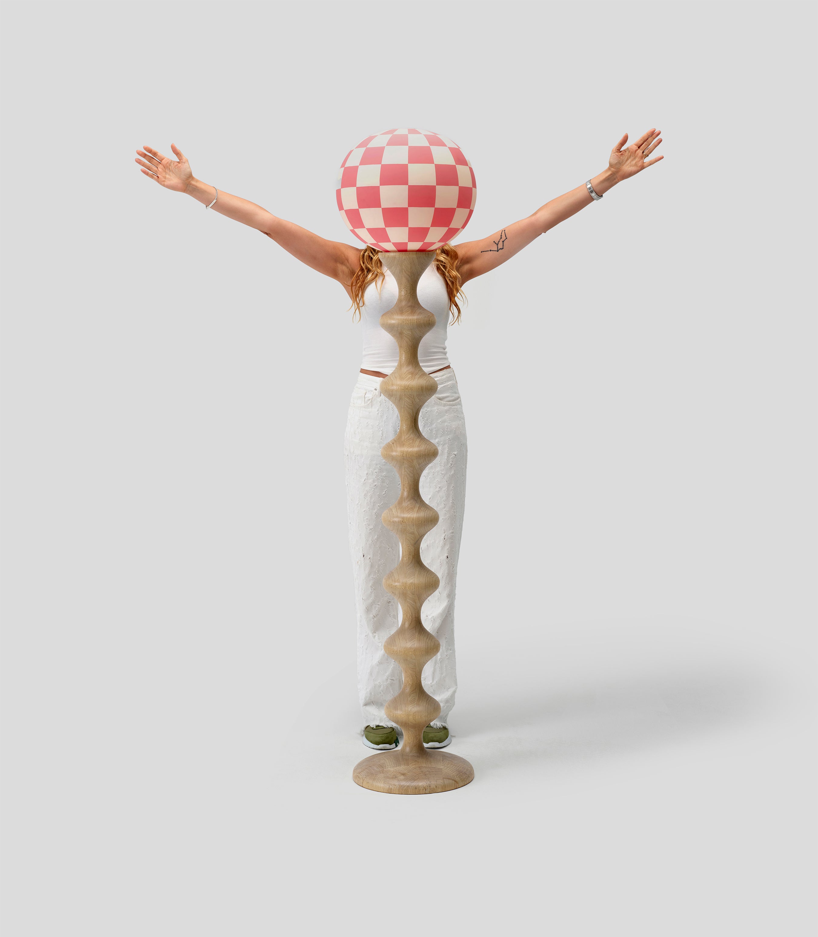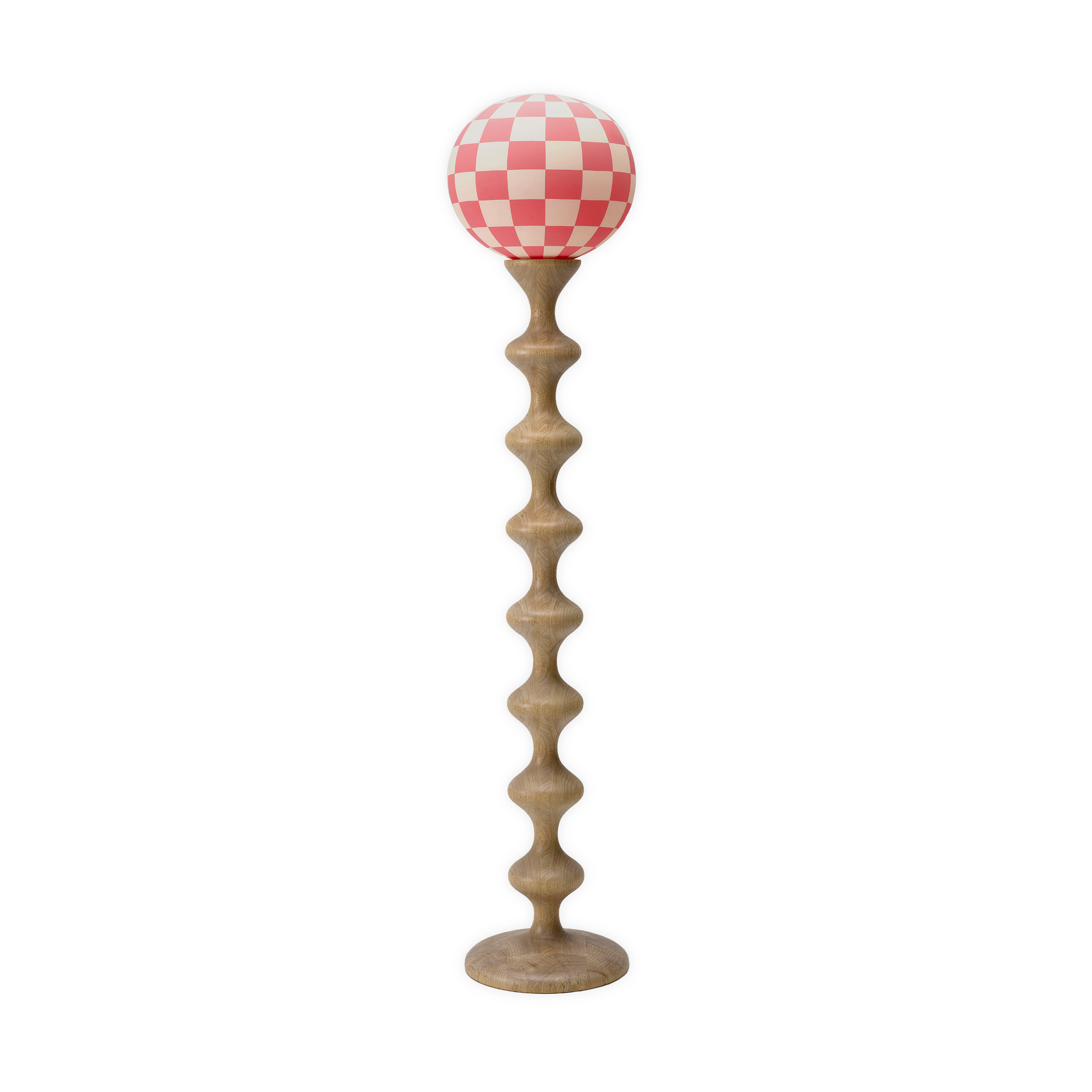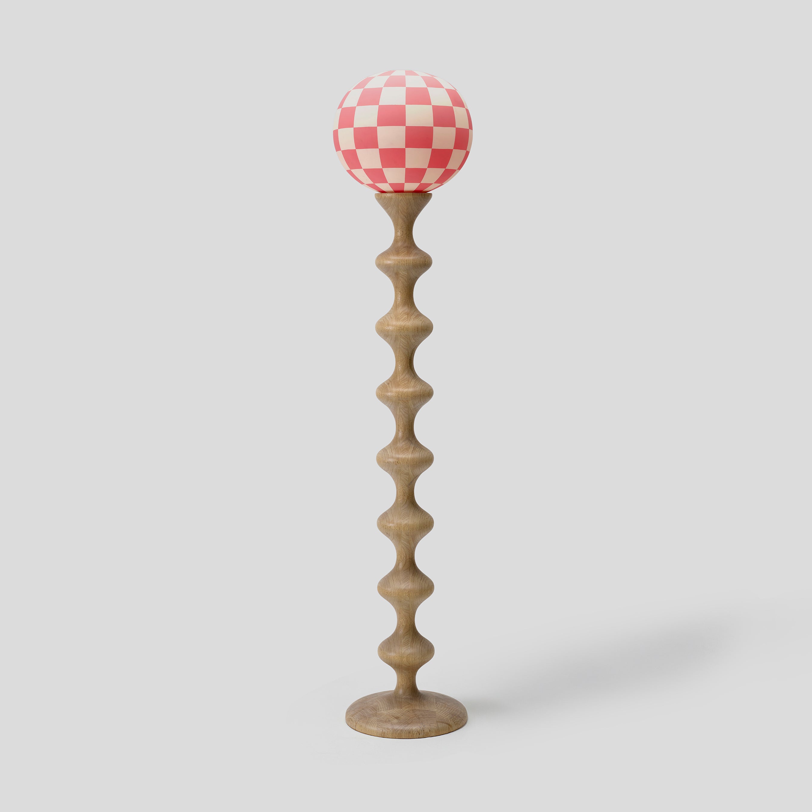 “The Hozkal Floor Lamp” is a striking, checkered glass balloon that brings a sense of whimsy and wonder to any space. This handcrafted sculptural piece evokes the dream of soaring in a hot air balloon. The bold contrast between the oversized glass head and the lathed wooden body introduces a refreshing, unexpected character to your home. The glass is meticulously handblown and hand-painted by skilled artisans in Turkey, and it can be made in a variety of colors. The wooden base is available in several finishes: light wood, blue-painted wood, or a deeper, darker wood option. As a collectible design and limited edition piece, the Hozkal Floor Lamp is sure to bring lasting joy to its owner.