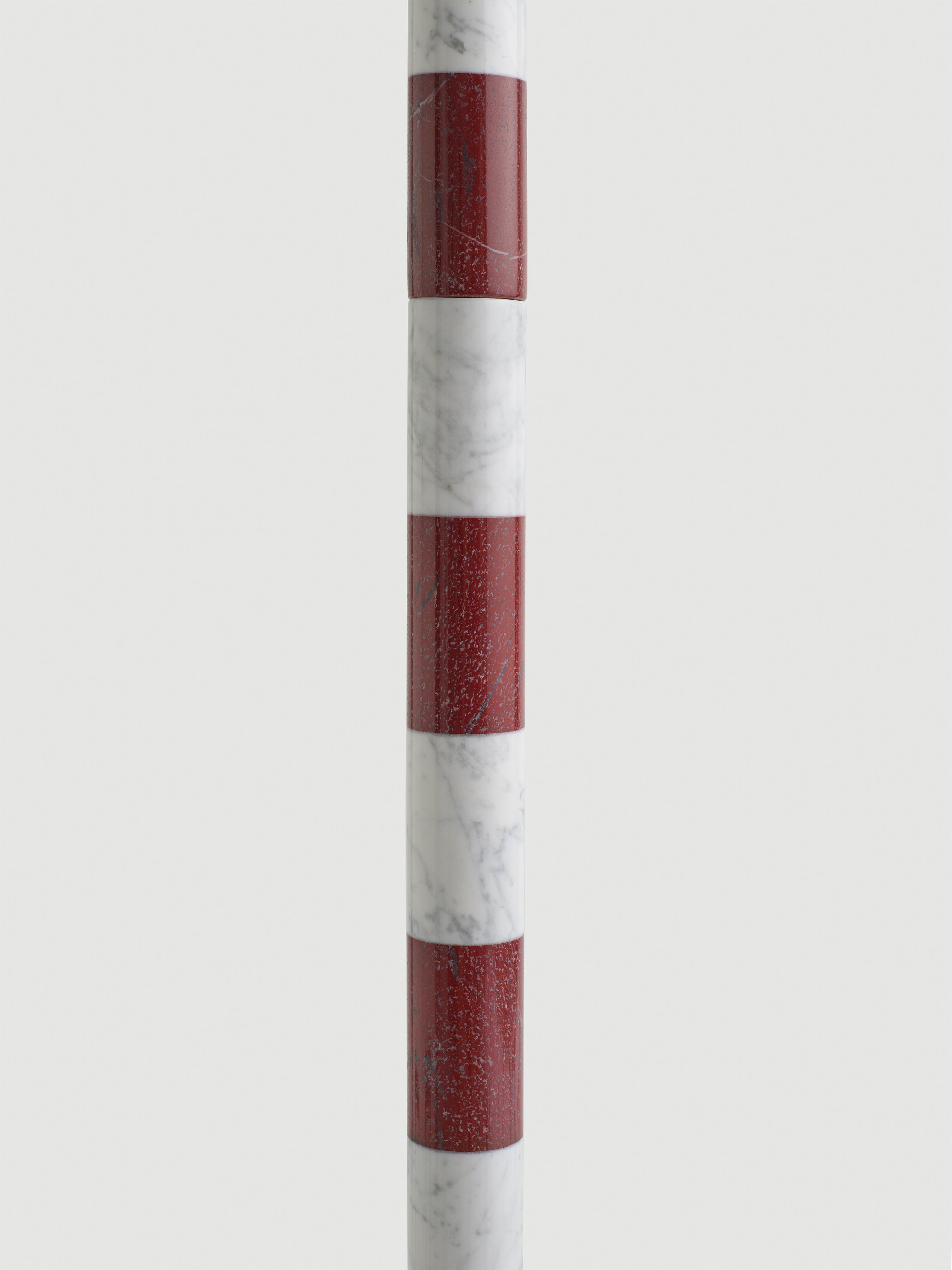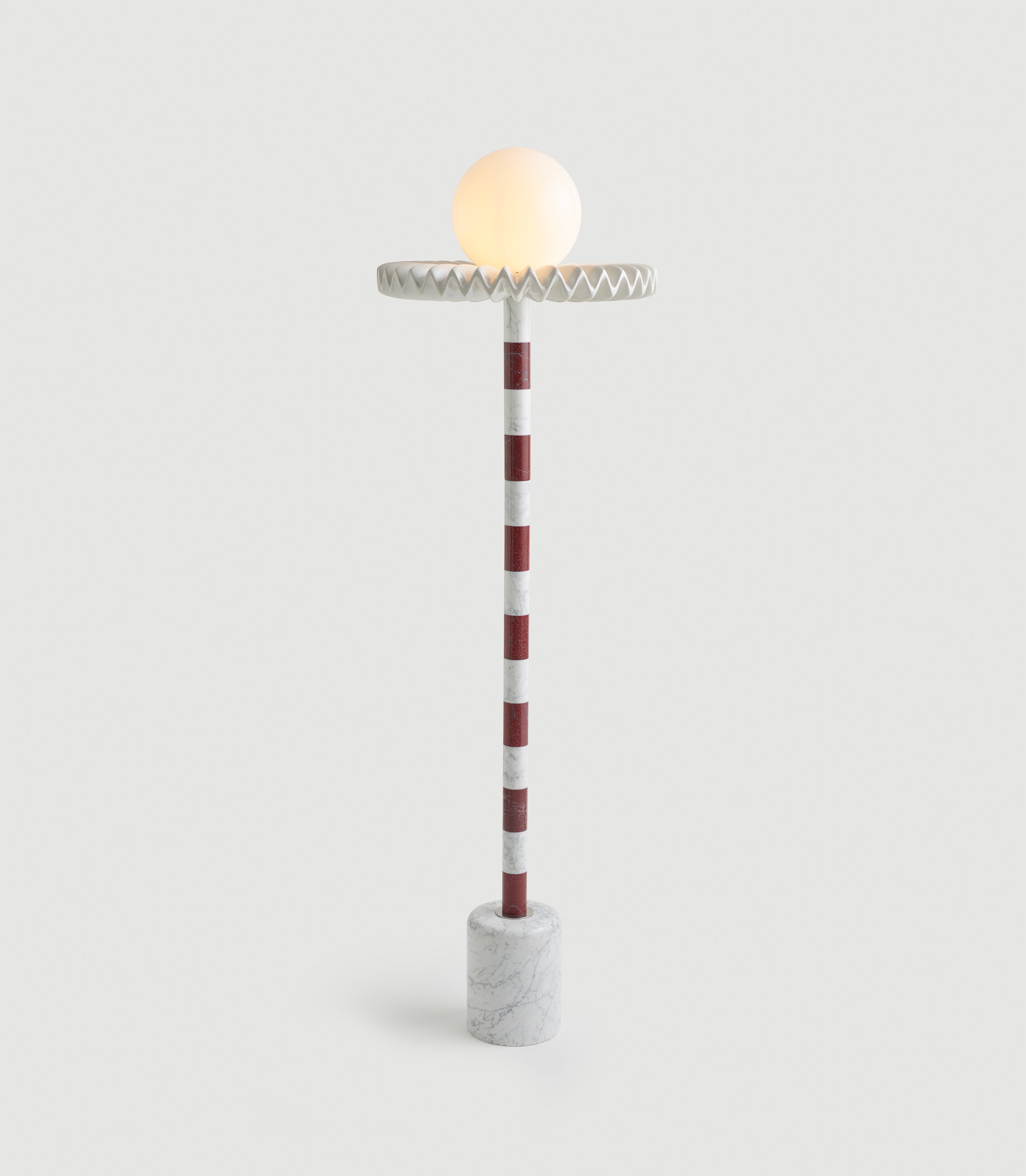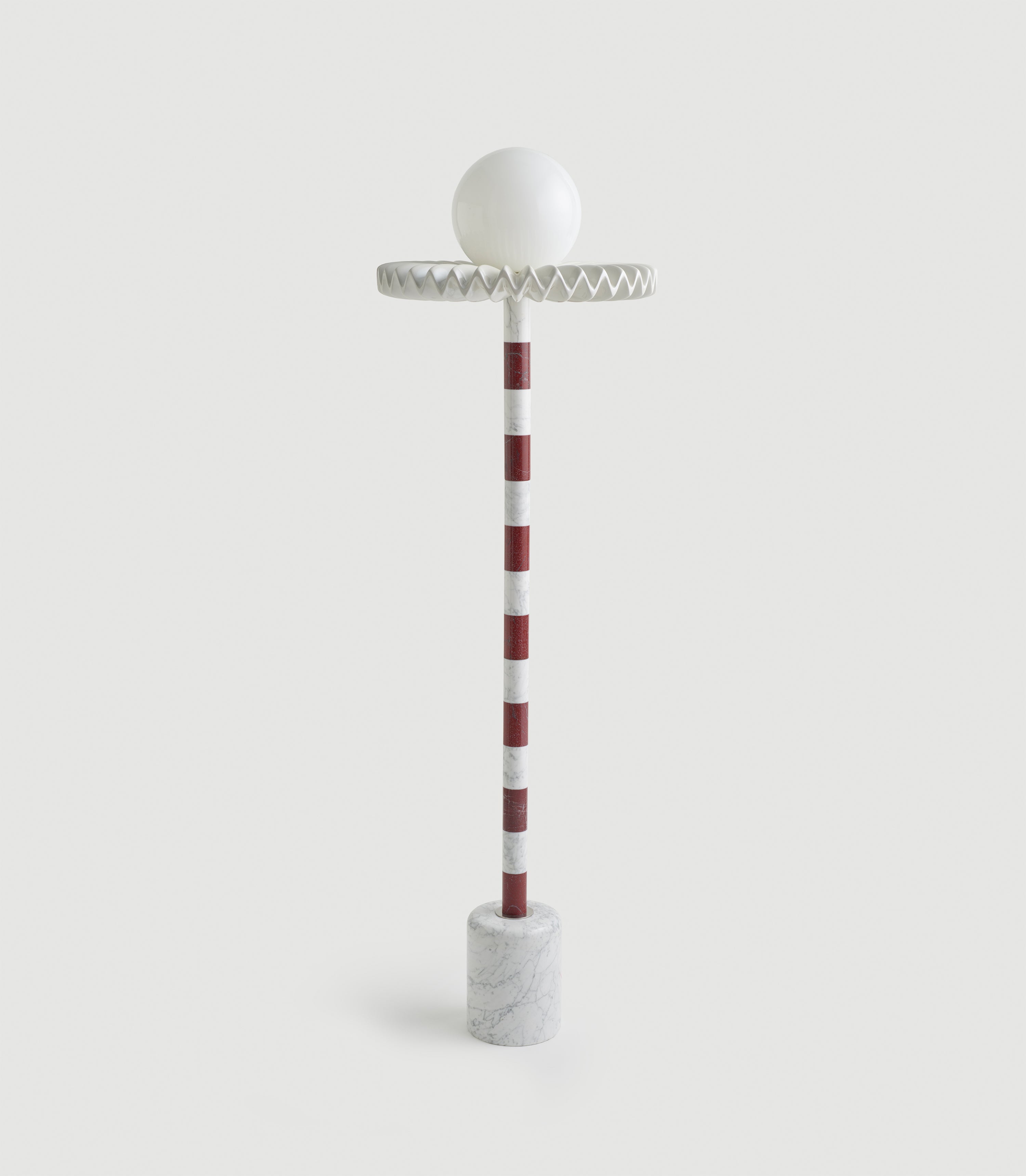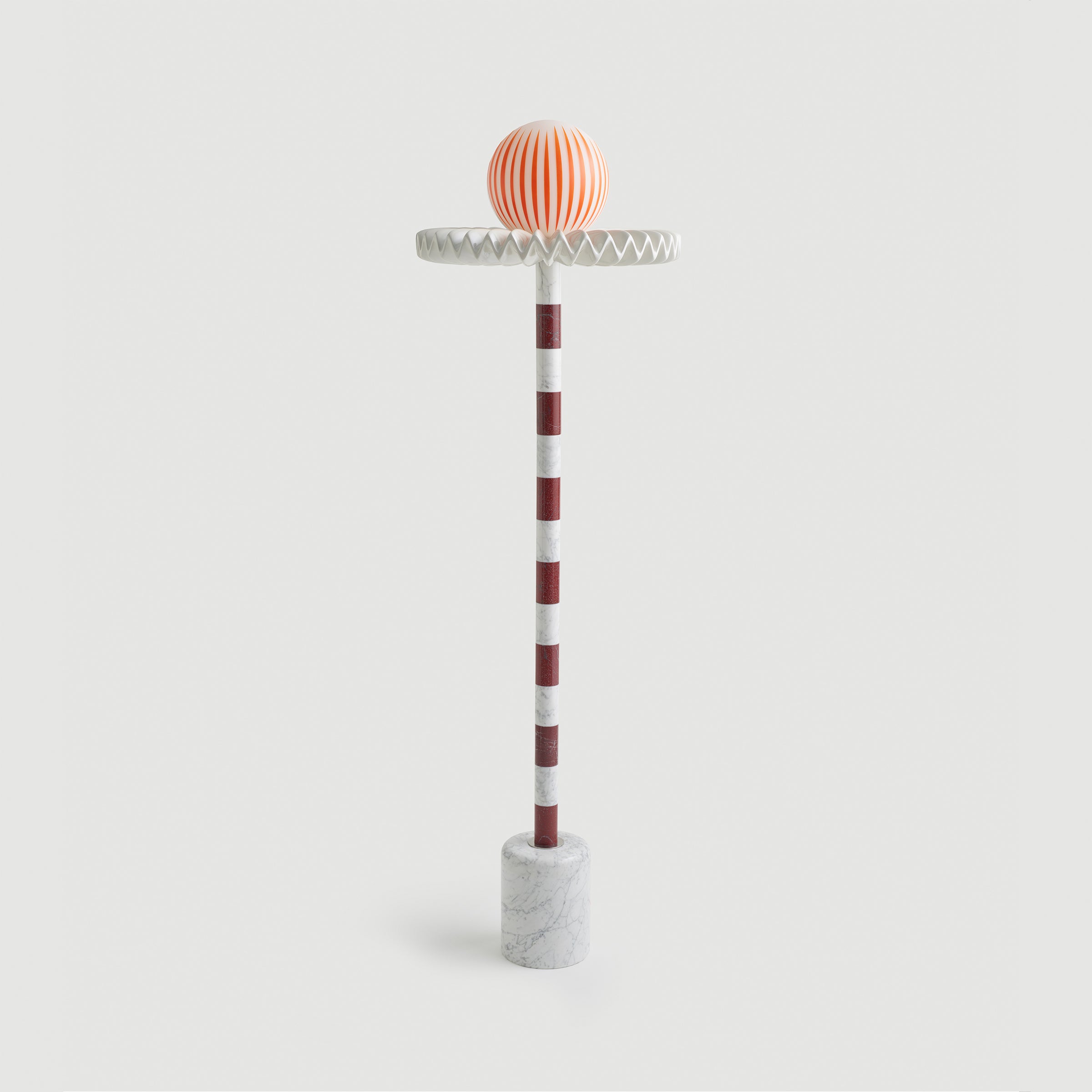 “Sare” is a floor lamp inspired by the 17th Century ruff collar which was a symbol of wealth and status. It also resembles the silent clown “Pierrot” with it’s striped marble body and round glass head. Sare is handcrafted and assembled with different colors of marble stem connecting the top part with the cylindrical marble block base. A pearl colored polyurethane piece connects the body and the milk glass top. The spherical glass head piece comes in a simple milk glass and in a blue and a red hand-painted striped glass. Sare is a reflection of our inner noble clown.