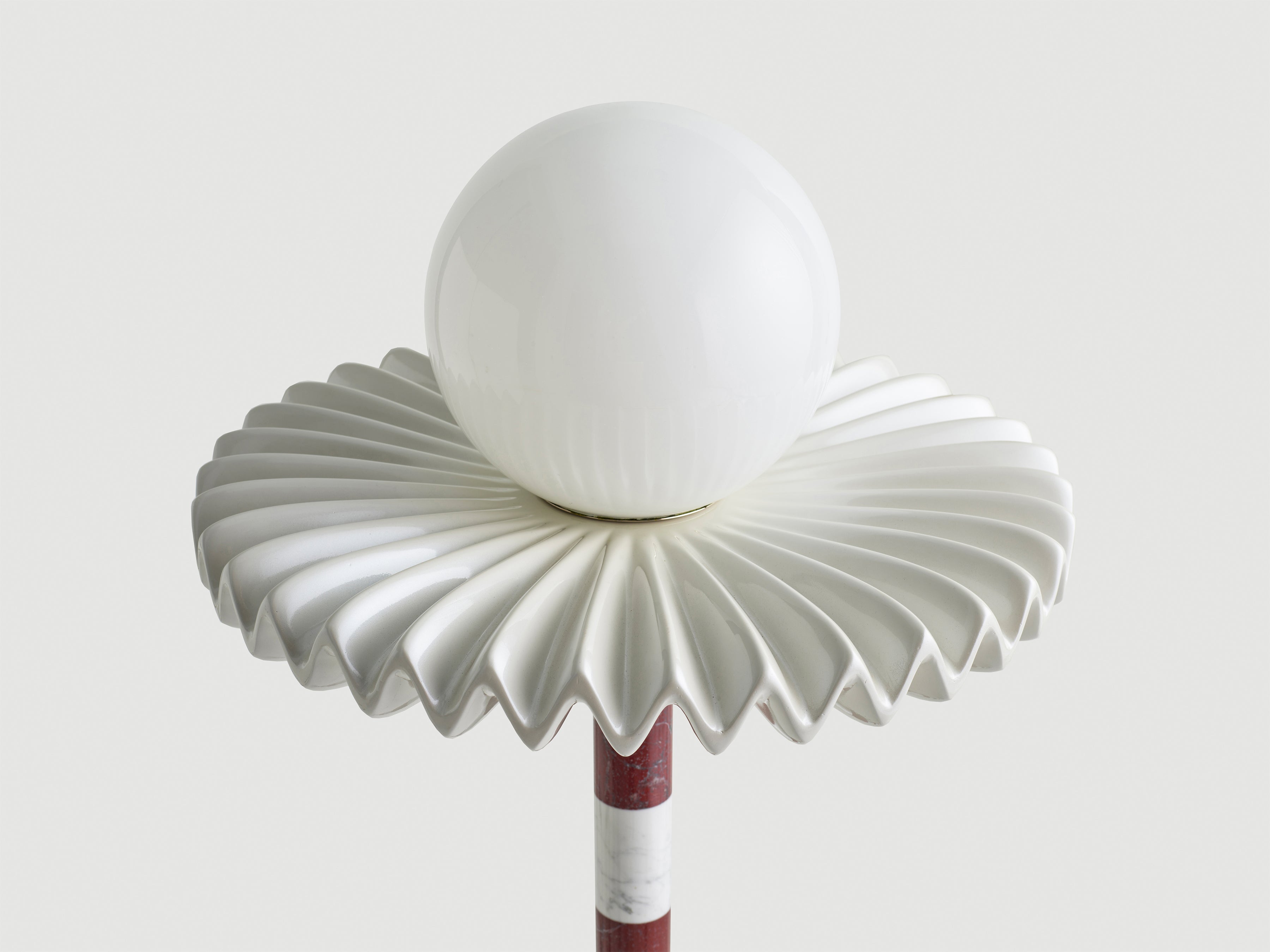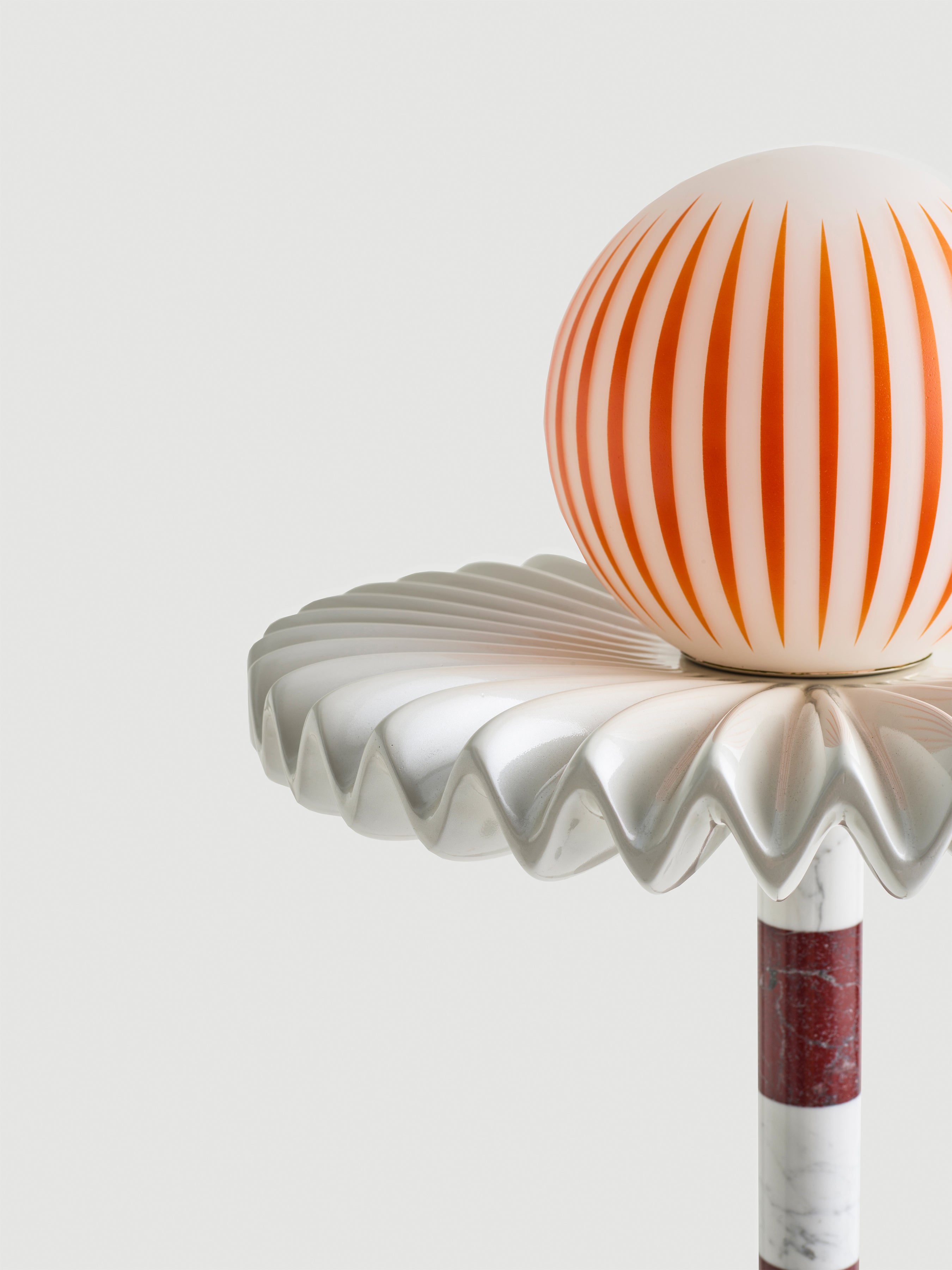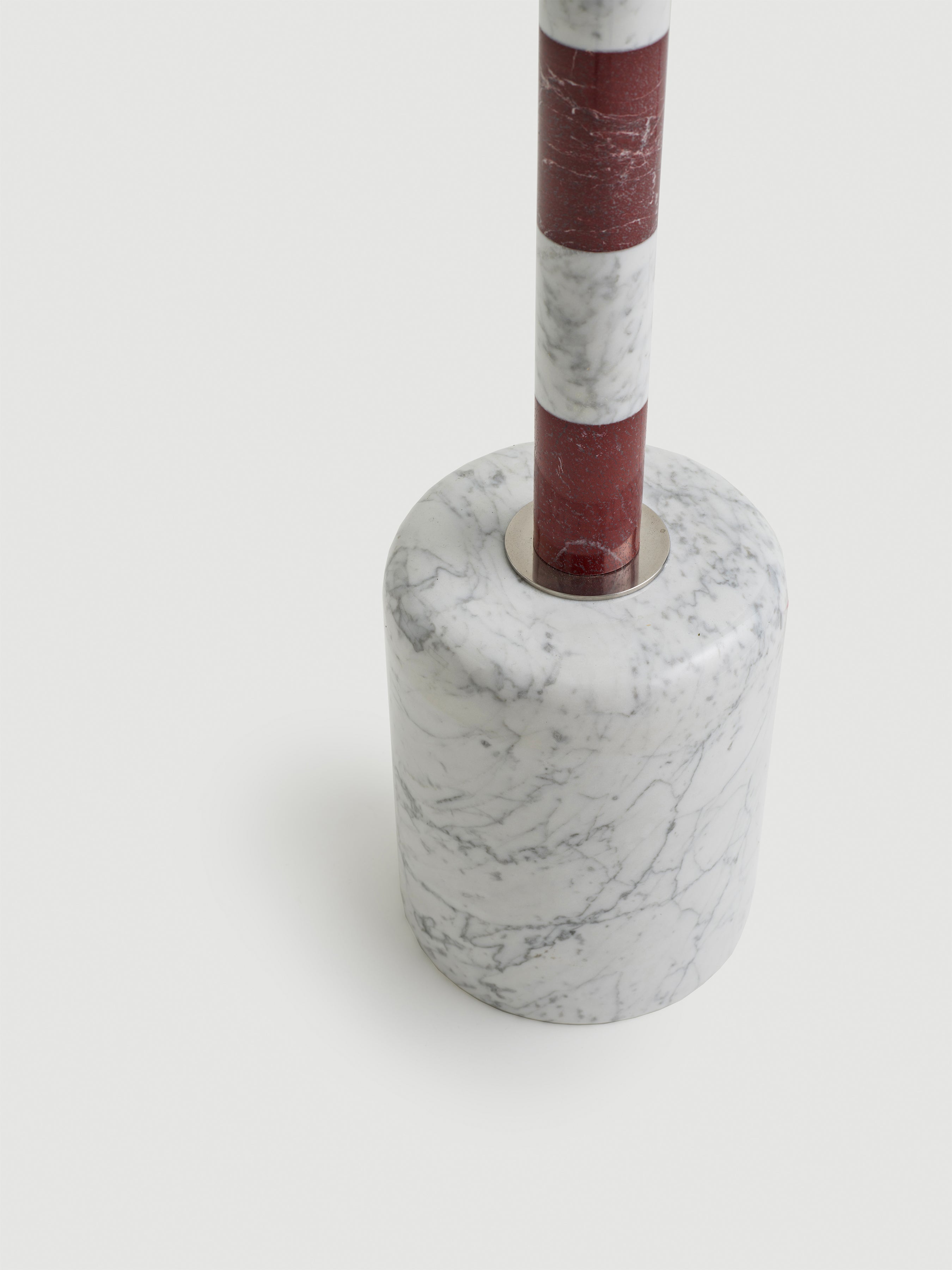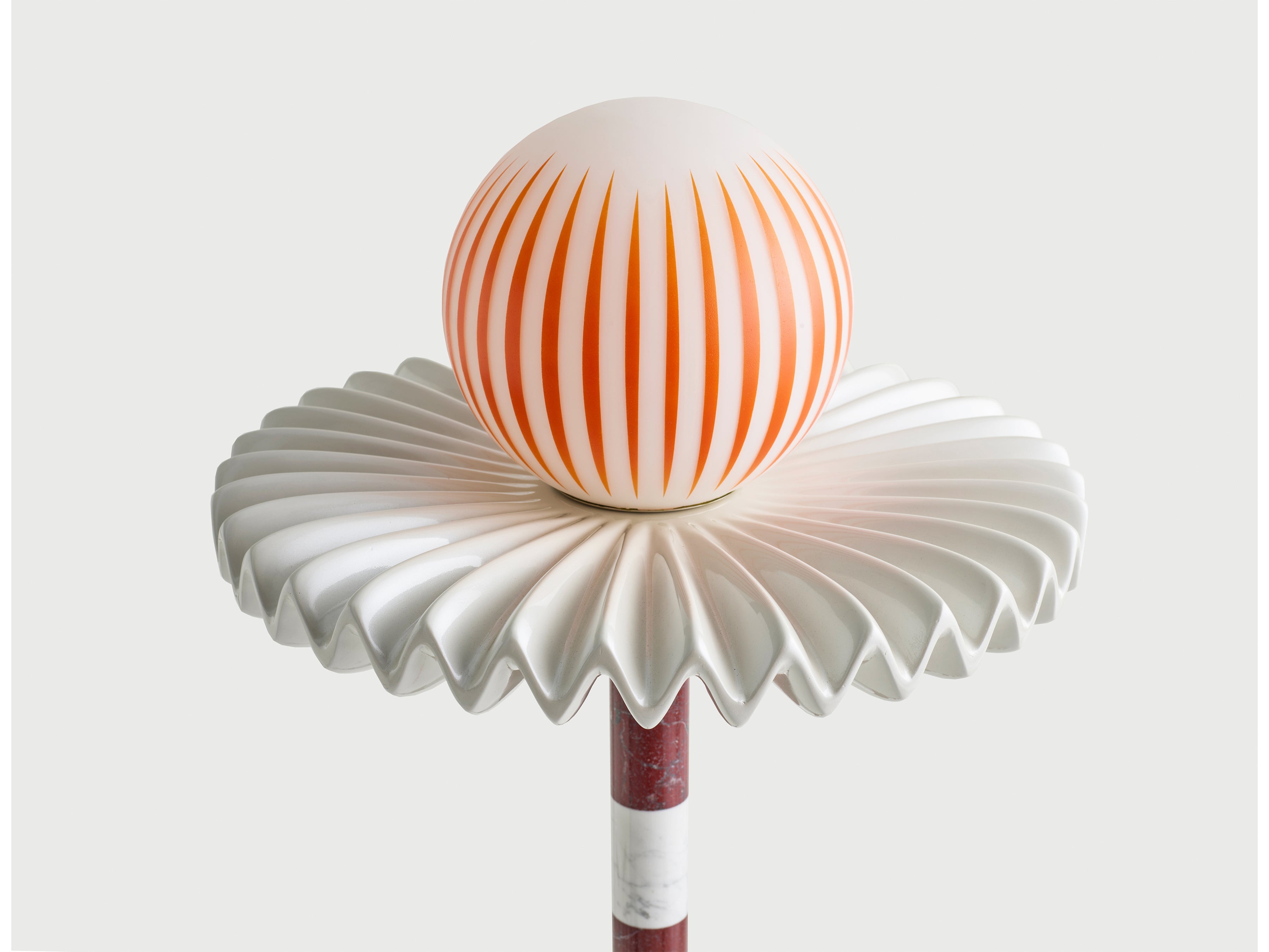 “Sare” is a floor lamp inspired by the 17th Century ruff collar which was a symbol of wealth and status. It also resembles the silent clown “Pierrot” with it’s striped marble body and round glass head. Sare is handcrafted and assembled with different colors of marble stem connecting the top part with the cylindrical marble block base. A pearl colored polyurethane piece connects the body and the milk glass top. The spherical glass head piece comes in a simple milk glass and in a blue and a red hand-painted striped glass. Sare is a reflection of our inner noble clown.