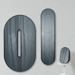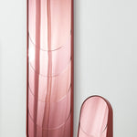 Baggage Claim – M is a round tabletop makeup mirror that combines functionality with artistic flair. Its unique sculptural form allows it to stand securely on any surface, making it both practical and visually striking. Framed in colored MDF and accented with overlapping vibrant slices of tinted mirror, it transforms an everyday object into a creative centerpiece.