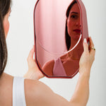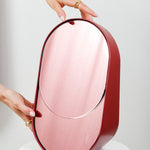 This piece is part of the Baggage Claim Mirrors series, which includes two full-length mirrors and this tabletop version, all available in six bold color combinations.