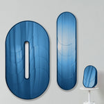 Baggage Claim – M is a round tabletop makeup mirror that combines functionality with artistic flair. Its unique sculptural form allows it to stand securely on any surface, making it both practical and visually striking. Framed in colored MDF and accented with overlapping vibrant slices of tinted mirror, it transforms an everyday object into a creative centerpiece.