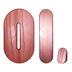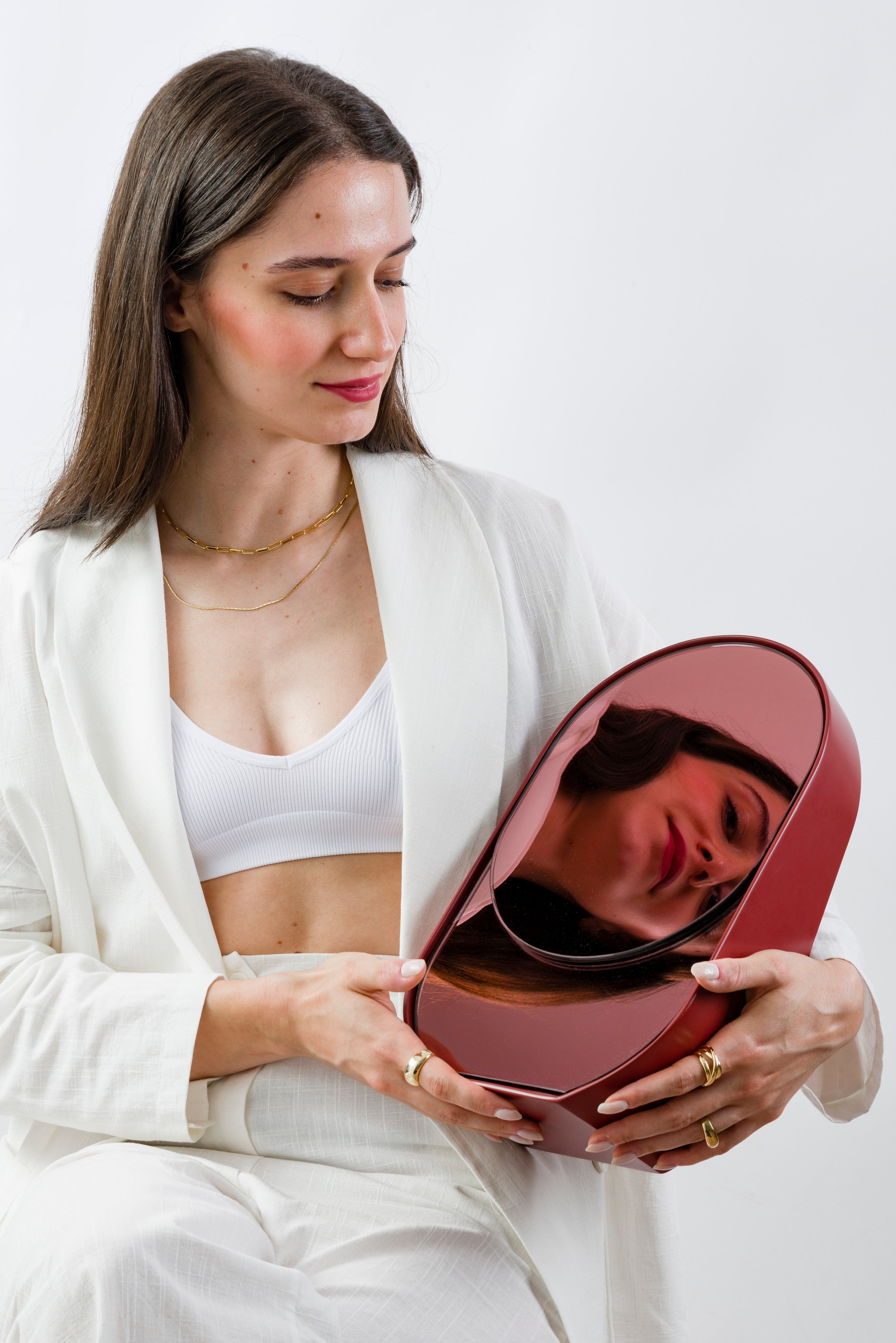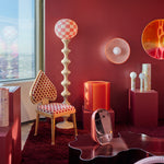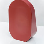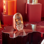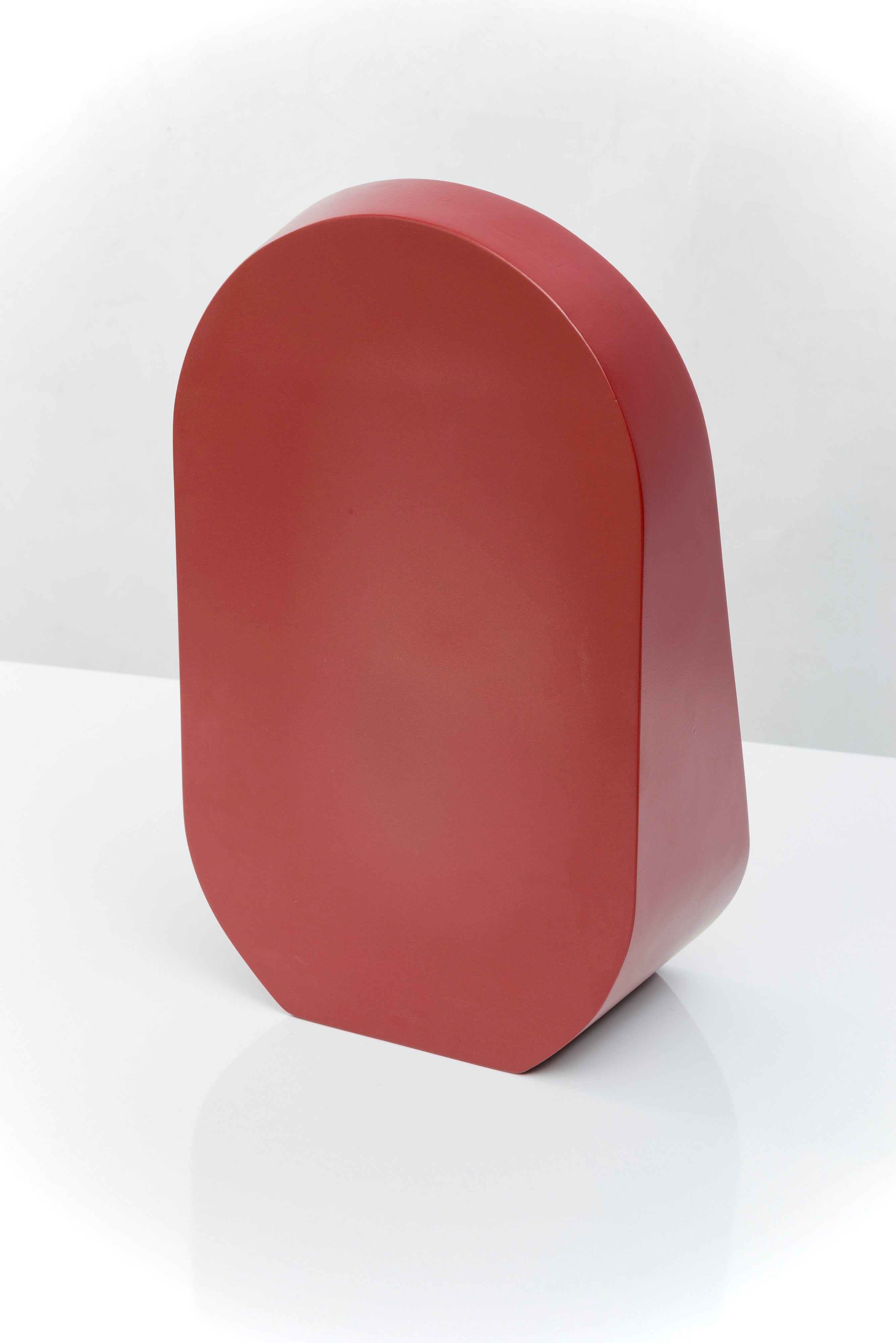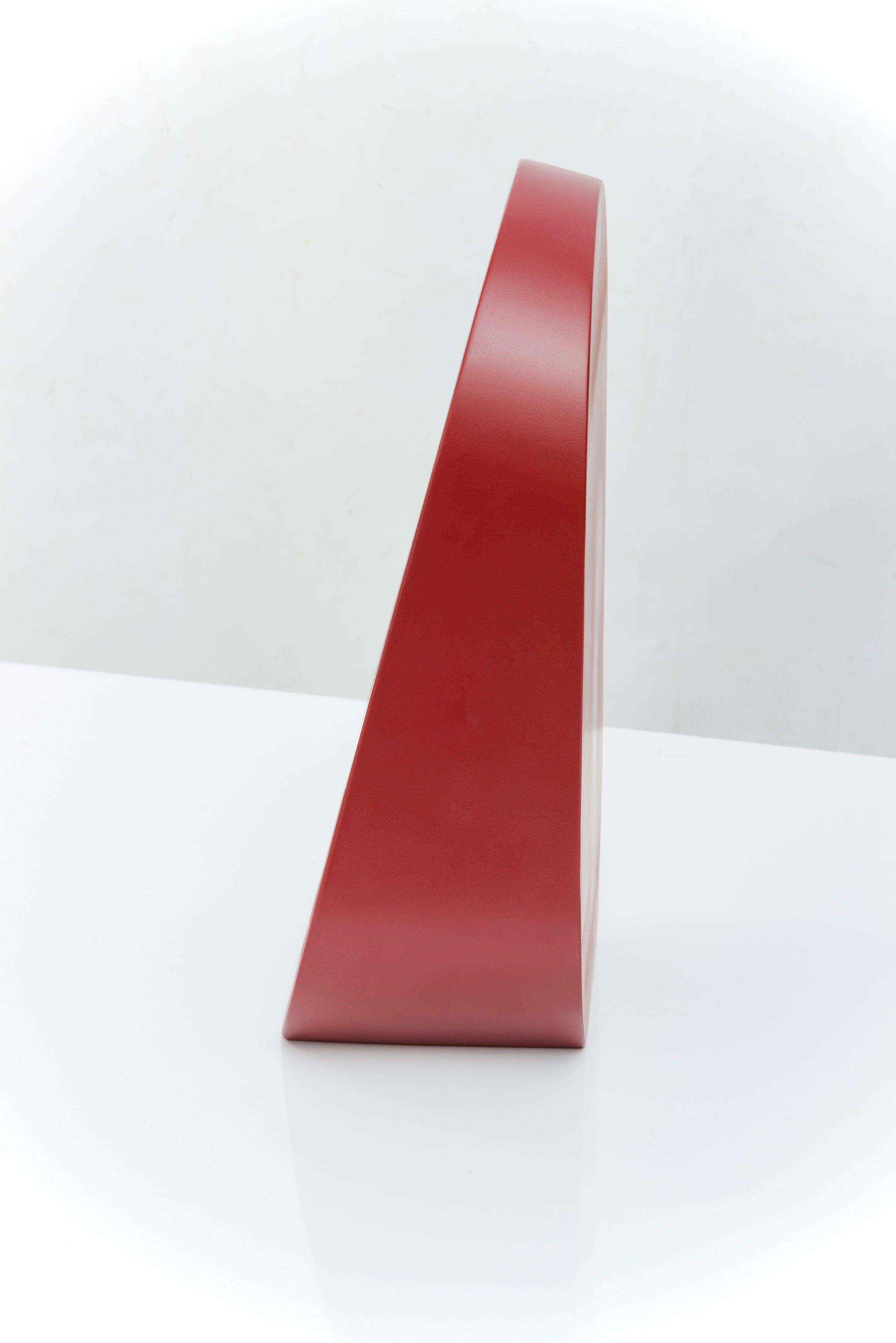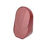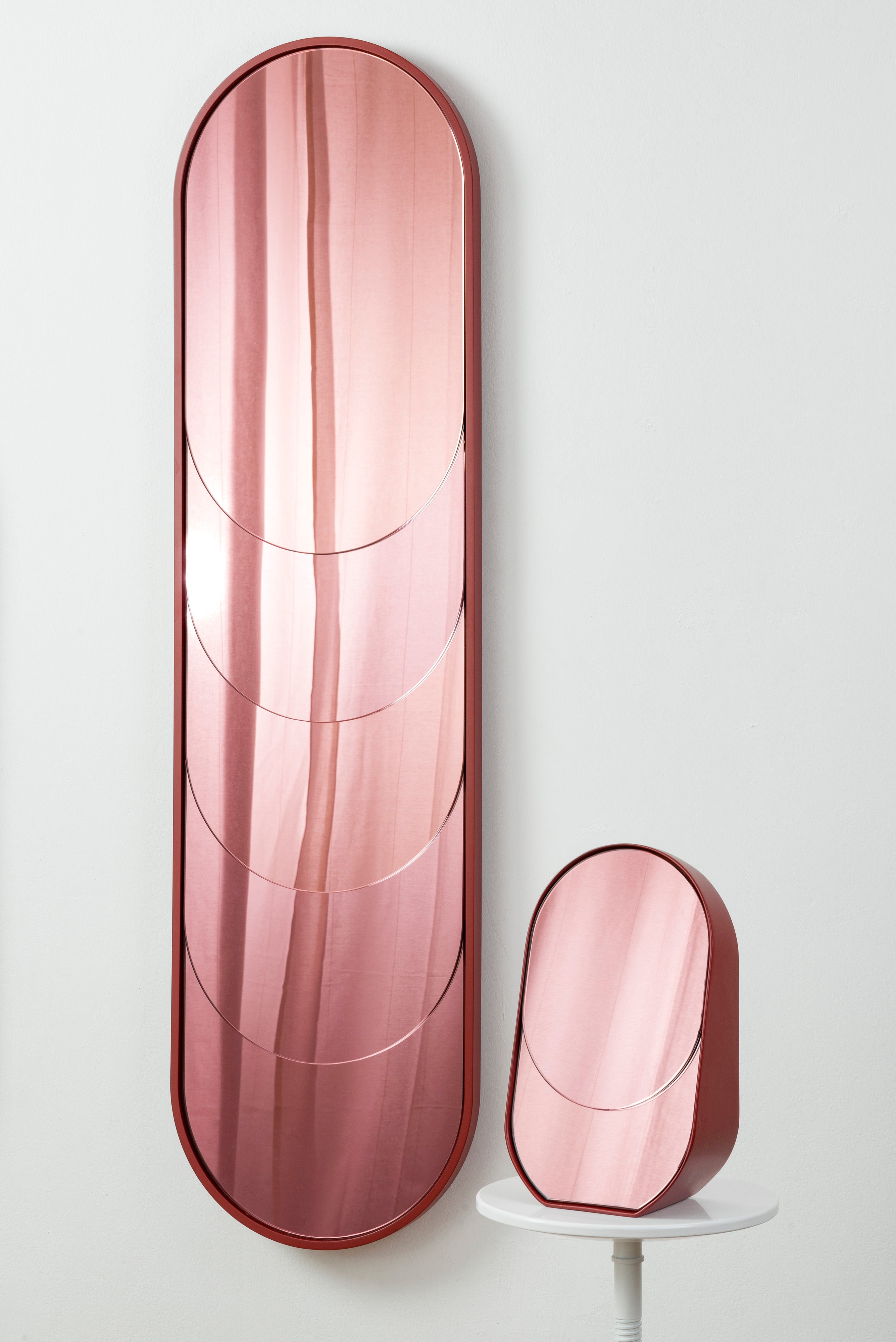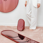 Baggage Claim – M is a round tabletop makeup mirror that combines functionality with artistic flair. Its unique sculptural form allows it to stand securely on any surface, making it both practical and visually striking. Framed in colored MDF and accented with overlapping vibrant slices of tinted mirror, it transforms an everyday object into a creative centerpiece.