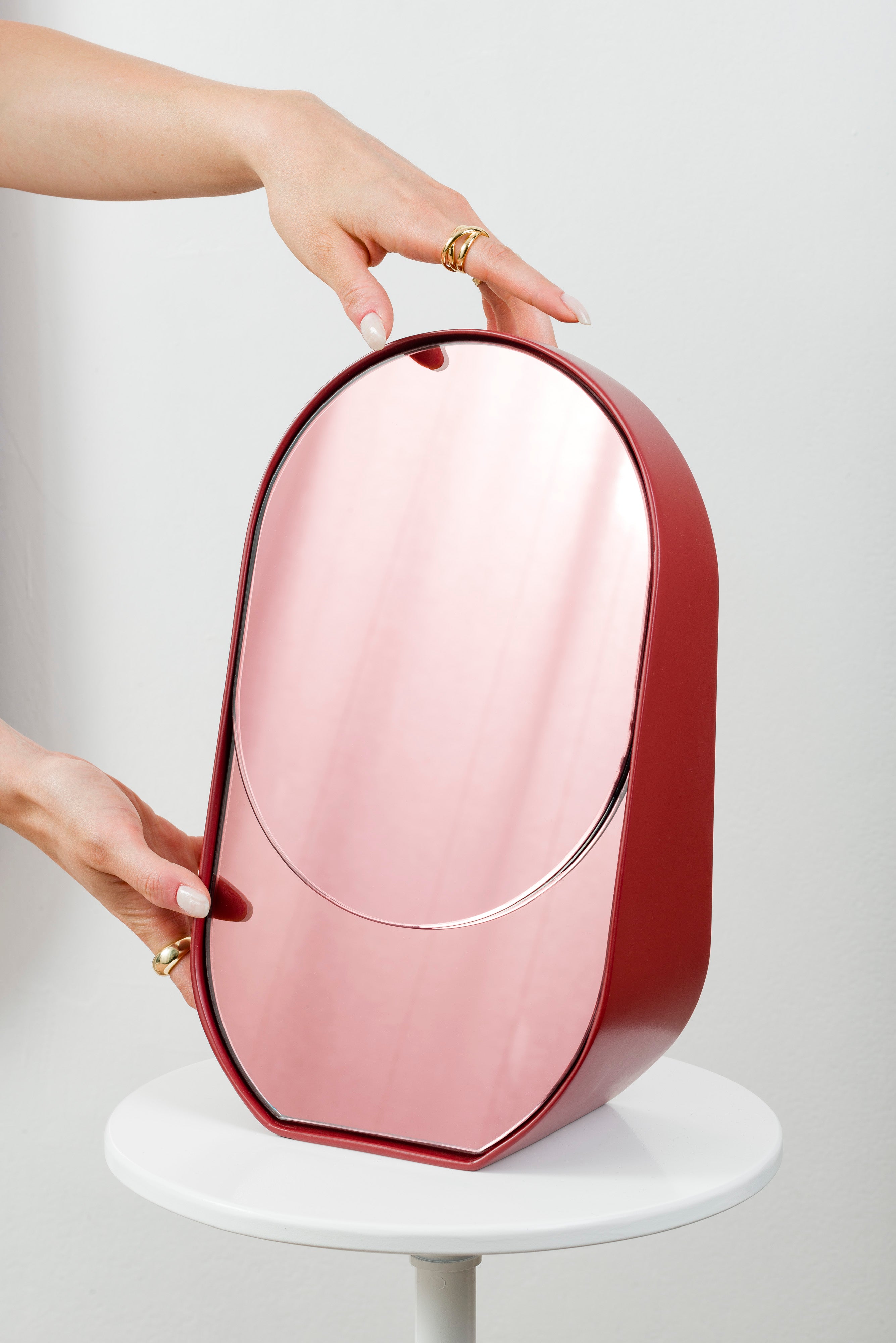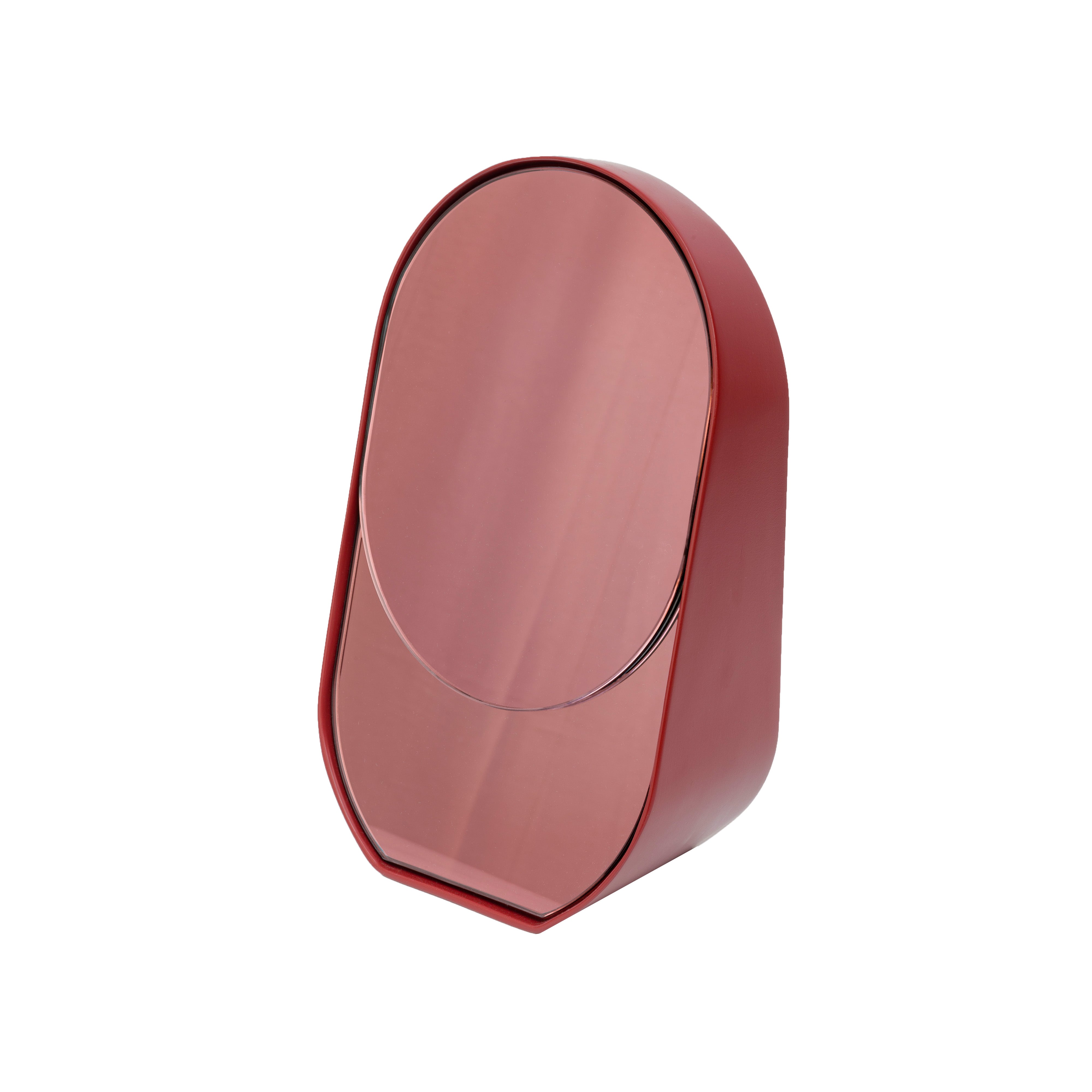 This piece is part of the Baggage Claim Mirrors series, which includes two full-length mirrors and this tabletop version, all available in six bold color combinations.