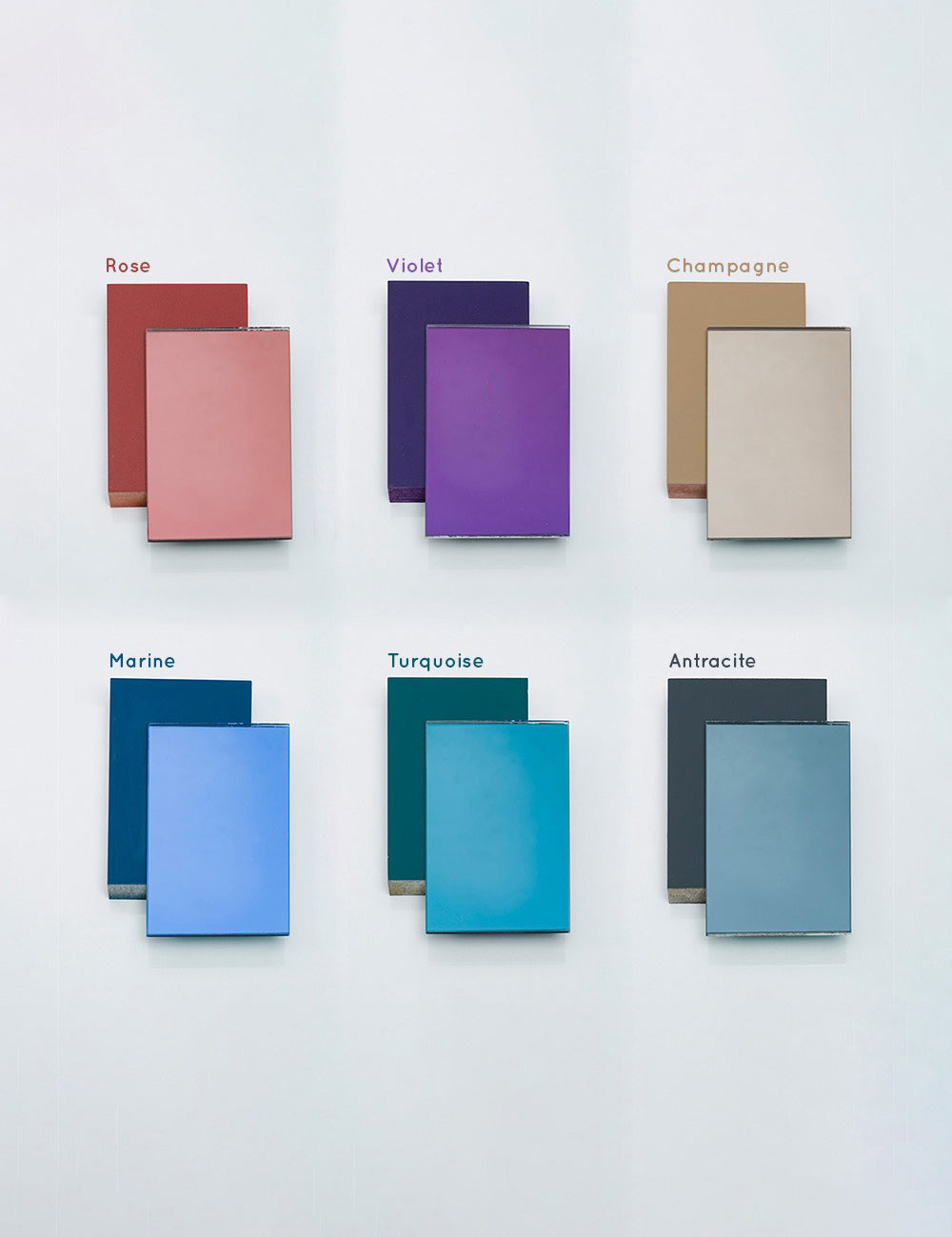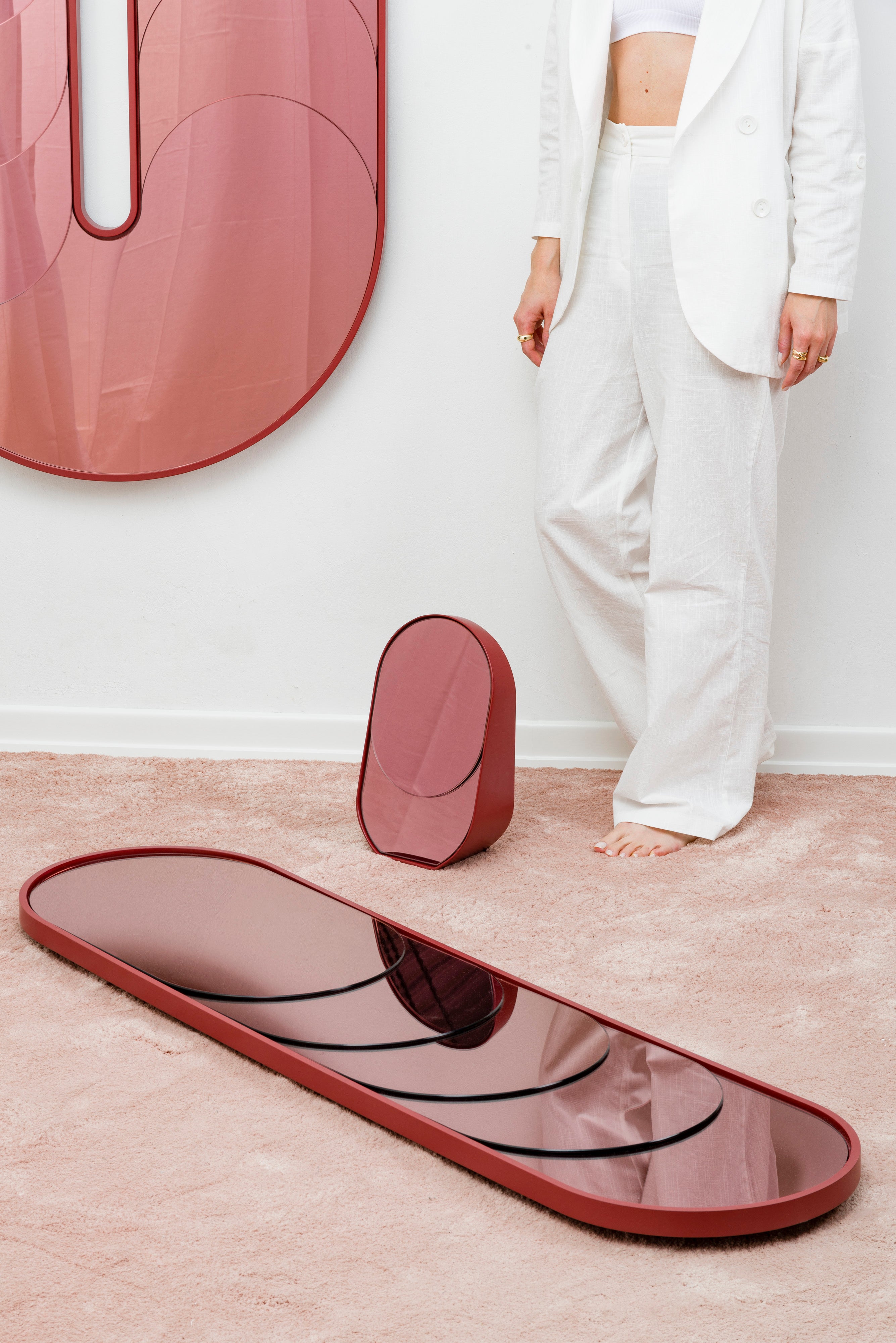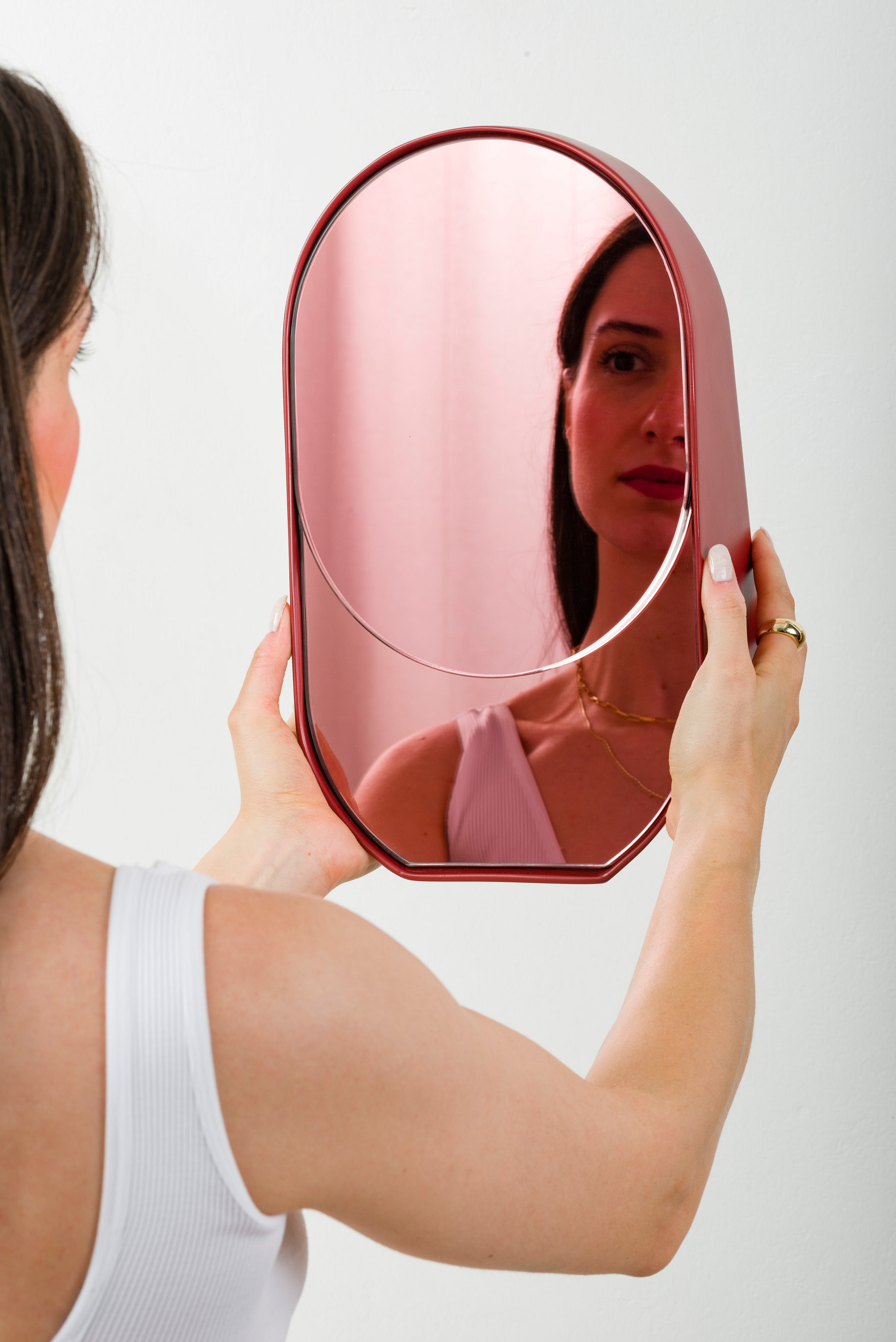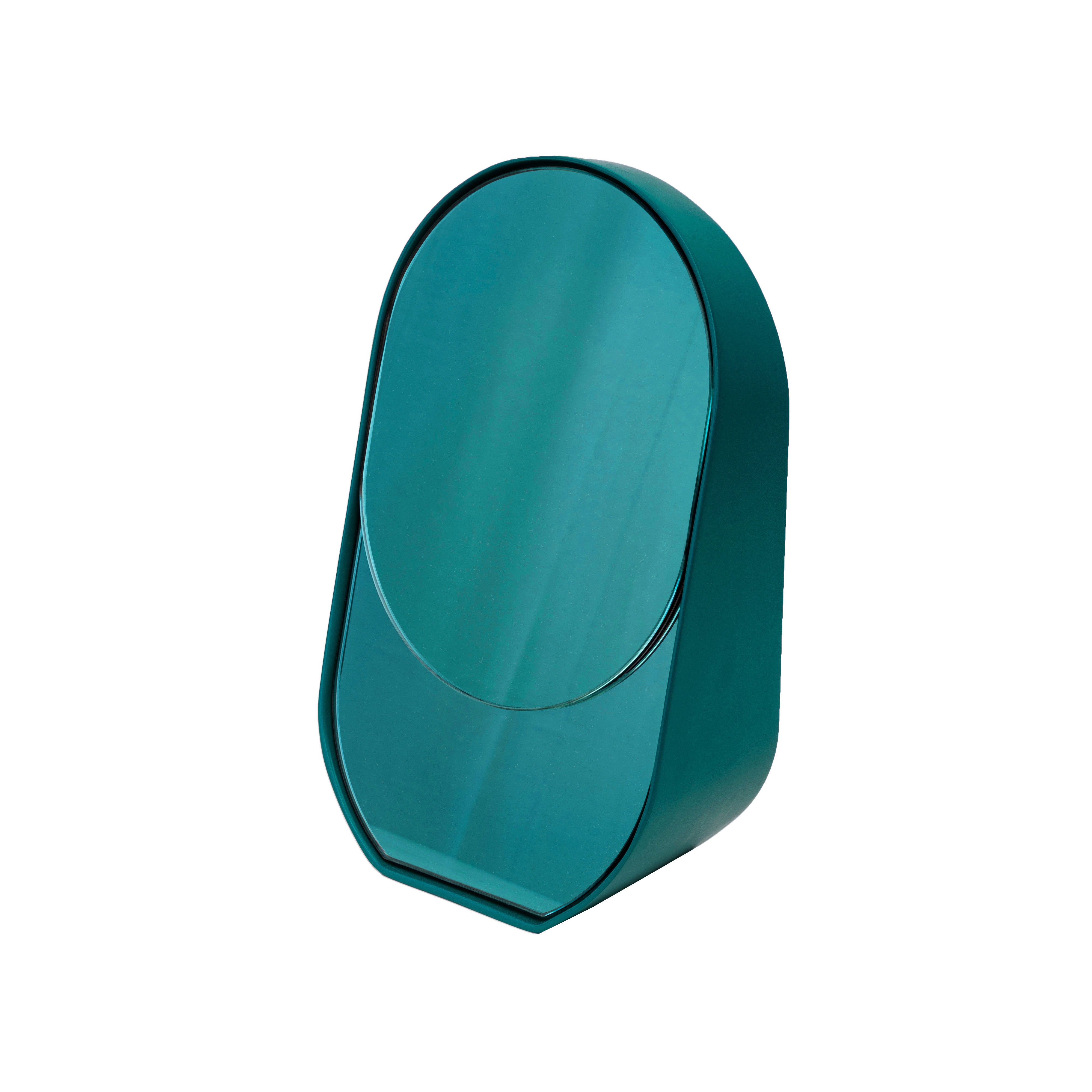 This piece is part of the Baggage Claim Mirrors series, which includes two full-length mirrors and this tabletop version, all available in six bold color combinations.
