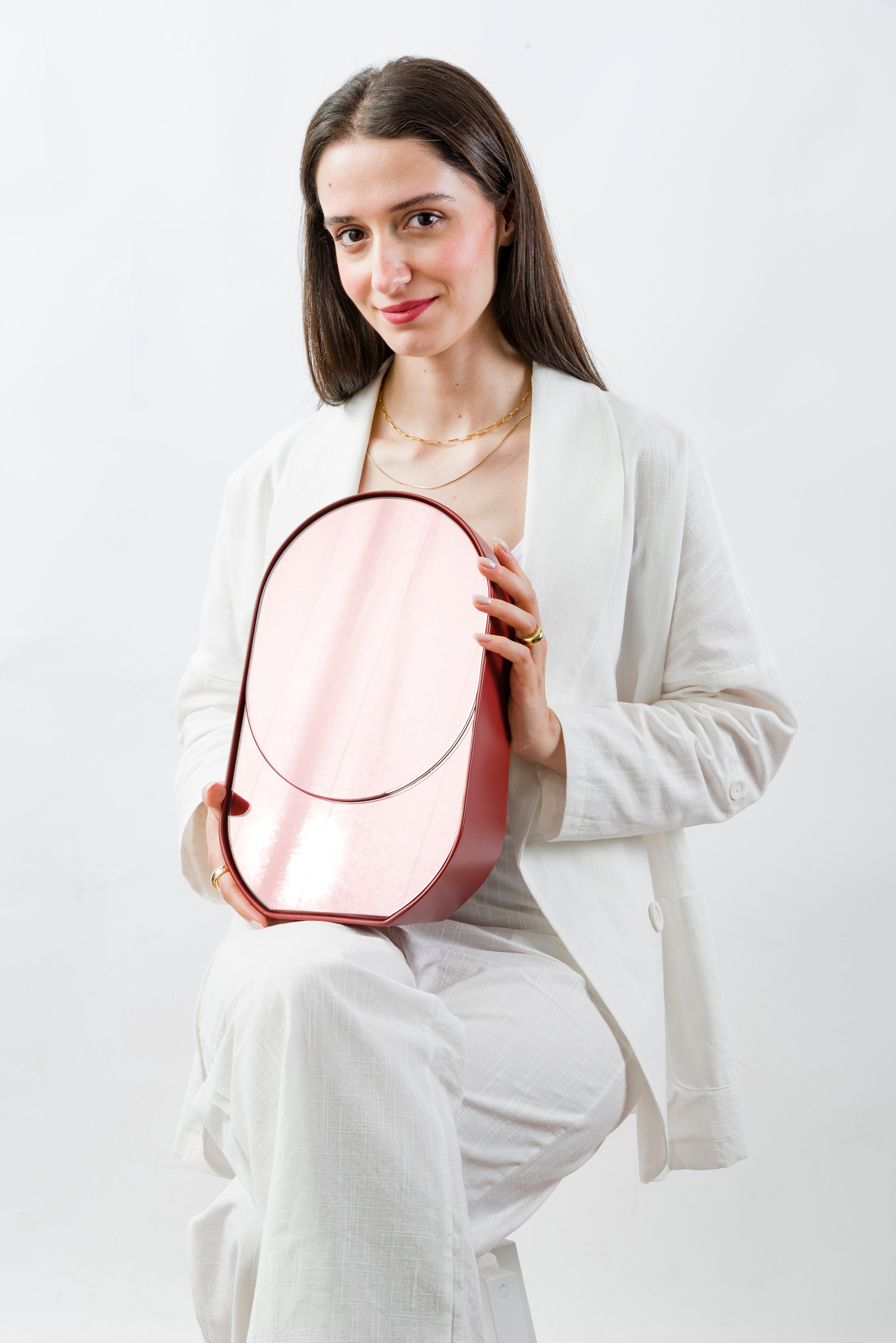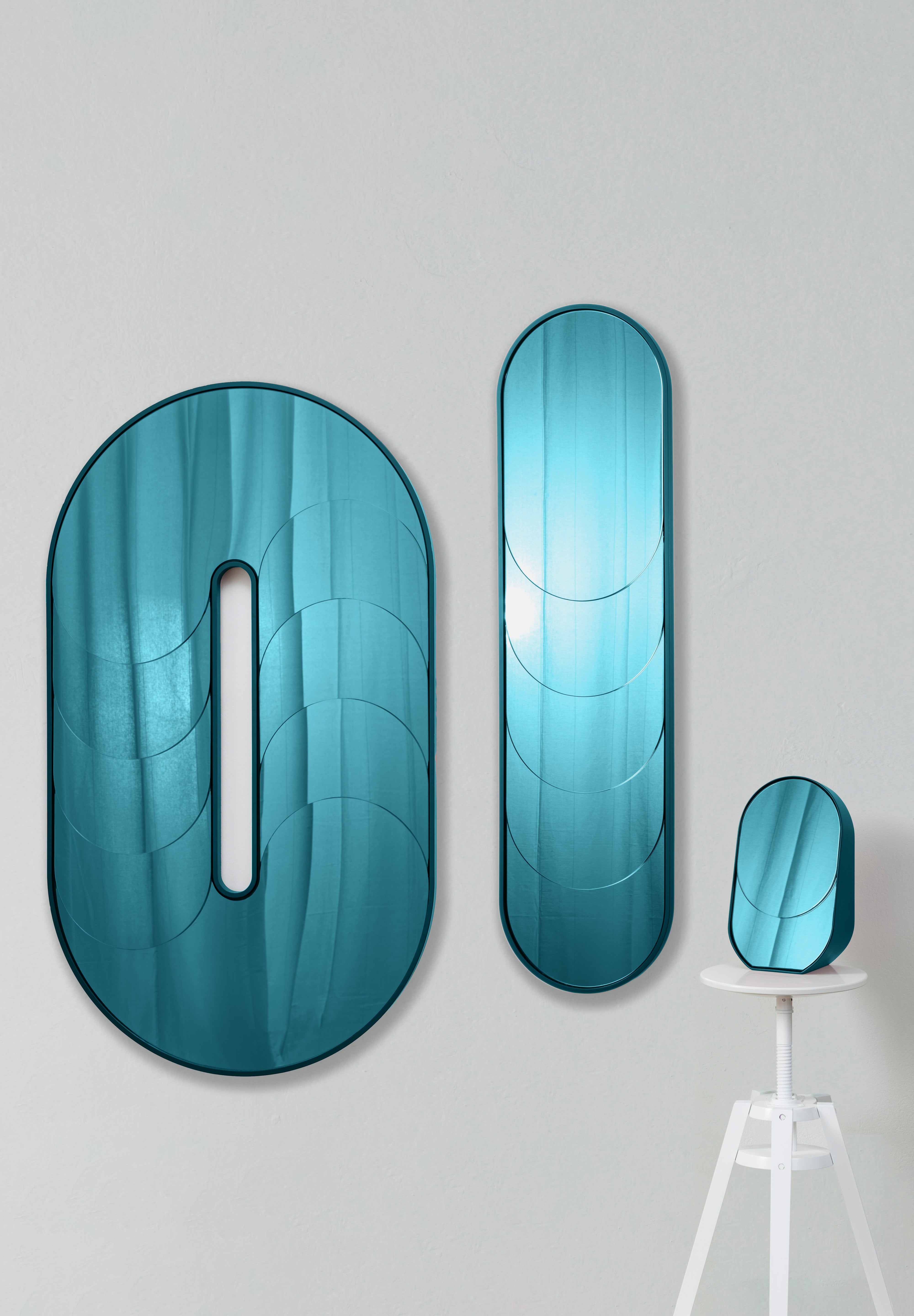 Baggage Claim – M is a round tabletop makeup mirror that combines functionality with artistic flair. Its unique sculptural form allows it to stand securely on any surface, making it both practical and visually striking. Framed in colored MDF and accented with overlapping vibrant slices of tinted mirror, it transforms an everyday object into a creative centerpiece.
