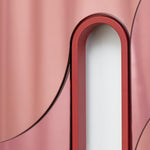 Baggage Claim – O is a round full-length mirror that combines functionality with artistic flair. Its unique sculptural design features overlapping vibrant slices of tinted mirror creating a loop around the frame in colored MDF, making it both practical and visually striking in any space. This design transforms an everyday object into a creative centerpiece.
