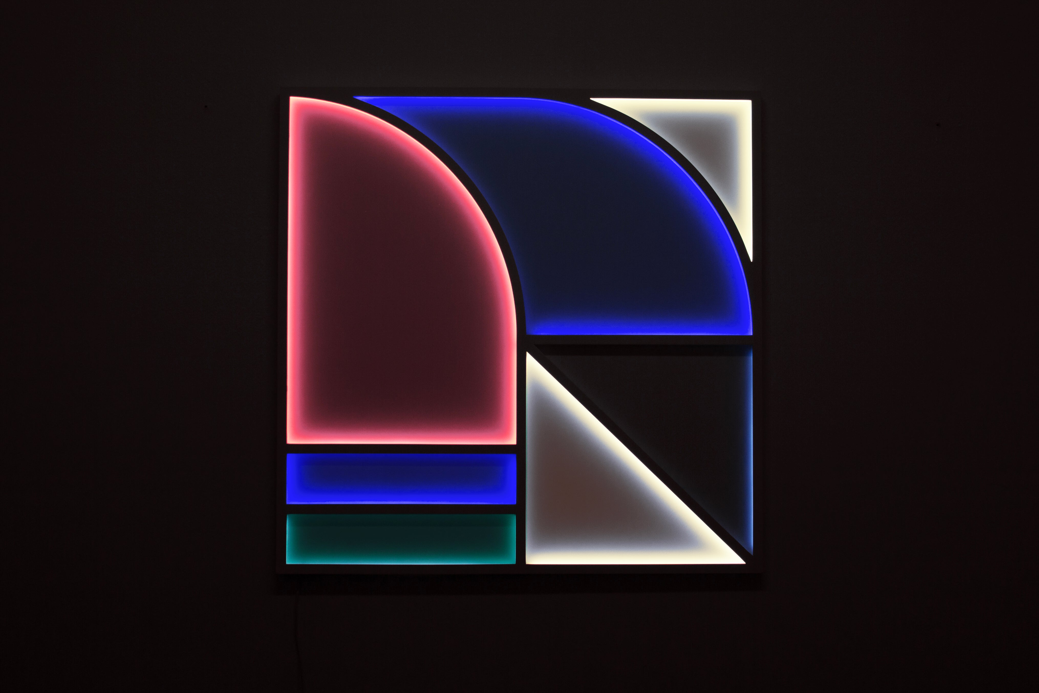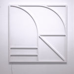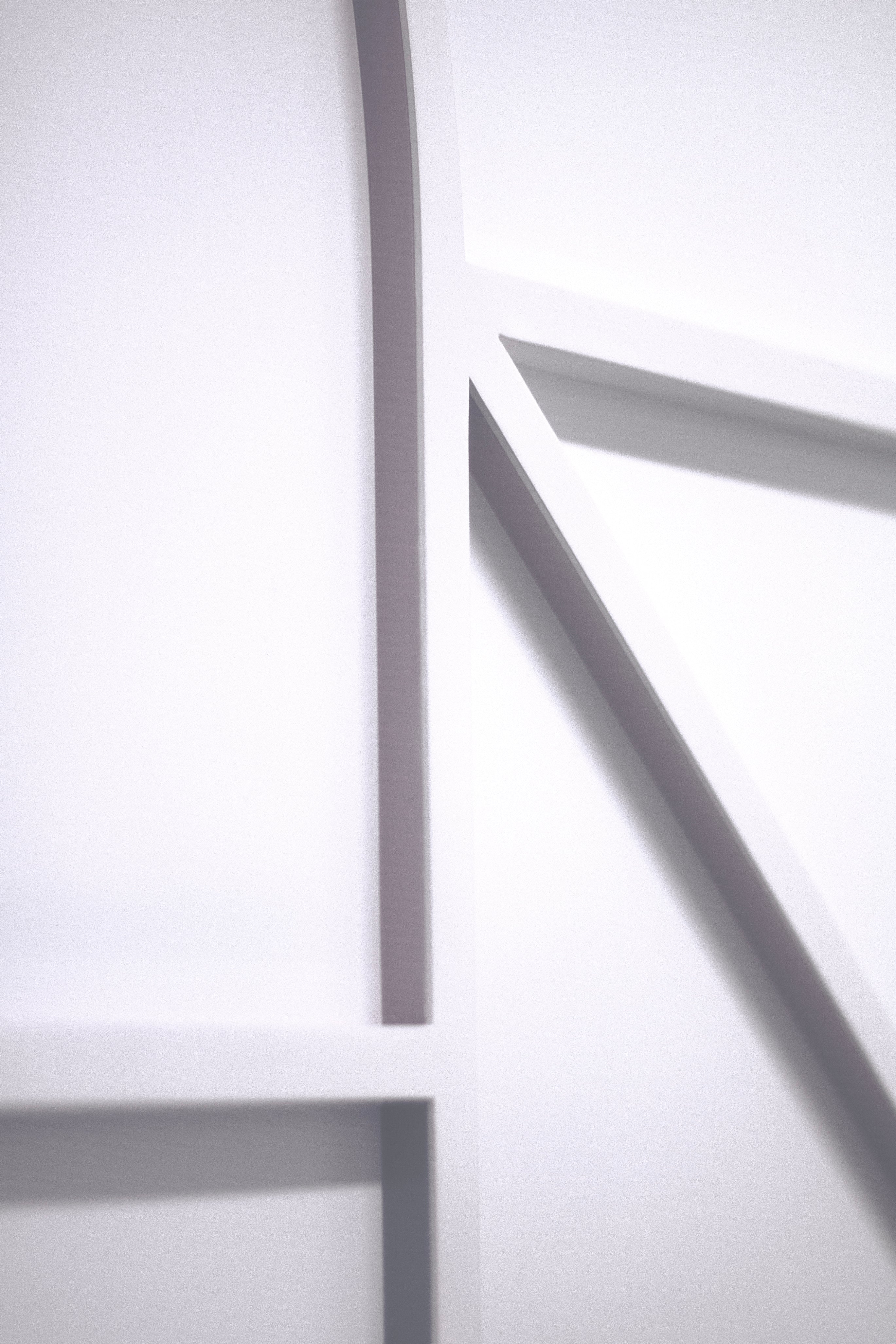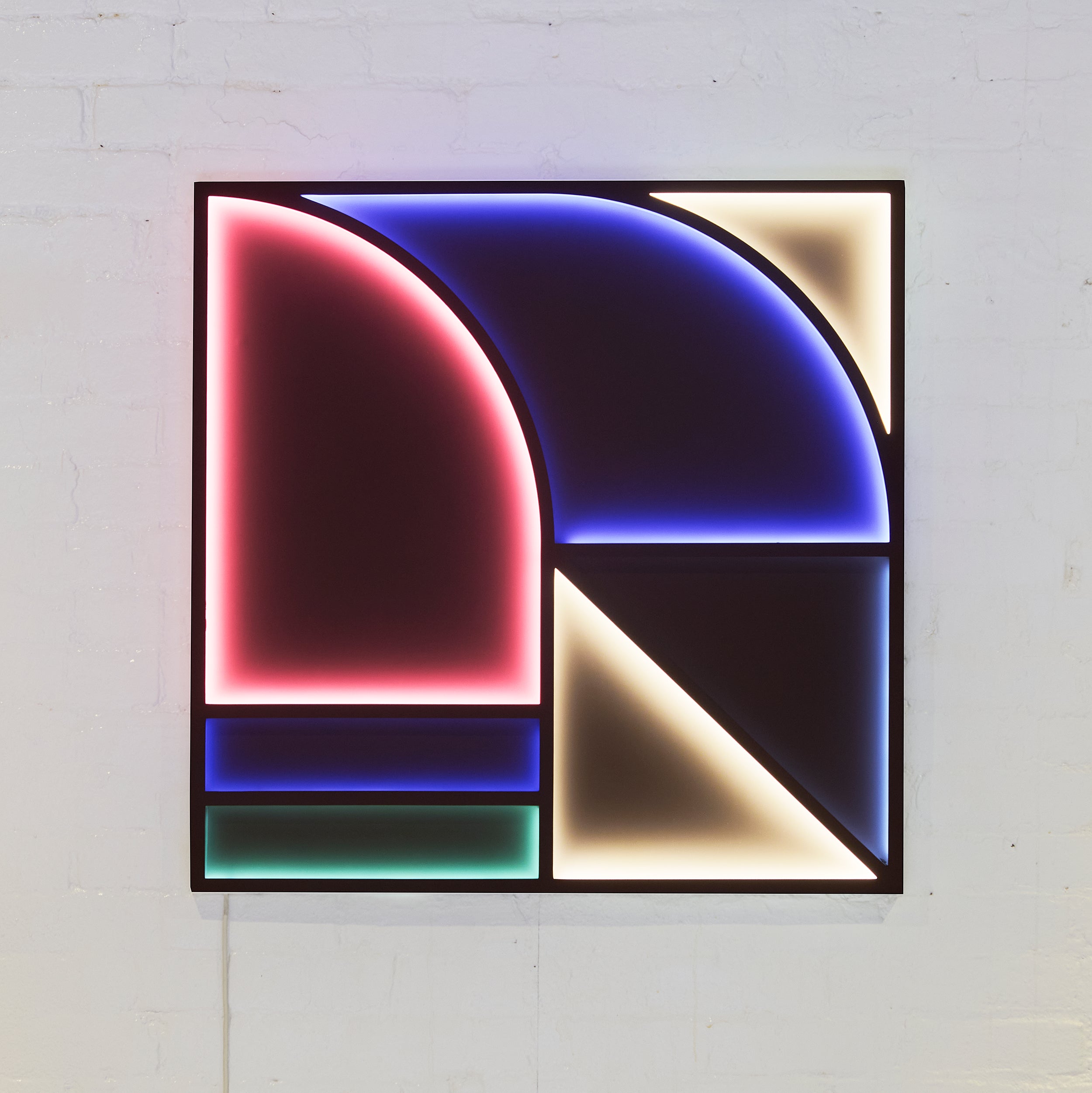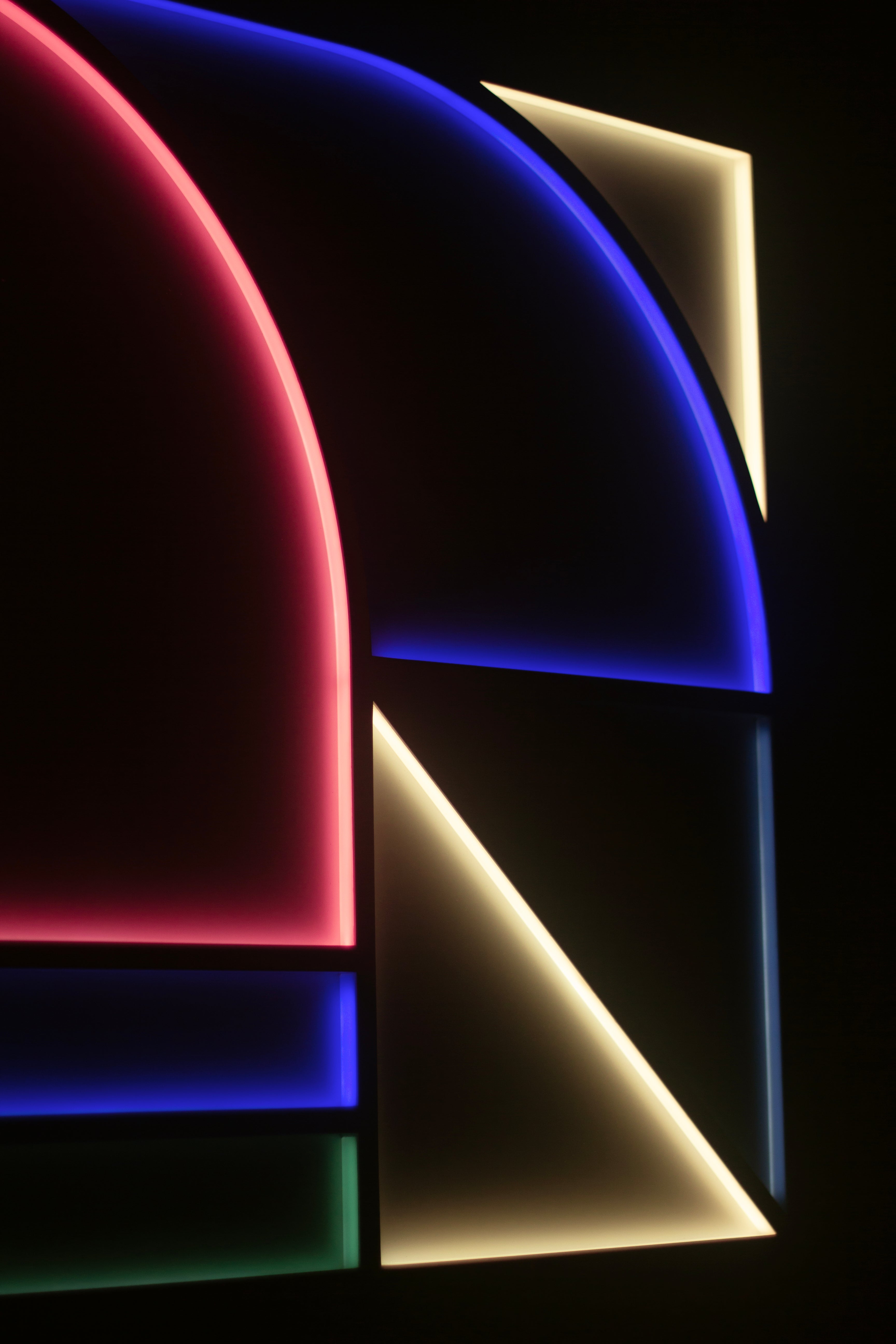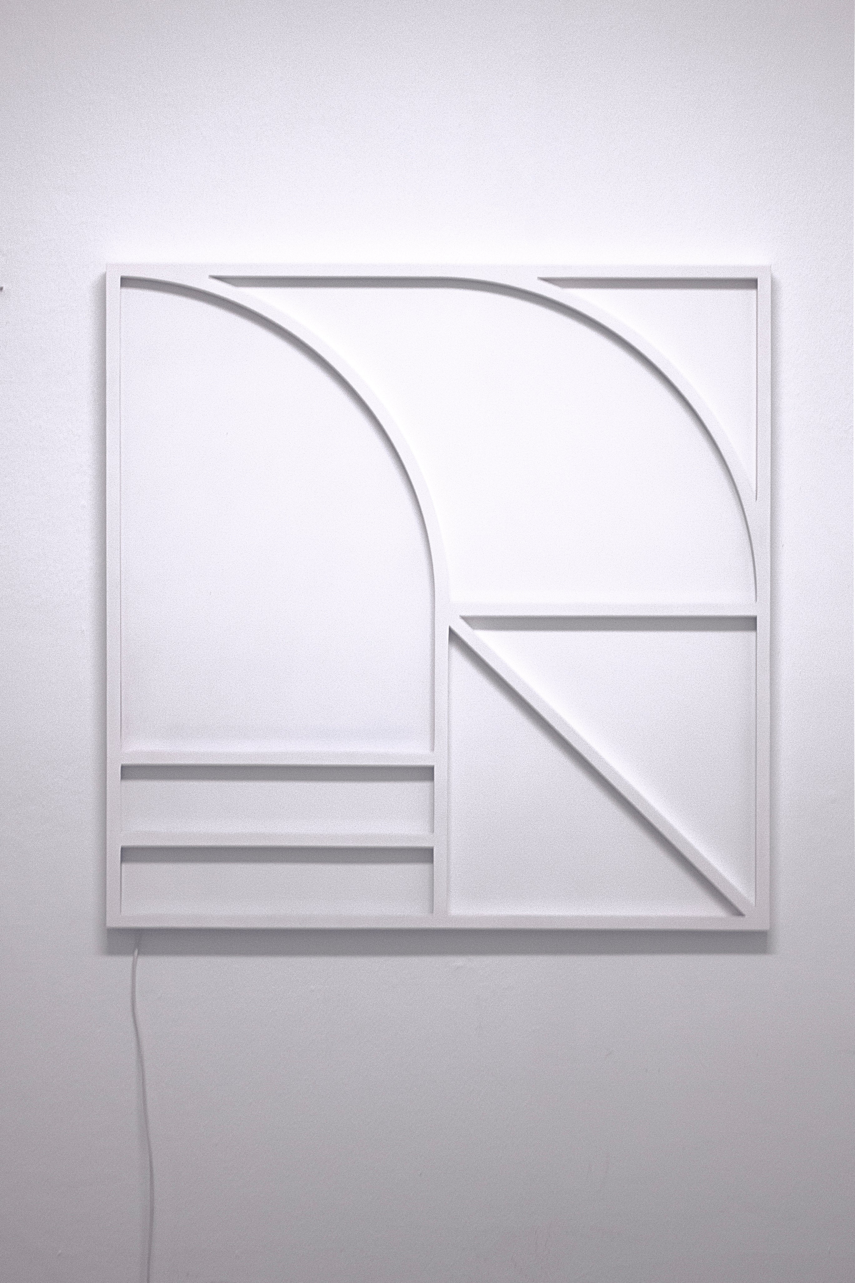 It's a white sculpture divided into 7 different areas. Each area has a colored perimeter that "paints" the area with colored light. The structure is made from wood and it has a lacquered finish.