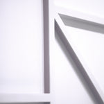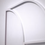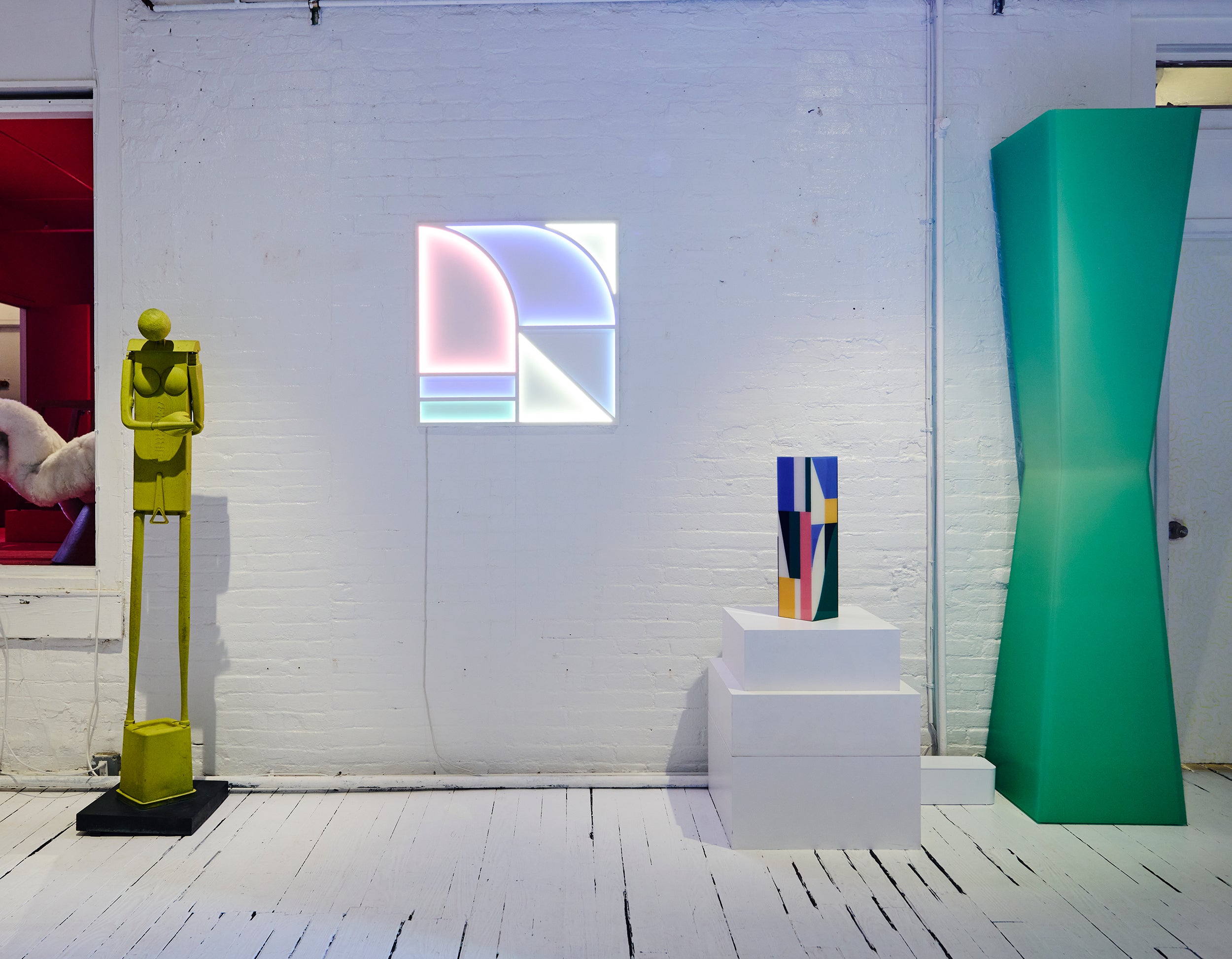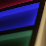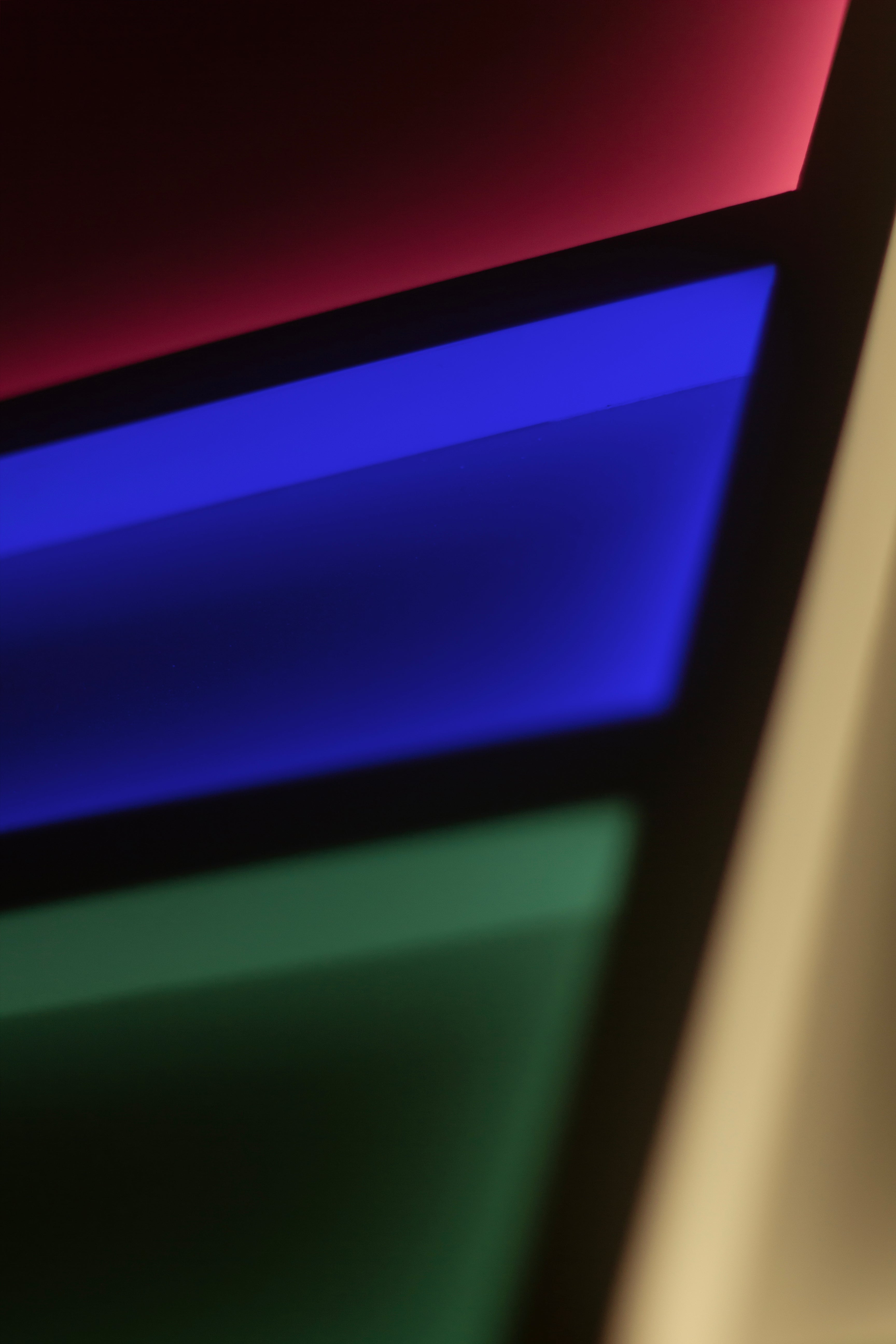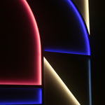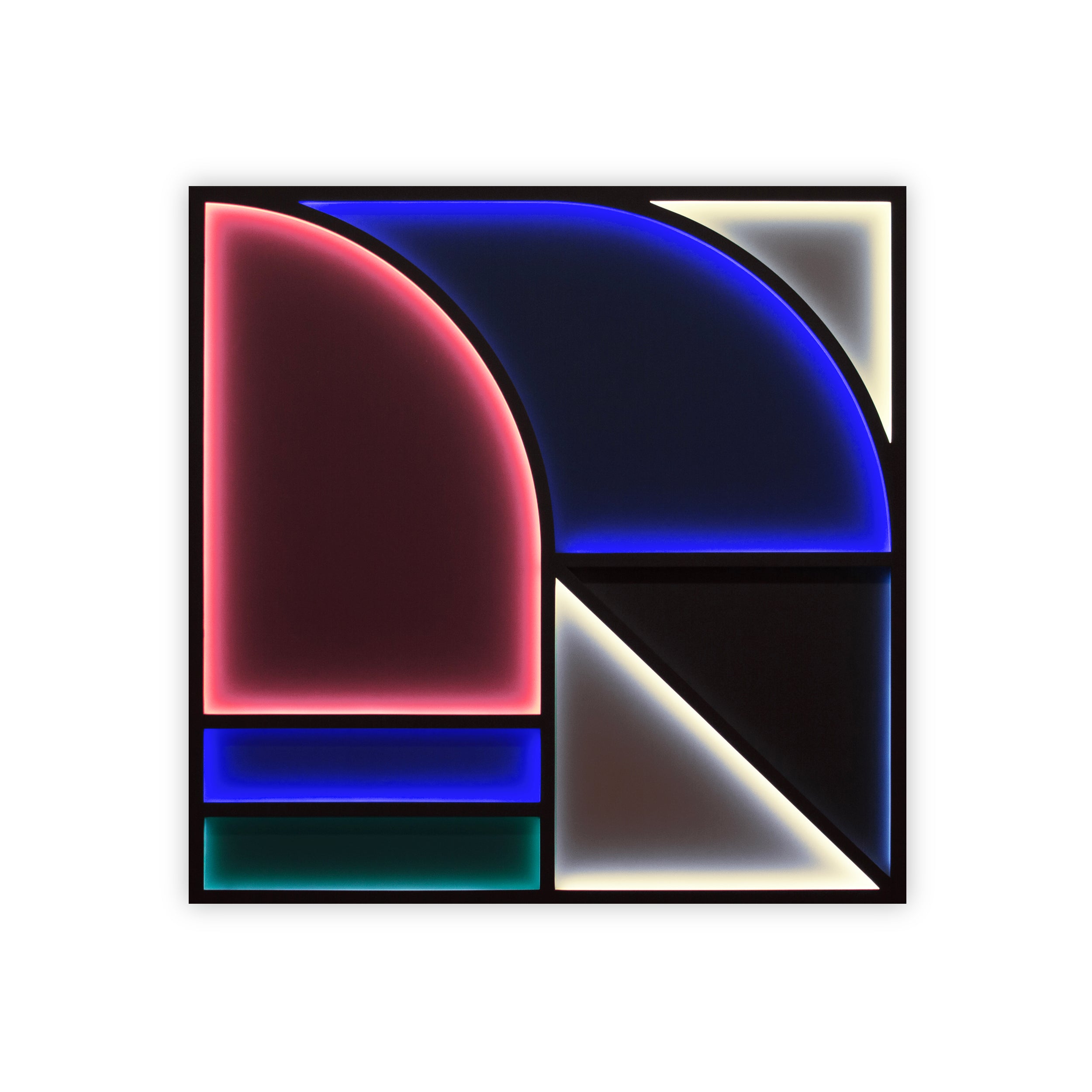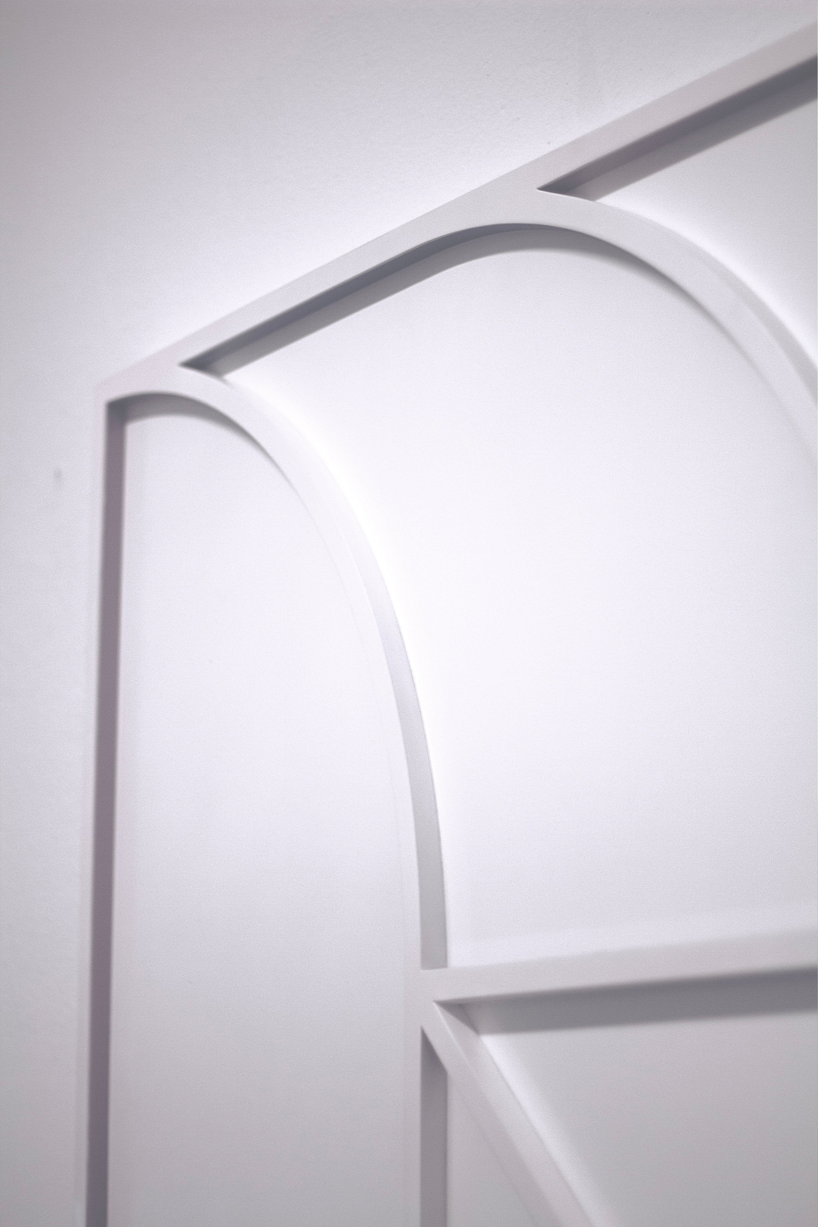 It's a white sculpture divided into 7 different areas. Each area has a colored perimeter that "paints" the area with colored light. The structure is made from wood and it has a lacquered finish.