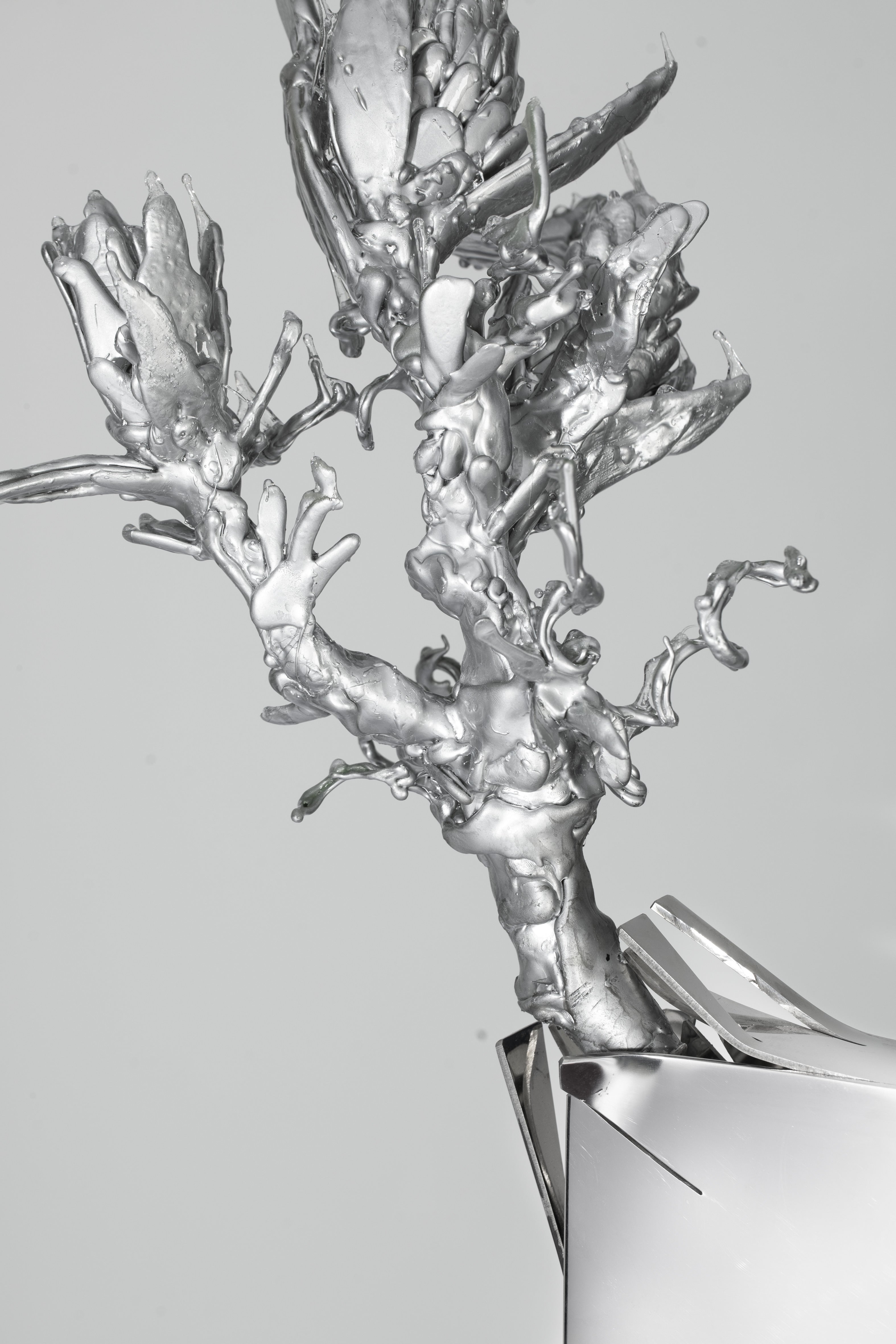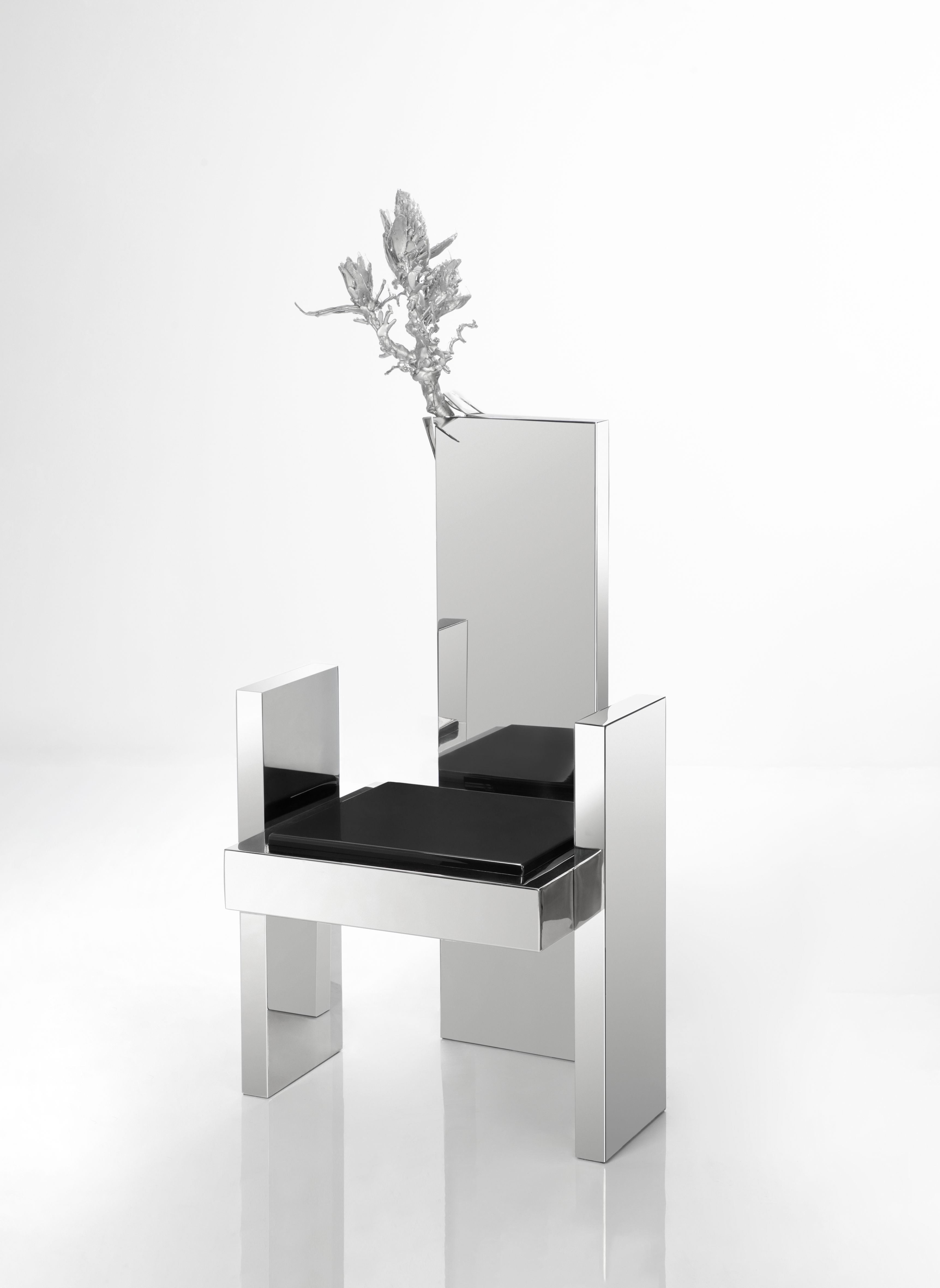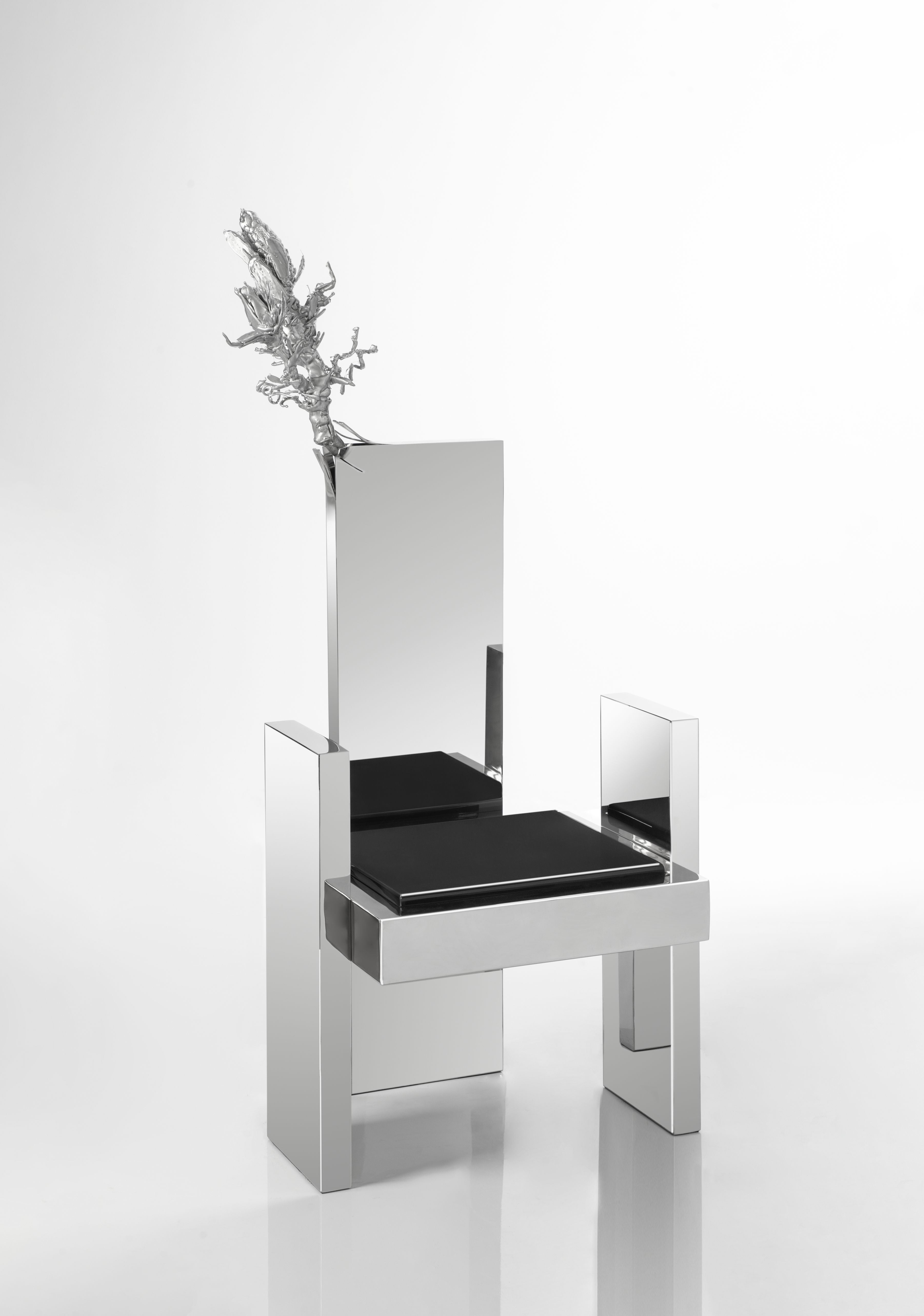 Chair in stainless steel, wood lacquer with an explosive plastic resin sculpture painted in chrome.