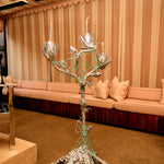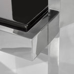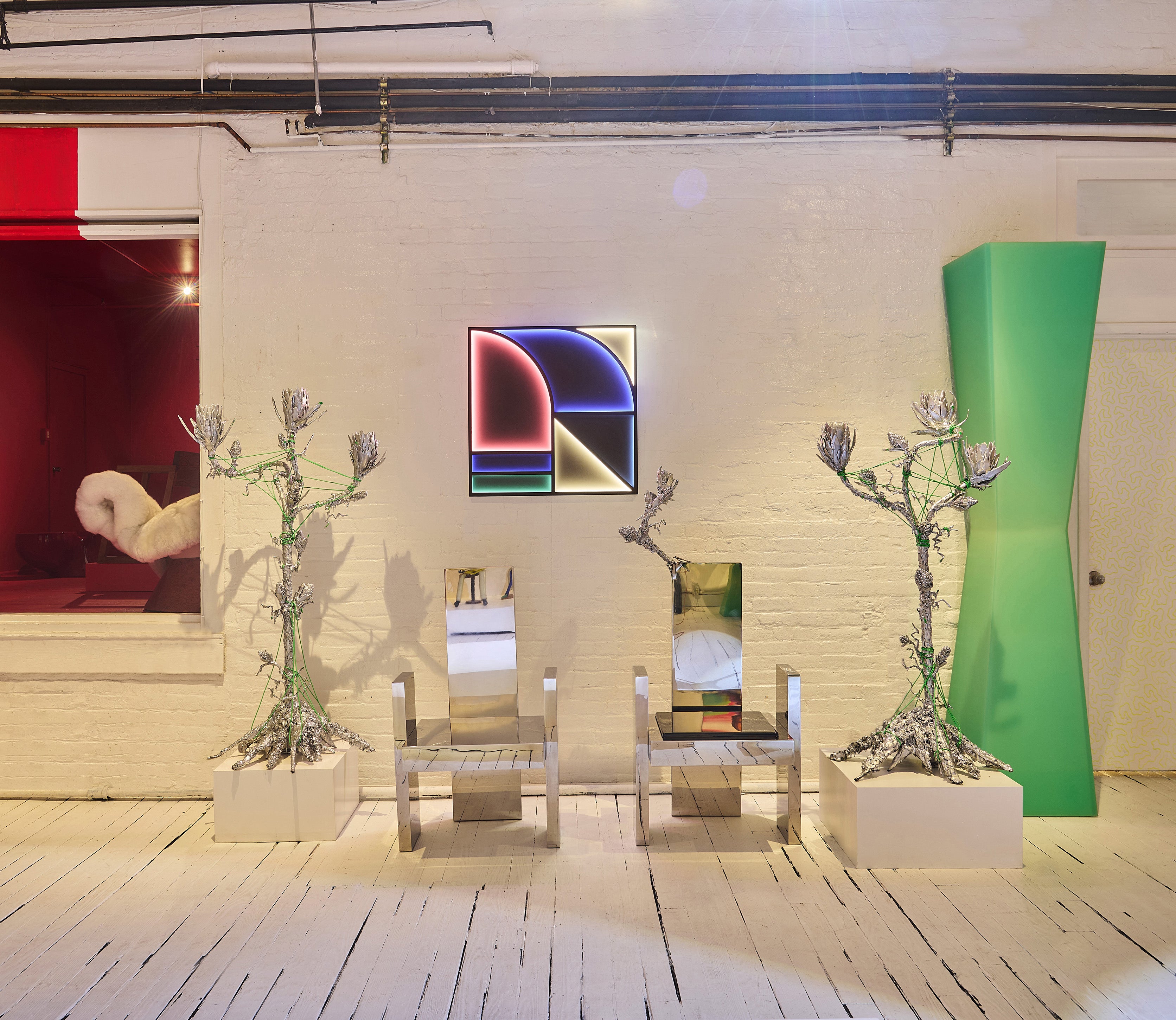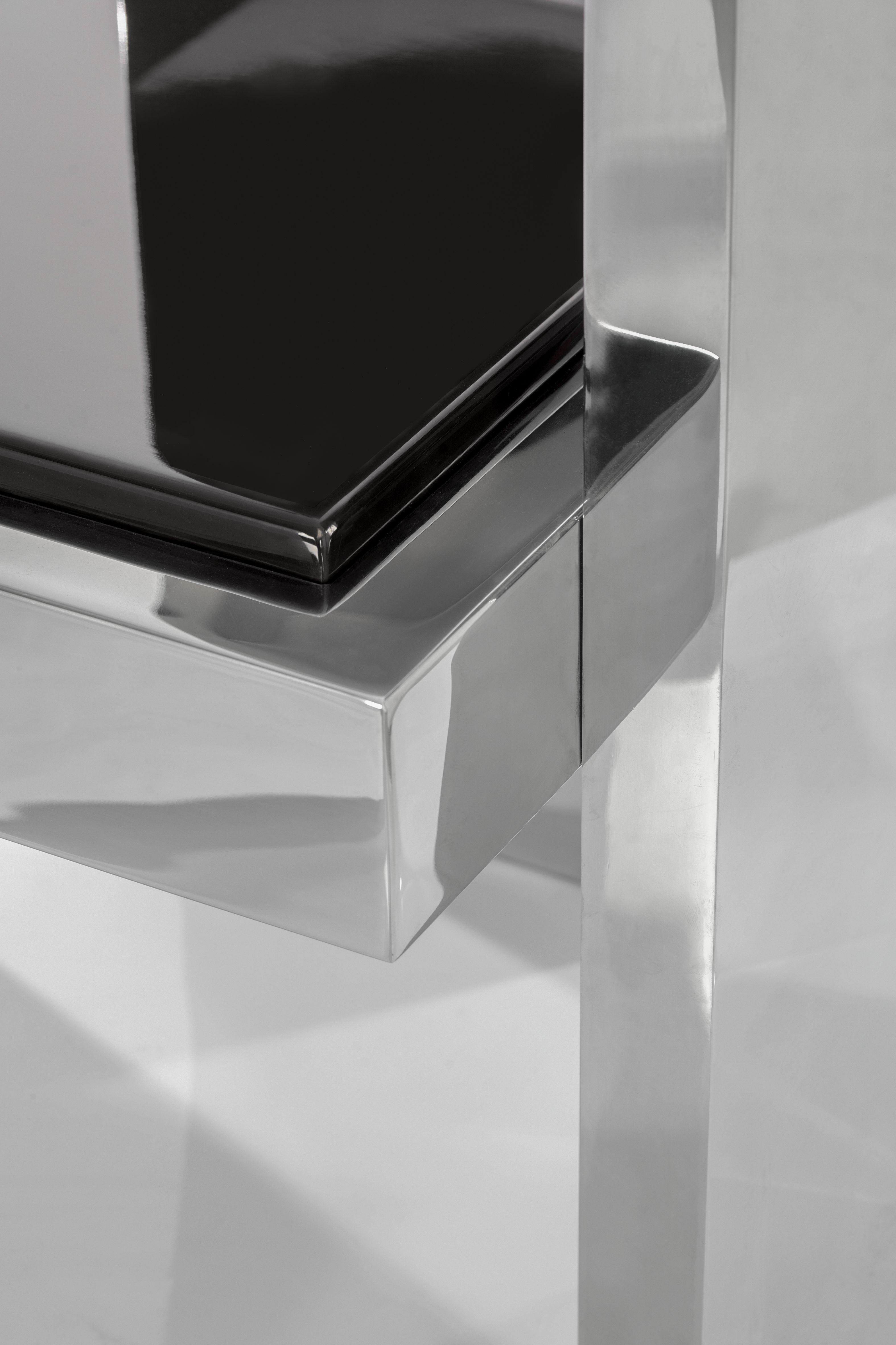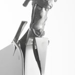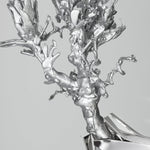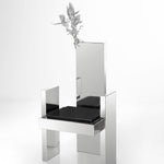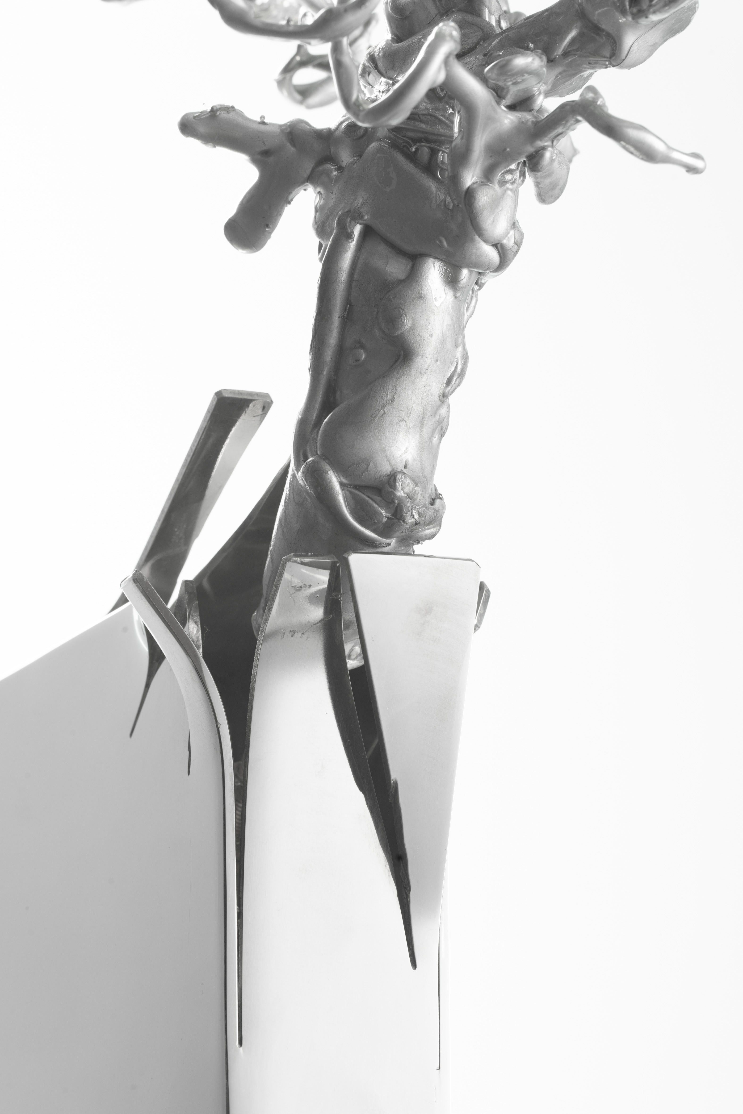 Chair in stainless steel, wood lacquer with an explosive plastic resin sculpture painted in chrome.
