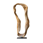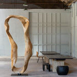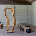 A graceful sculpture carved from aged wood with a steel base. This piece offers a bold yet airy presence.