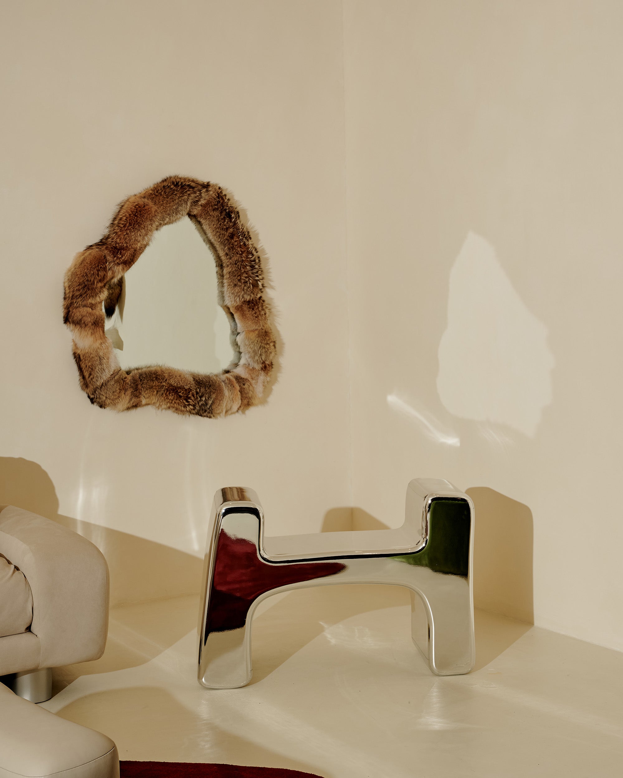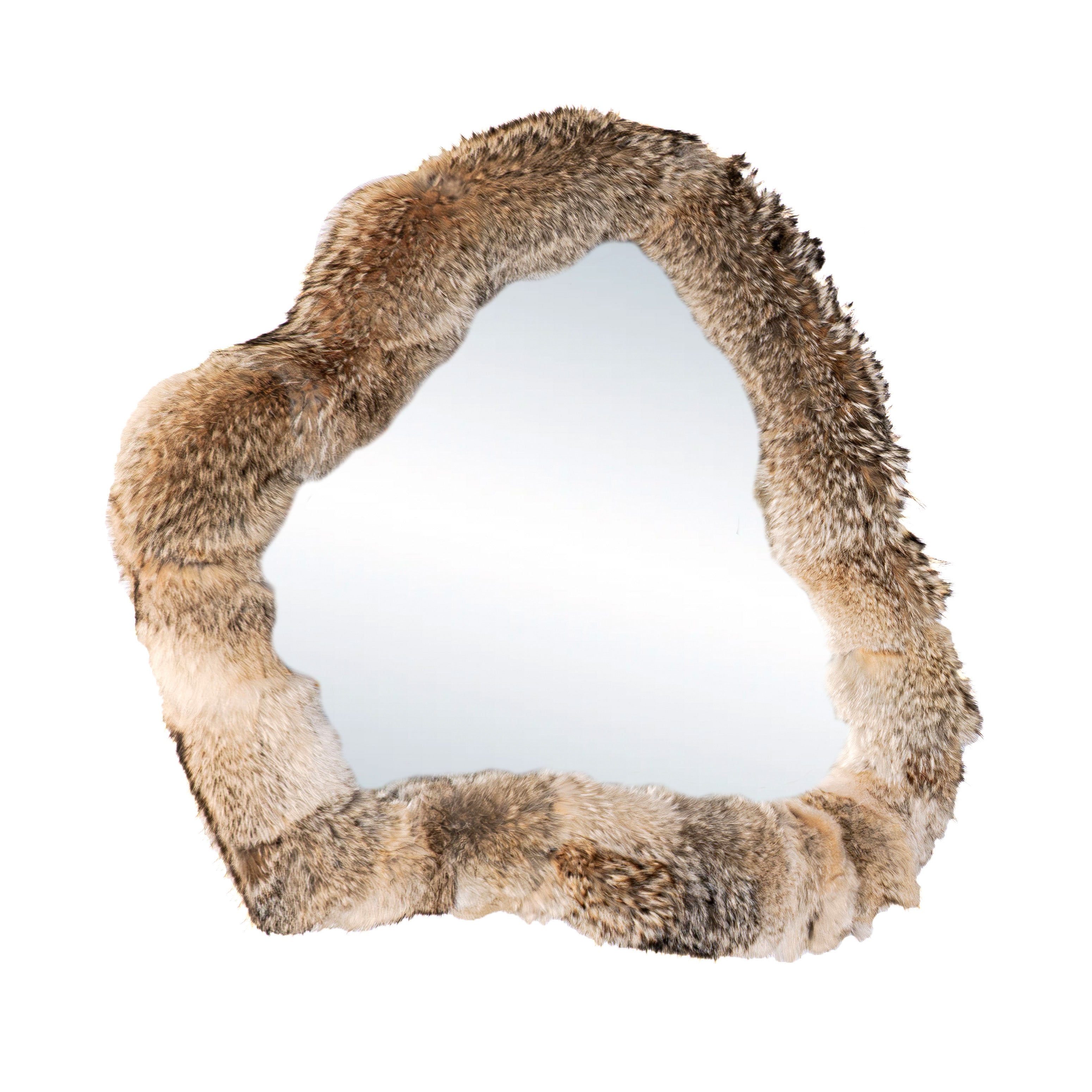 A reflective sculpture framed in wild softness. This irregular mirror is surrounded by a thick border upholstered in ethically sourced coyote fur, blending natural texture with organic contour. It turns reflection into an experience - raw, tactile, and emotional. bringing an element of untamed nature to the sanctuary of the home.