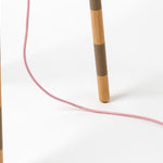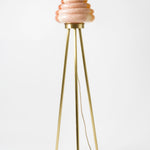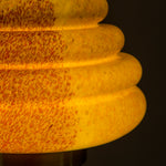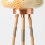 This beehive inspired floor lamp comprises a mixed colored hand-blown glass shade and different combinations of wood veneer legs and copper. Second version of Colmena has the dotted patterned glass shade and matte brass legs. The light is adjustable by the dimmer. Each piece is unique and custom made.