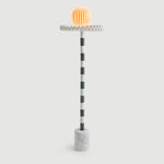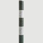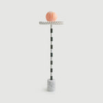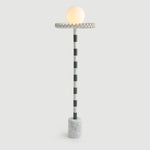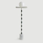 “Sare” is a floor lamp inspired by the 17th Century ruff collar which was a symbol of wealth and status. It also resembles the silent clown “Pierrot” with it’s striped marble body and round glass head. Sare is handcrafted and assembled with different colors of marble stem connecting the top part with the cylindrical marble block base. A pearl colored polyurethane piece connects the body and the milk glass top. The spherical glass head piece comes in a simple milk glass and in a blue and a red hand-painted striped glass. Sare is a reflection of our inner noble clown.