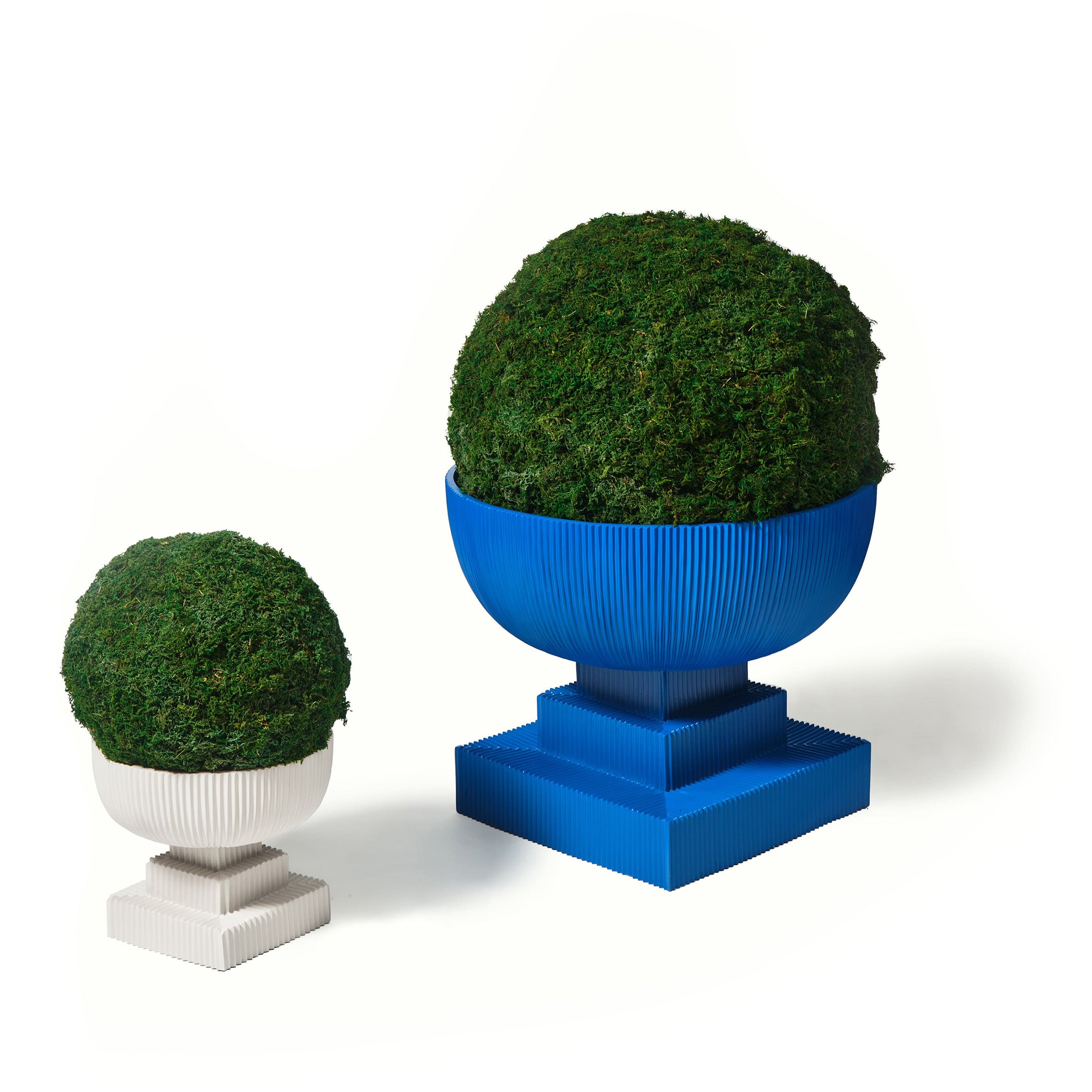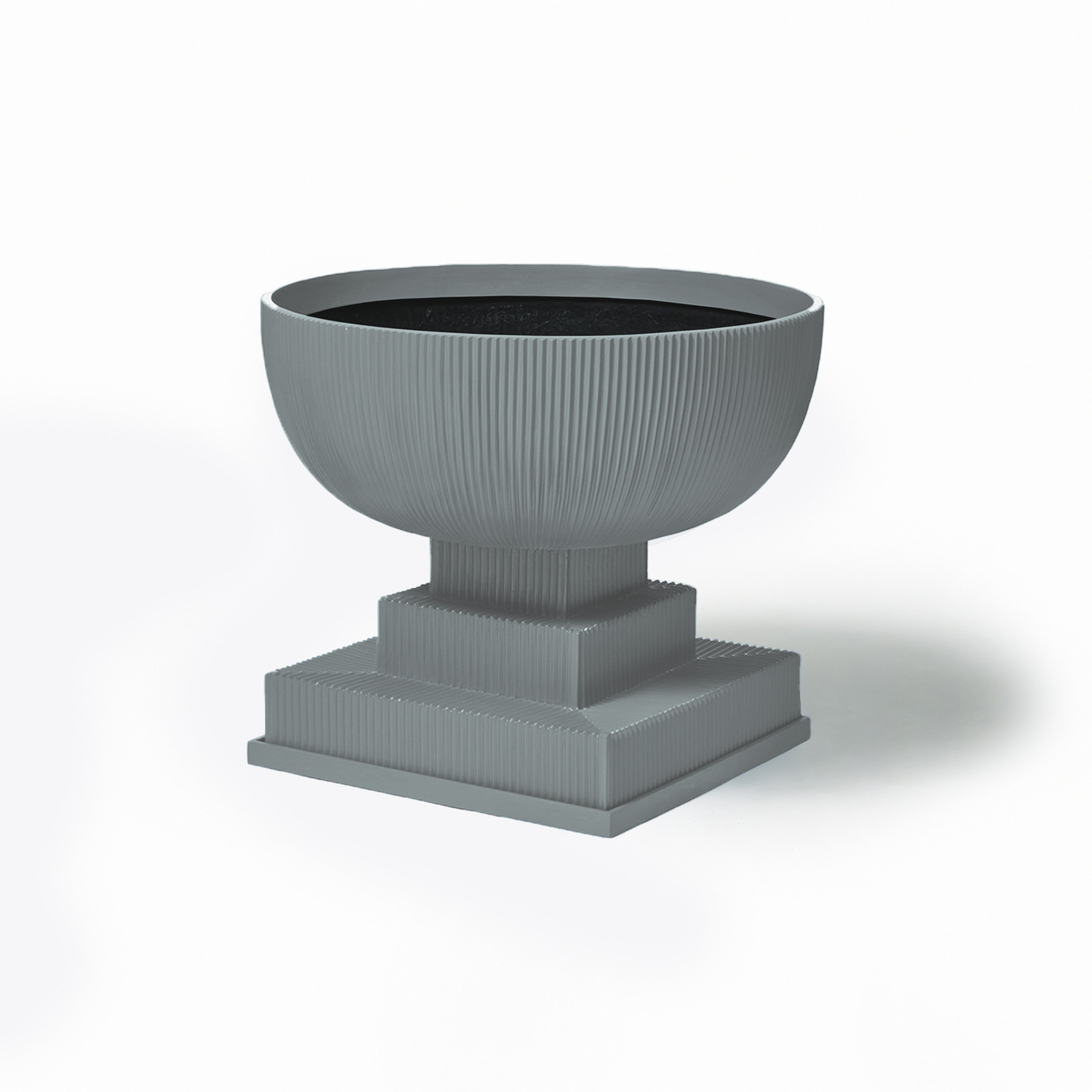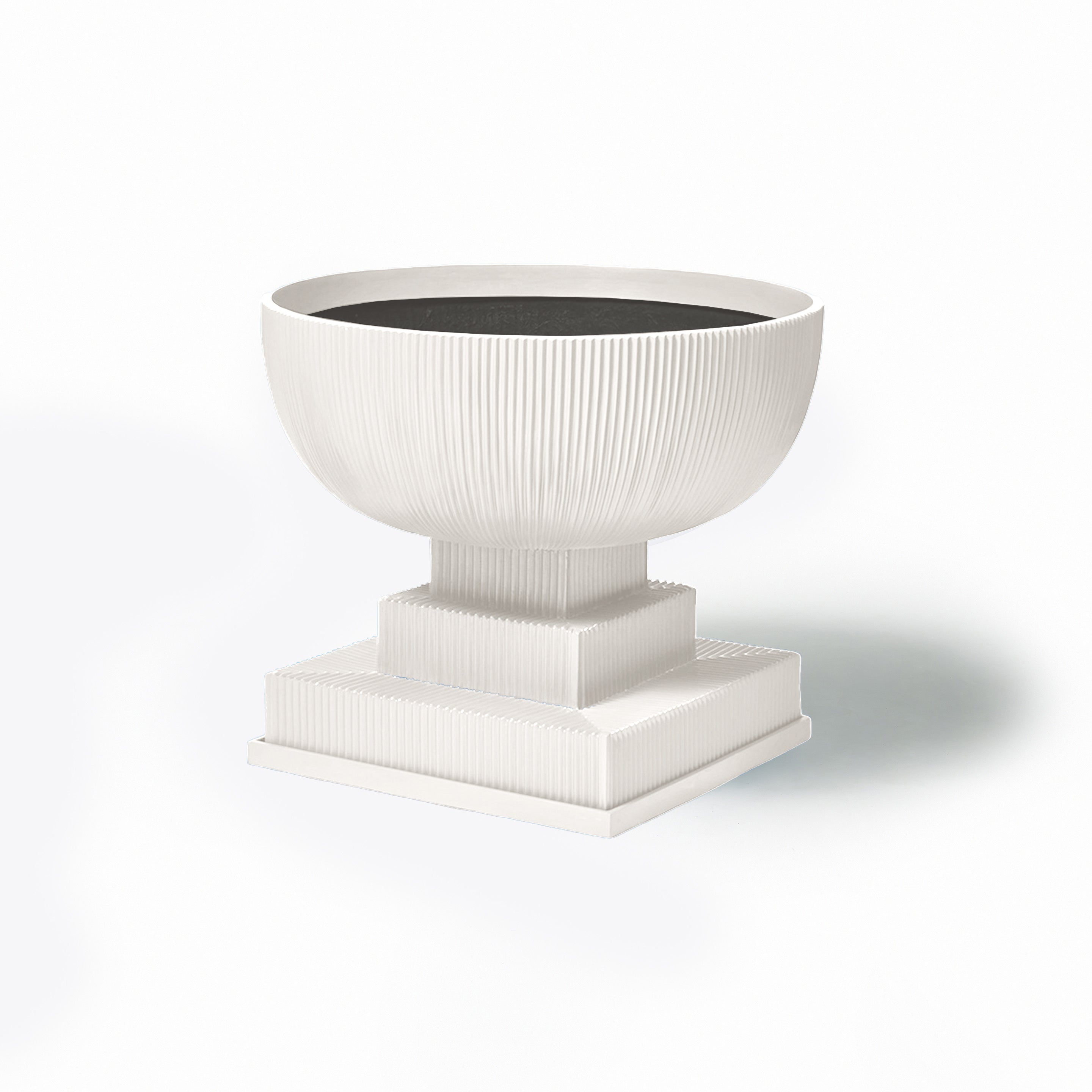 The Oversized Modern Urn is a round planter with fluted detail and tiered stacked base. All designs are hand crafted in Mexico and suitable for both indoor/outdoor use. Each planter contains drainage and comes with a matching fiberglass drainage tray. The collection comes in five colors and custom colors are available upon request.