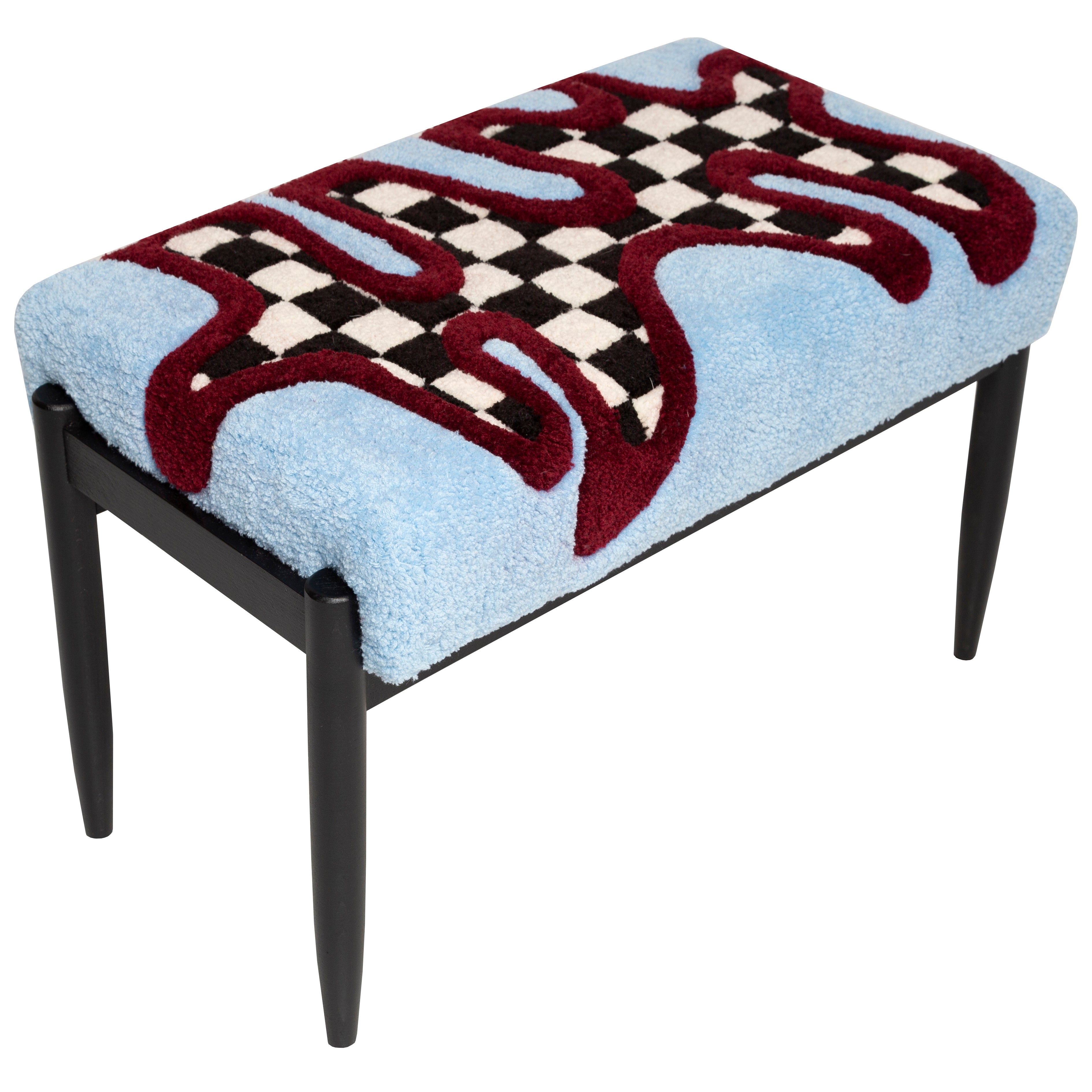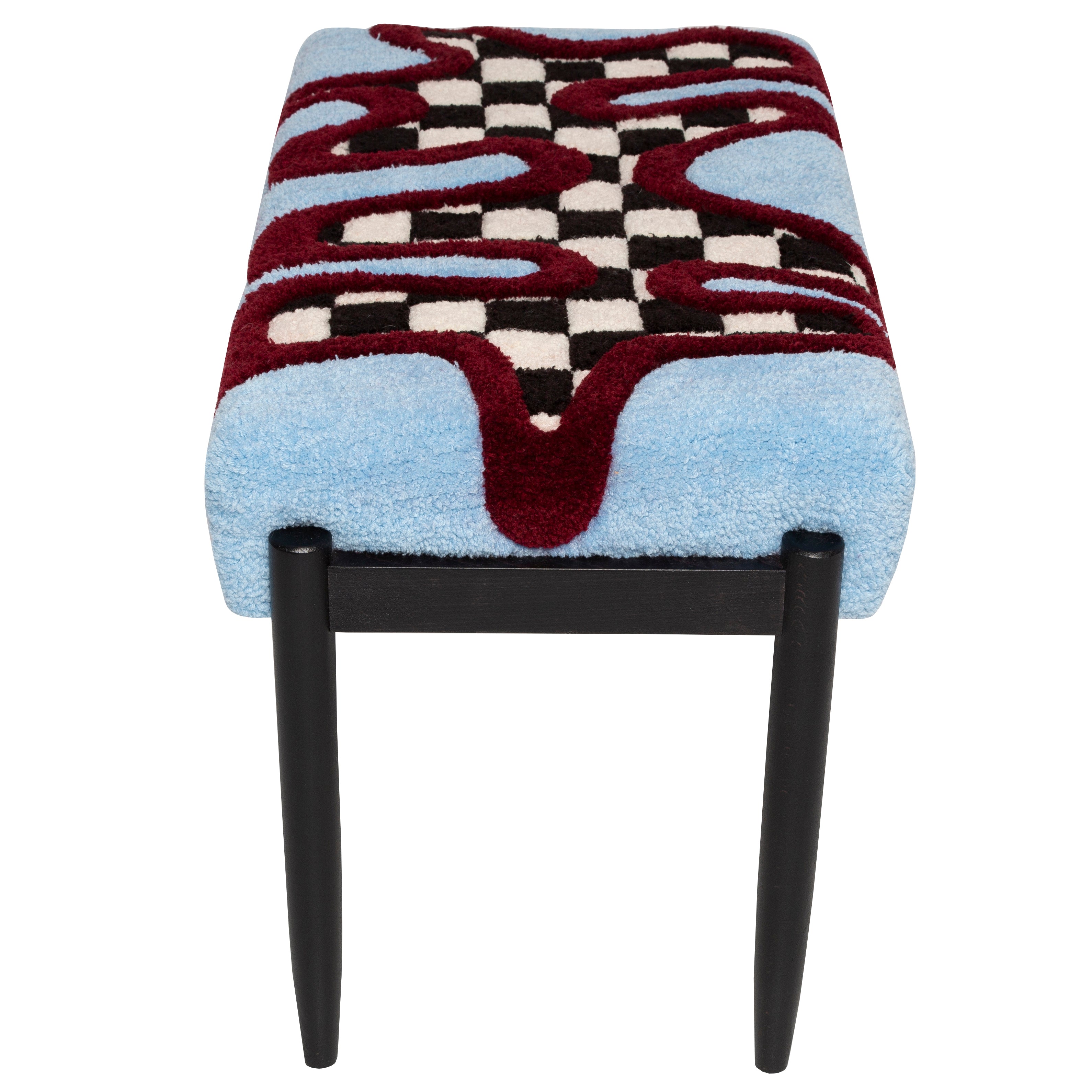 A contemporary bench inspired by 1960s design, featuring a hand-tufted multicolor wool seat and tapered wooden legs. Each piece is uniquely handmade, offering both comfort and decorative appeal.