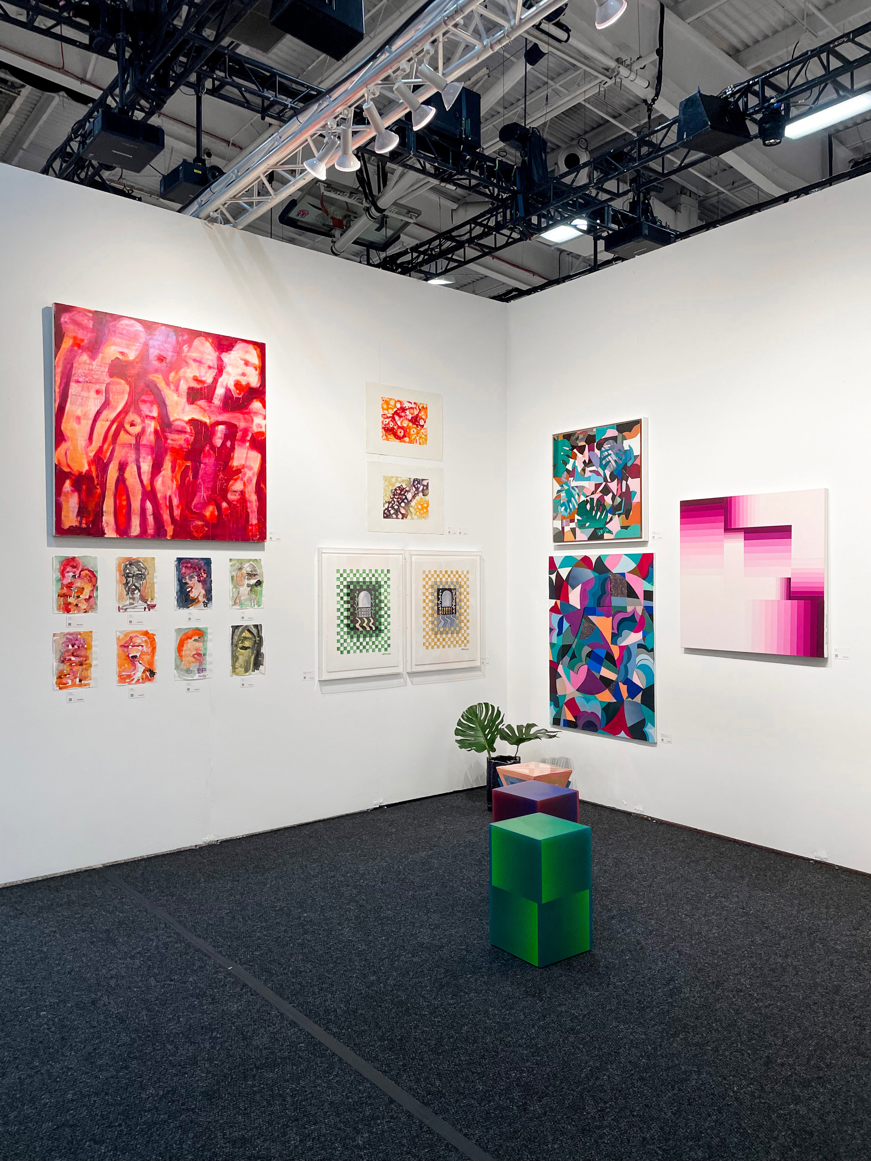 Fisher explores a more abstract style of painting in Big Red #3, using a mix of textures, hues of red, and negative space to reveal human bodies in the composition.