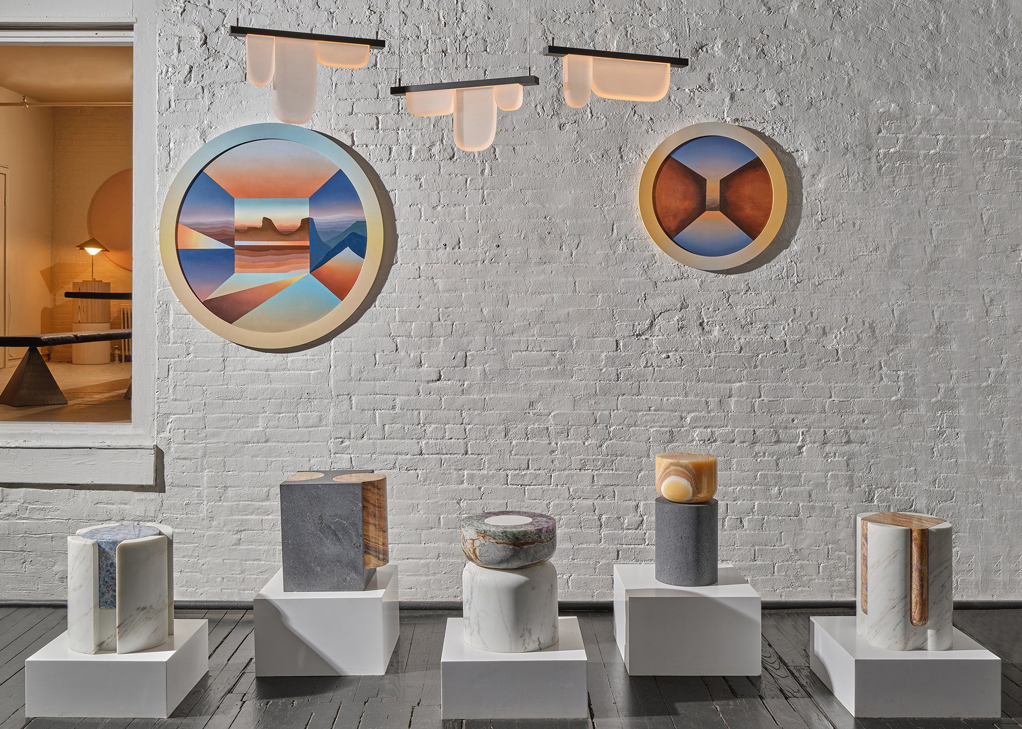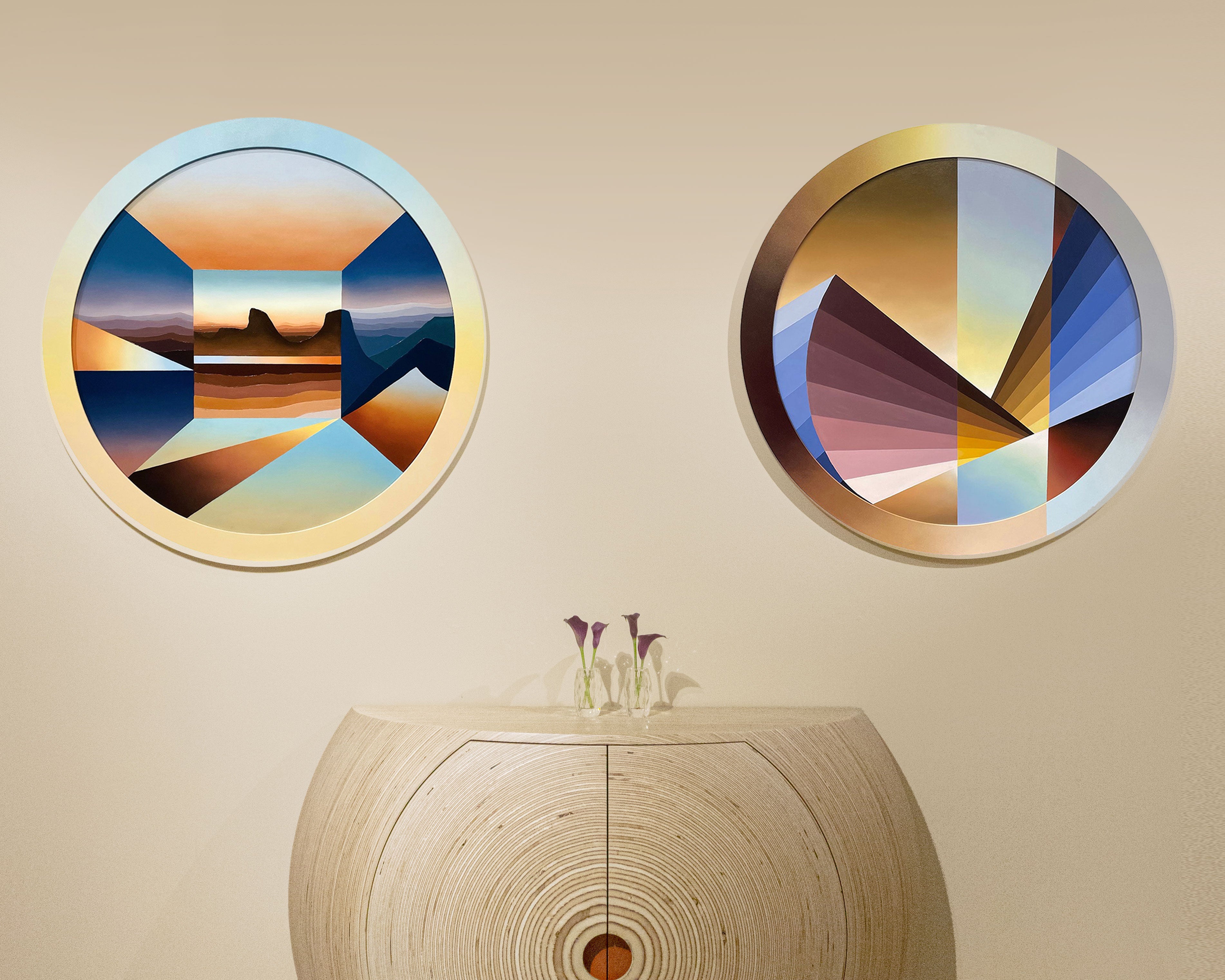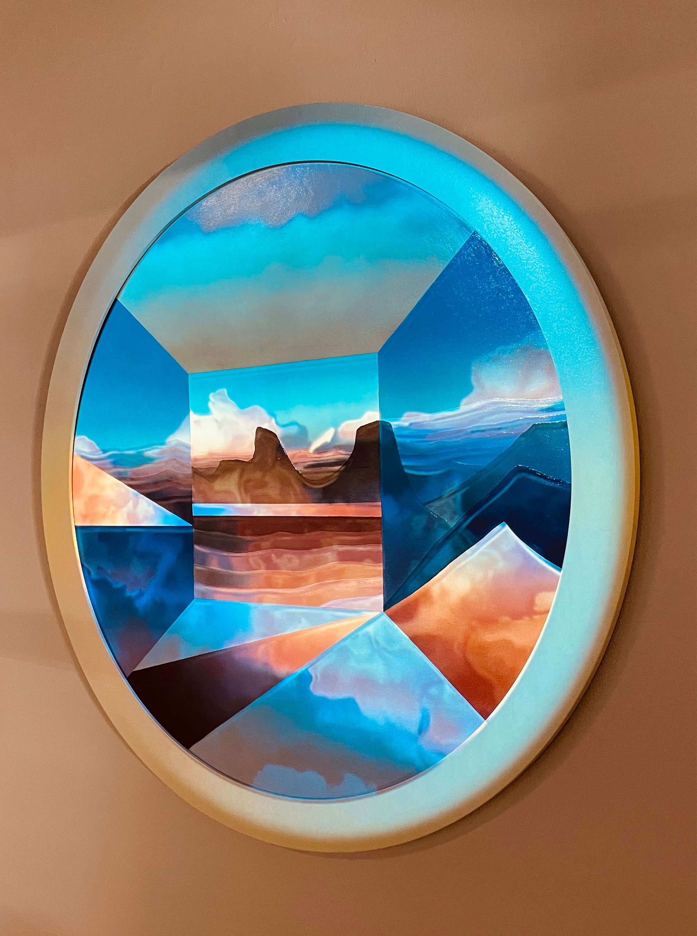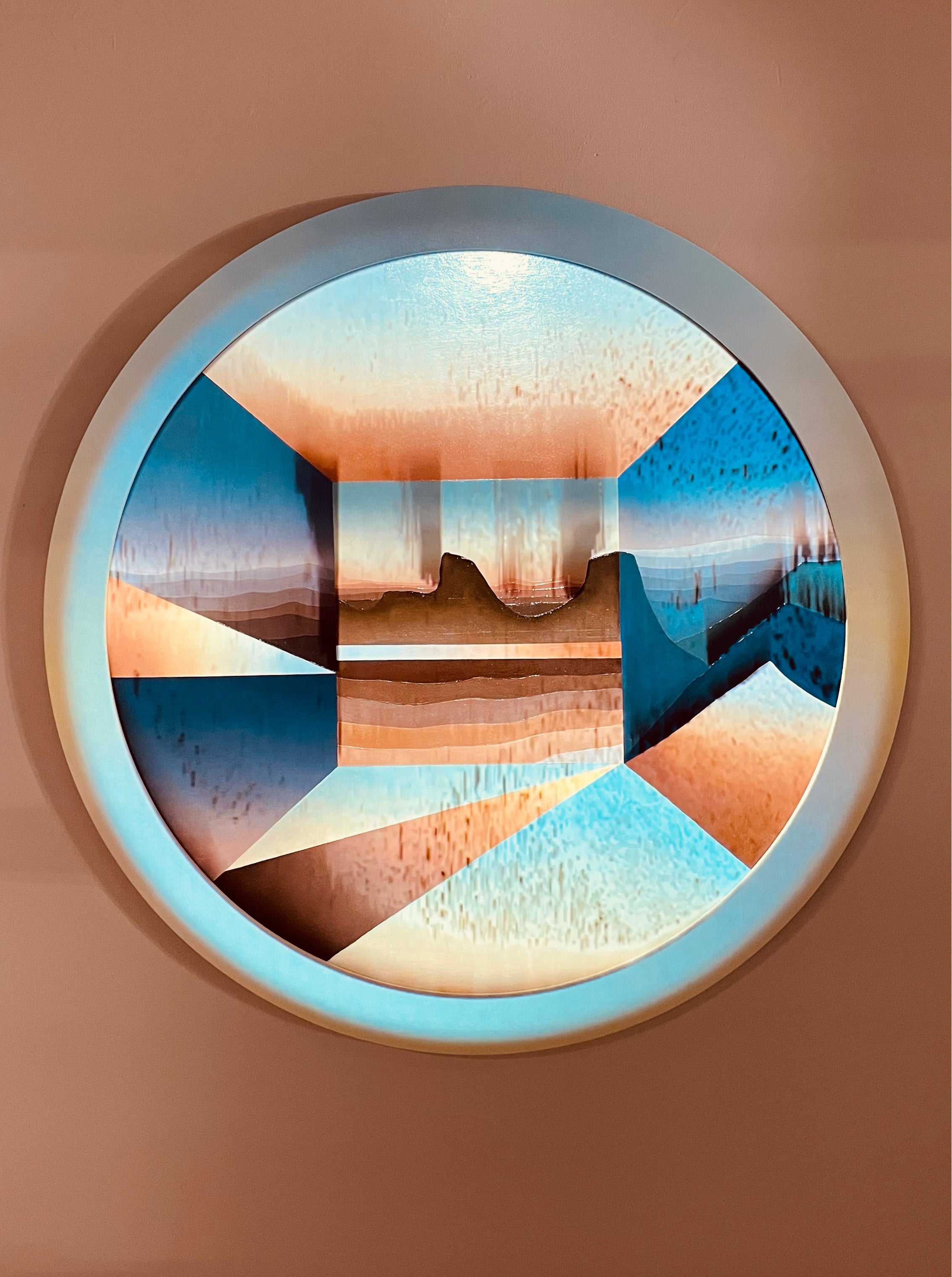 Pissaro's Mindscapes are a series of mixed media works that combine oil painting on a round canvas with a light art projection element. Fractured Illusions within Mental Projections represents a landscape refracted as if through different coloured lenses.