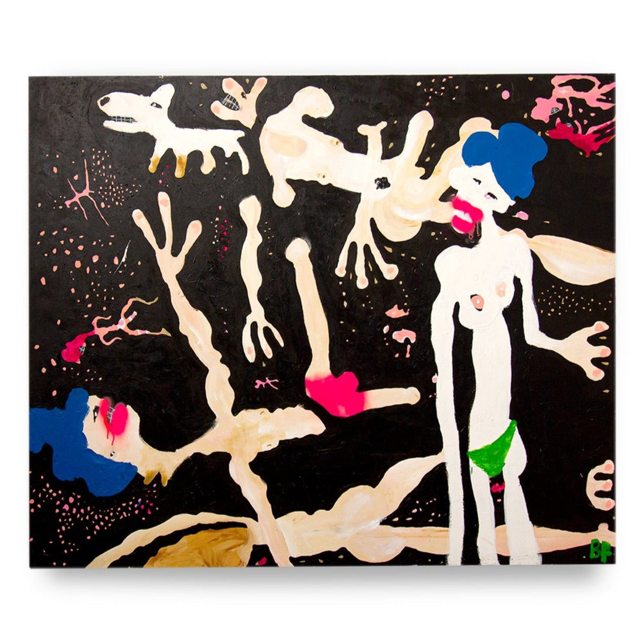 Brad Fisher explores sexuality and the human form in Green Bikini #3. The piece plays with neon colors and spray paint drips that pop on the black background.