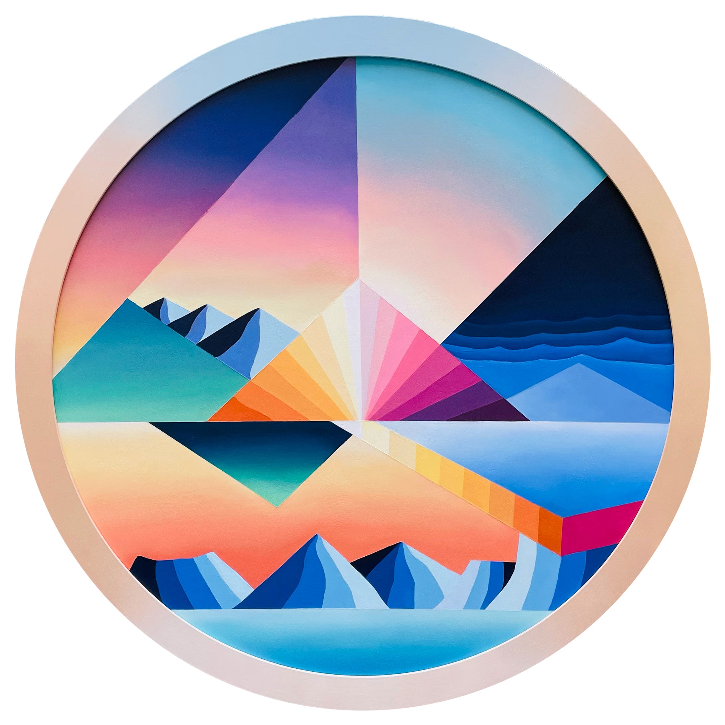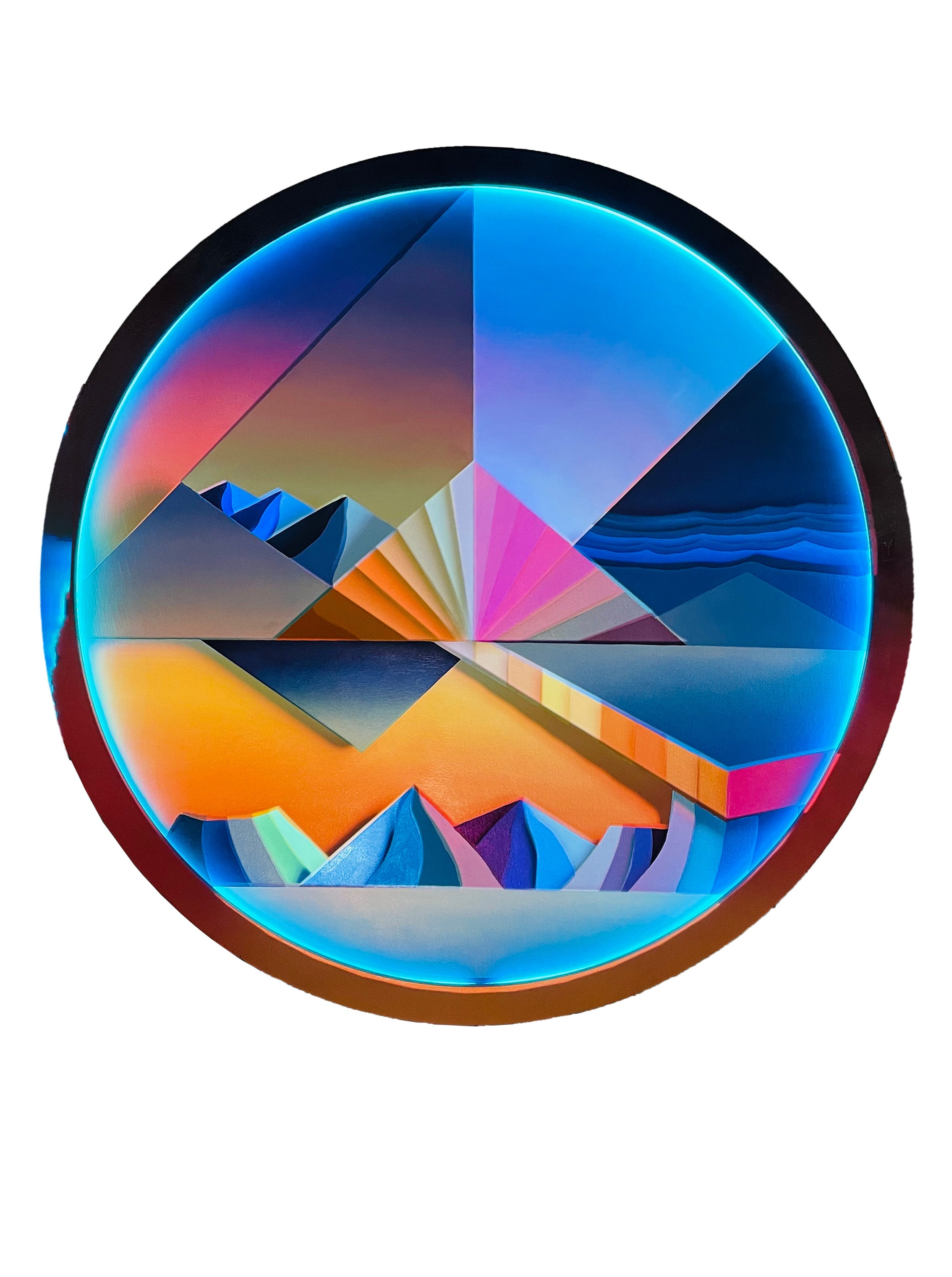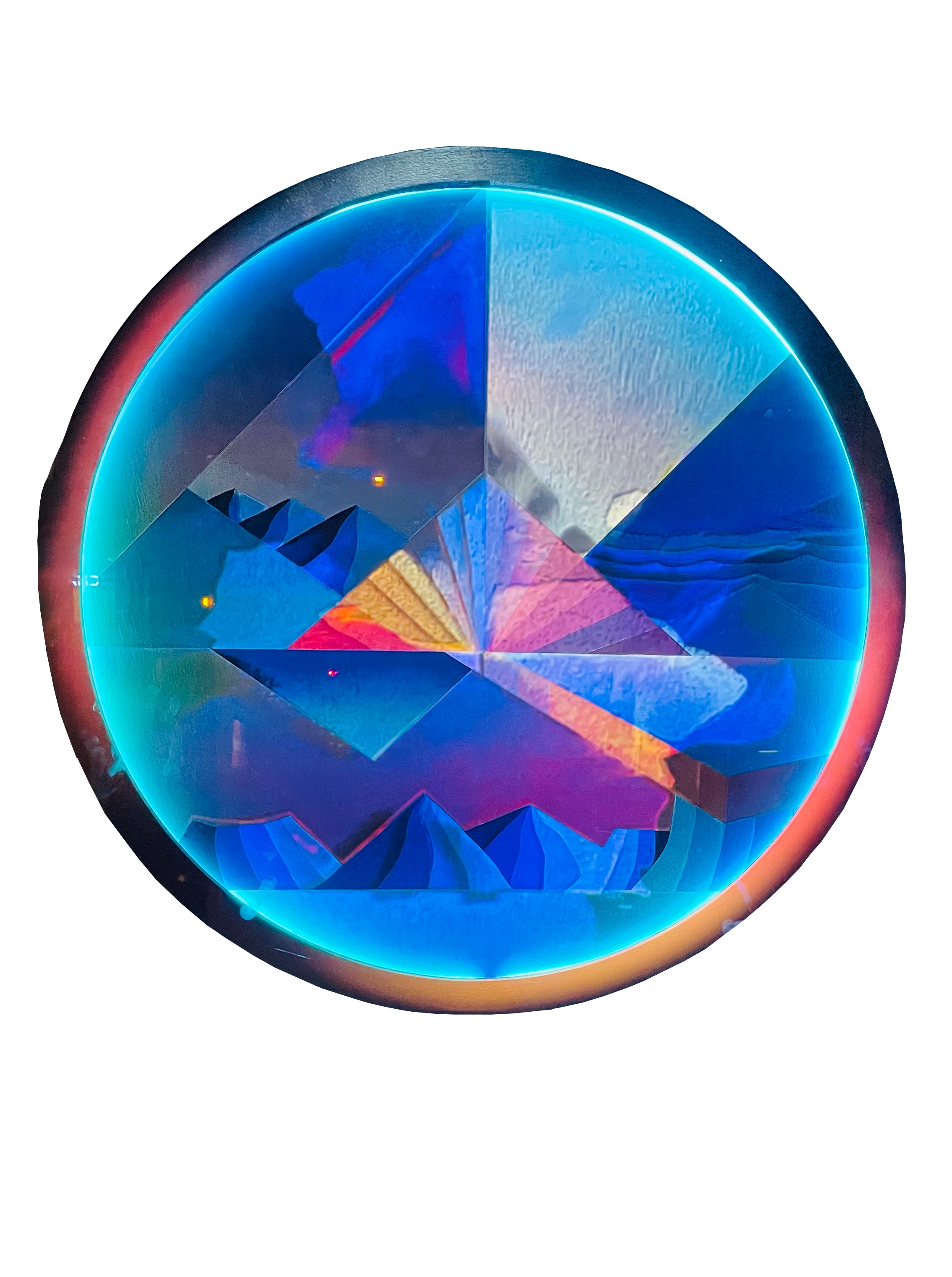 Pissaro's Mindscapes are a series of mixed media works that combine oil painting on a round canvas with a light art projection element. The Orientation of Grounding in Time and Space's tumultuous composition makes the viewer question what is up or down, what is day or night. The painting works in all orientations.